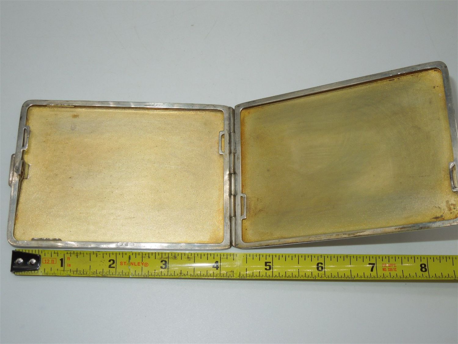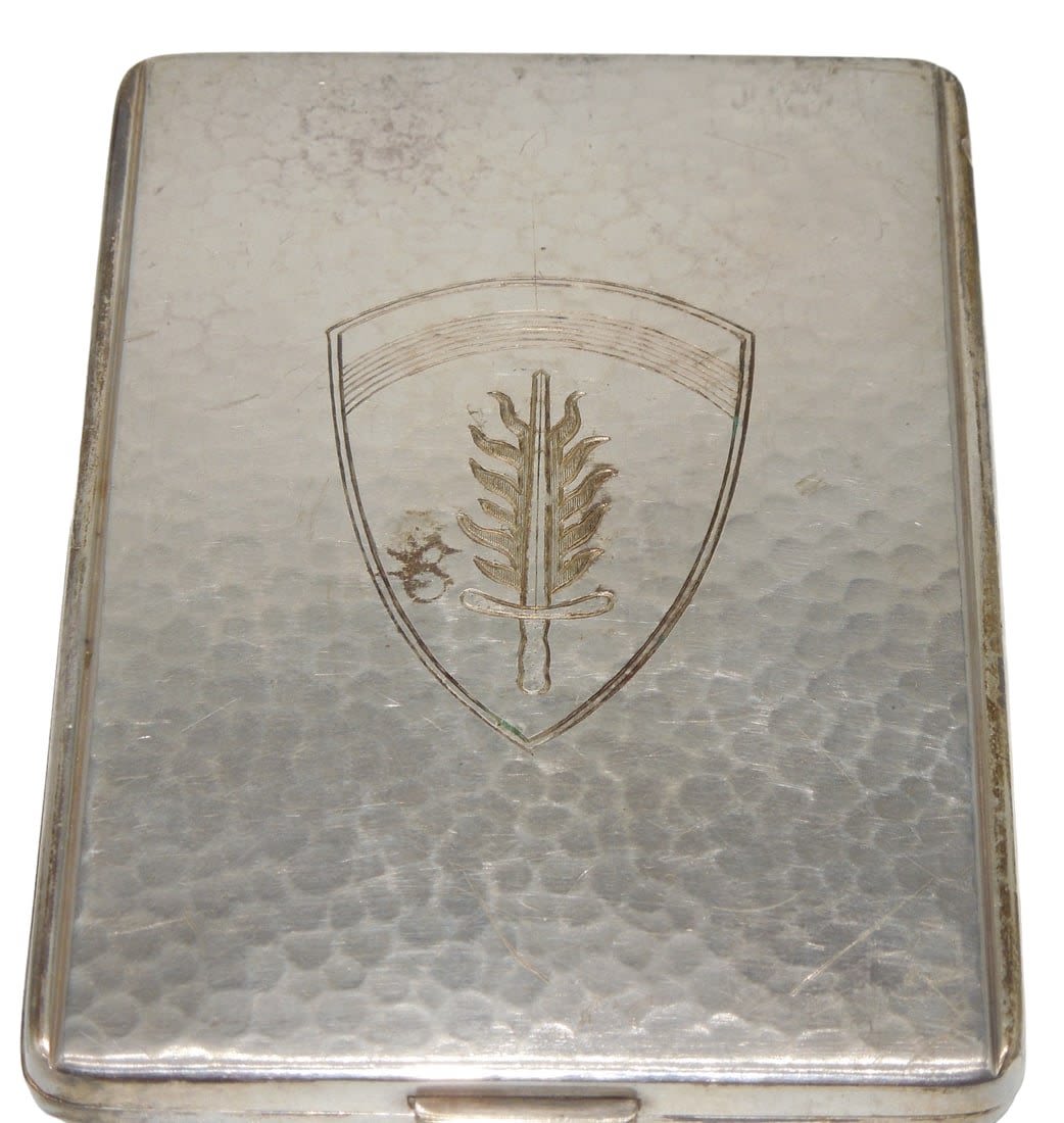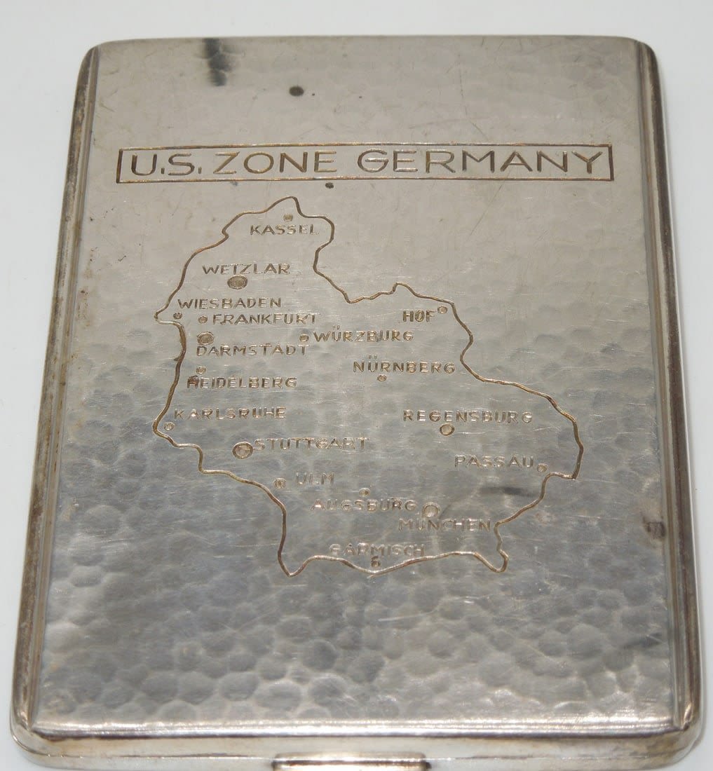 Post WWII Occupation German made US Zones of Germany .835 Silver cigarette case with a US Army In Europe patch engraved onto one side. Striking hand made piece.
