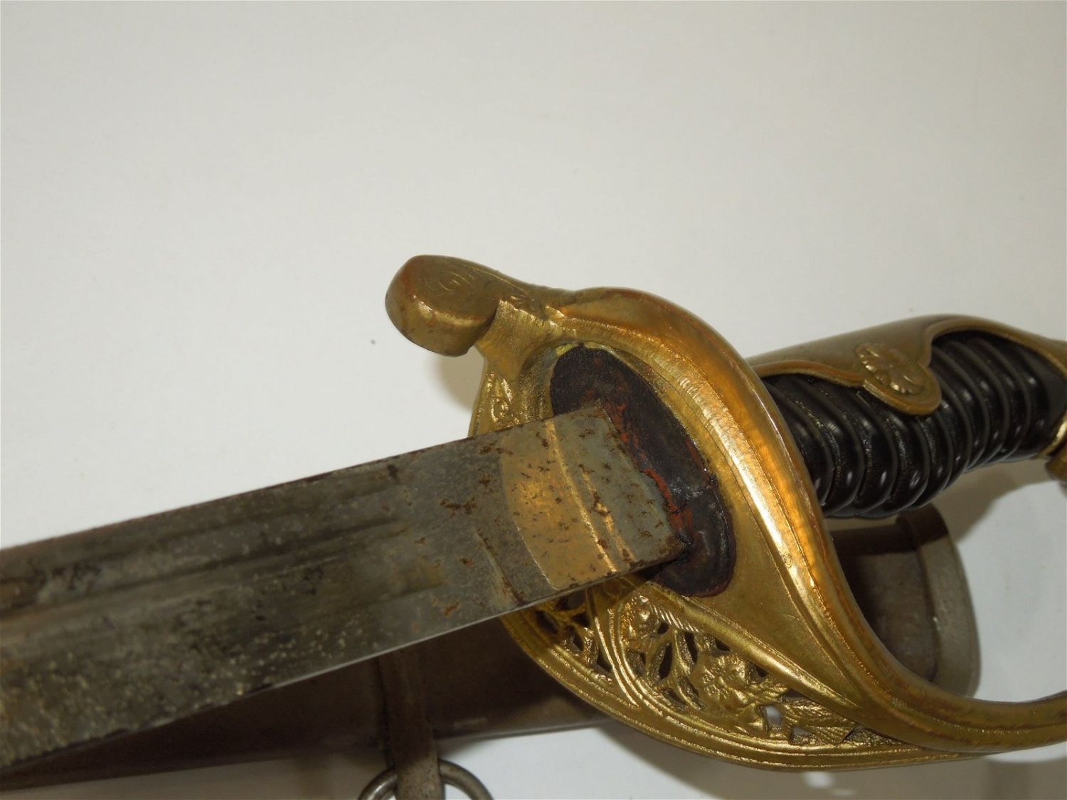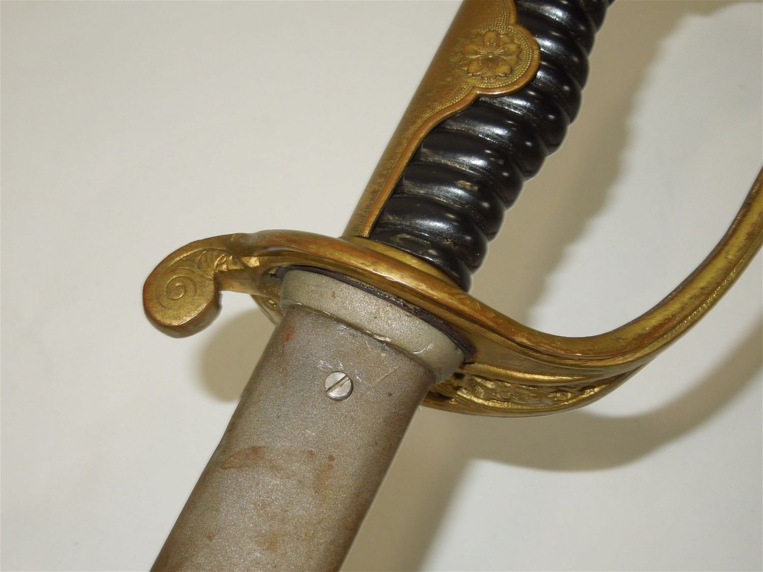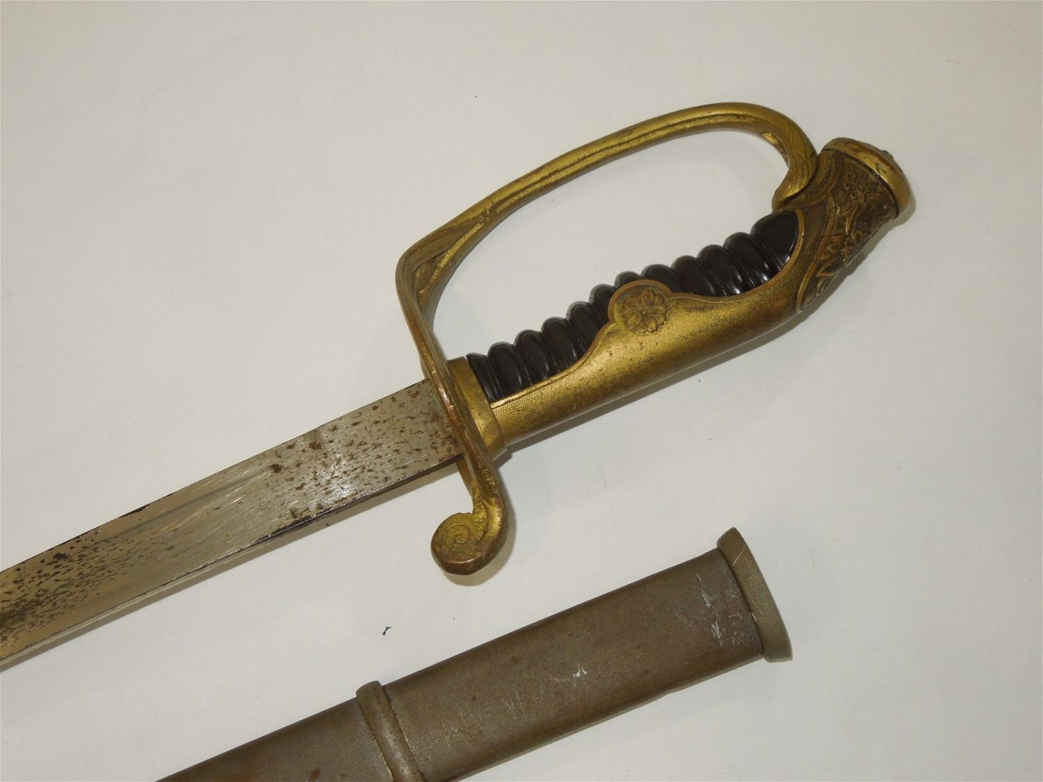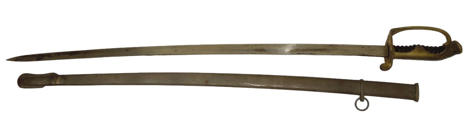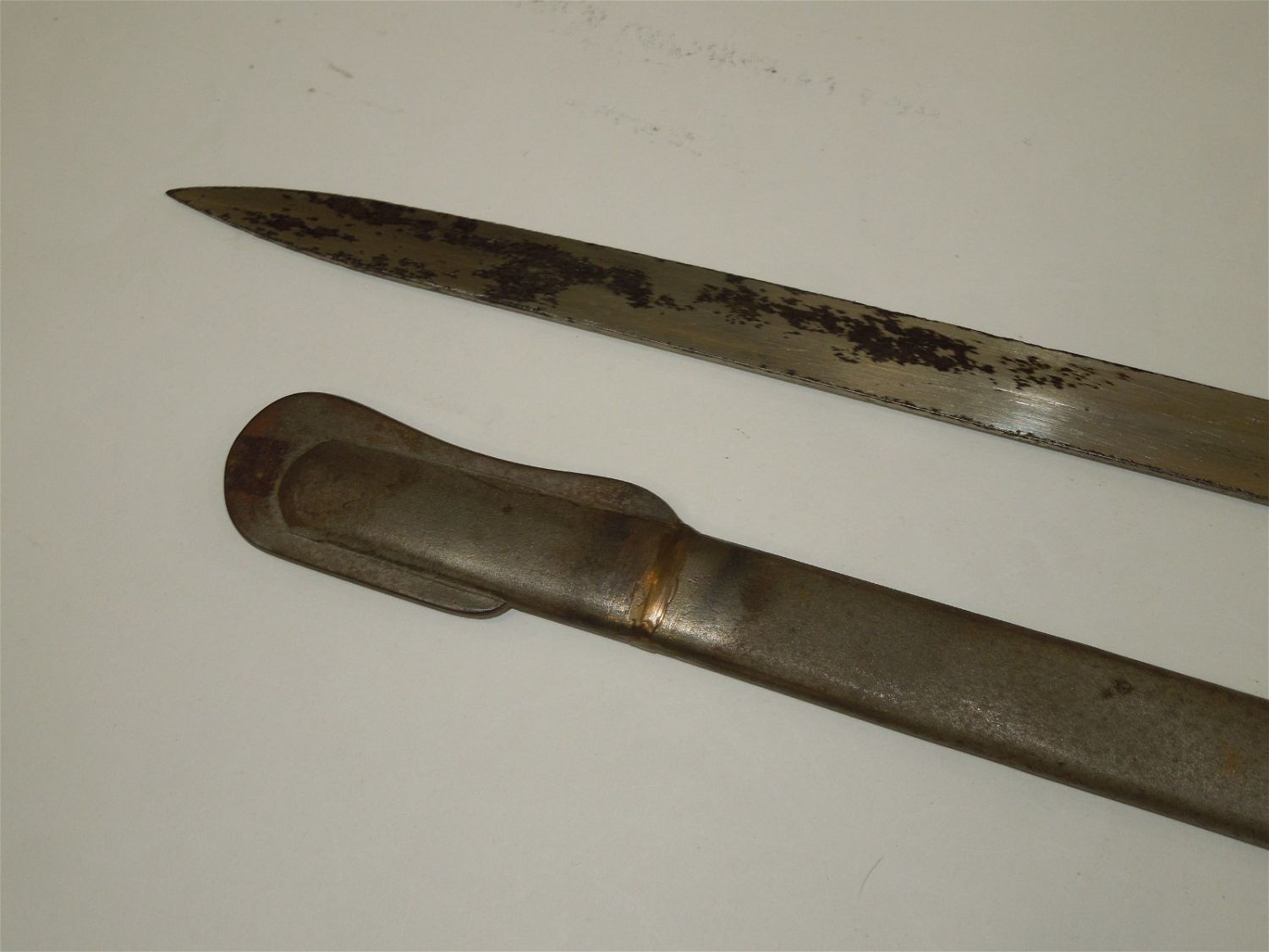 Original sword and scabbard, well used condition. Meaures 34.5 inches long. Condition: See Description for Condition Report.