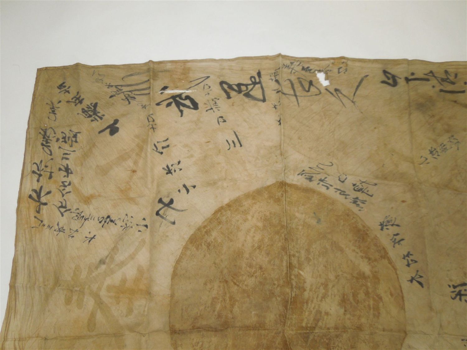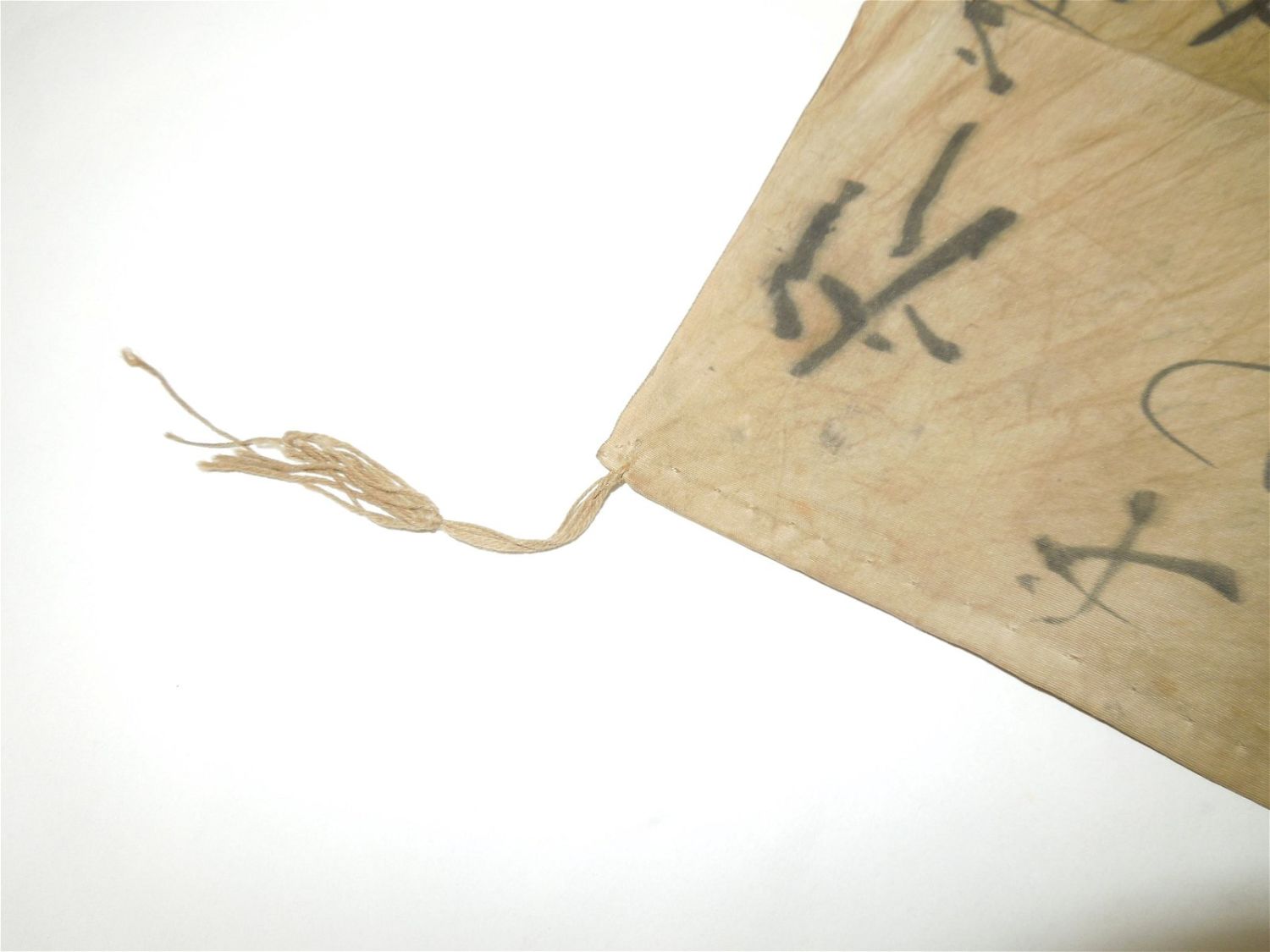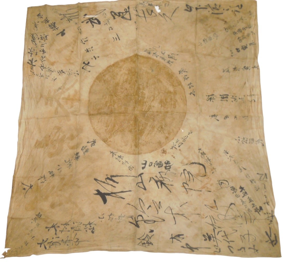 WWII Era Battle Soiled Japanese Japan Good Luck / Prayer Silk Flag With Kanji Writing