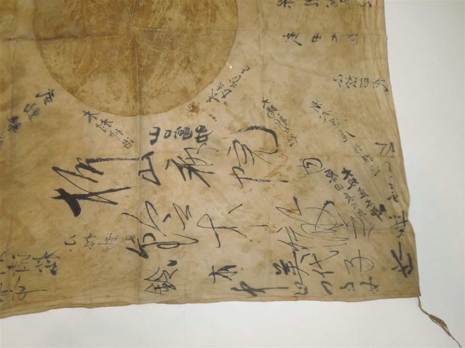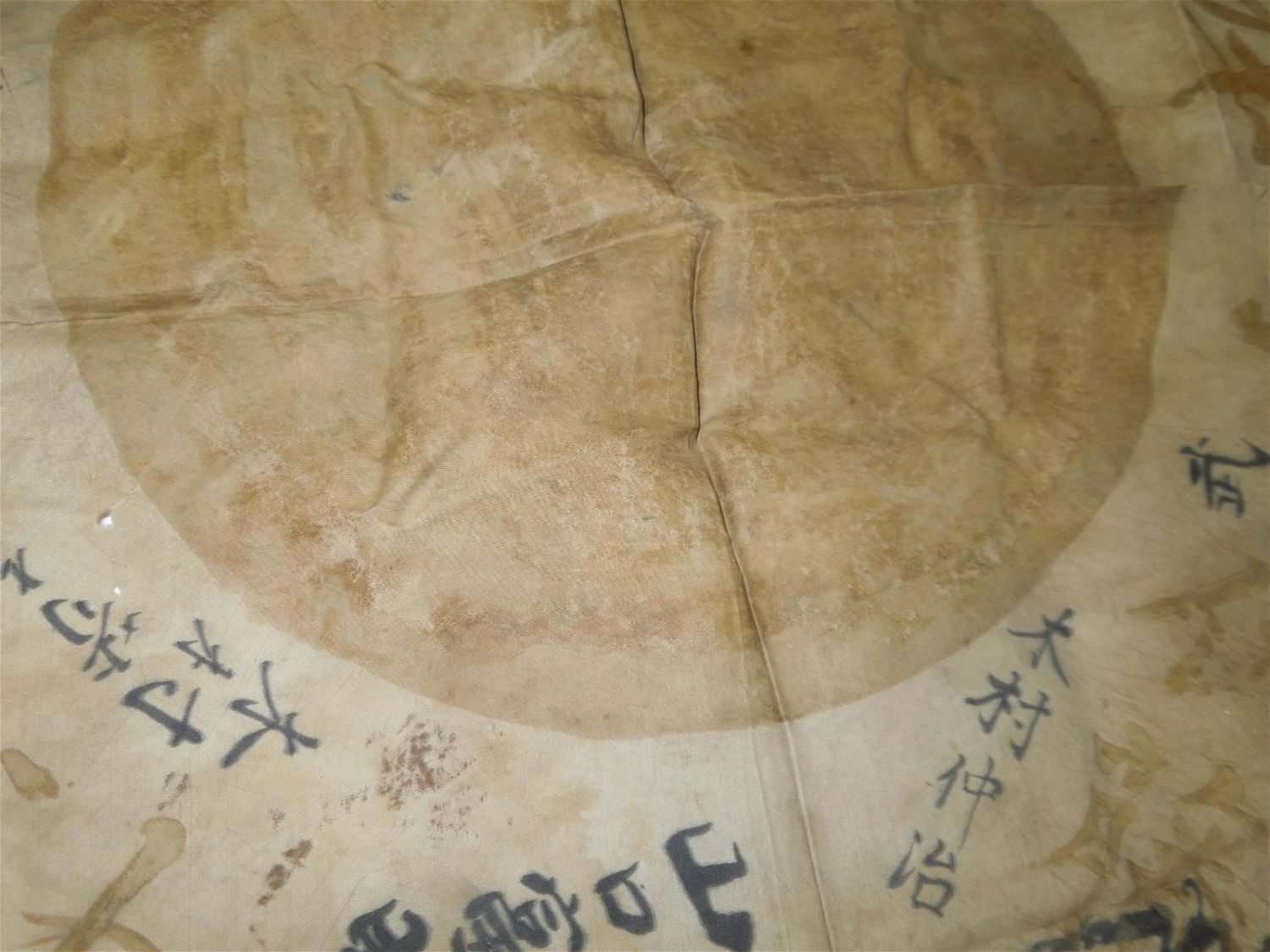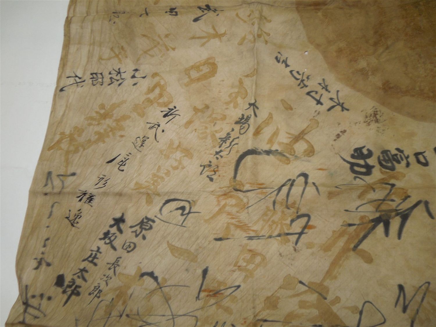 WWII Era Battle Soiled Japanese Japan Good Luck / Prayer Silk Flag With Kanji Writing