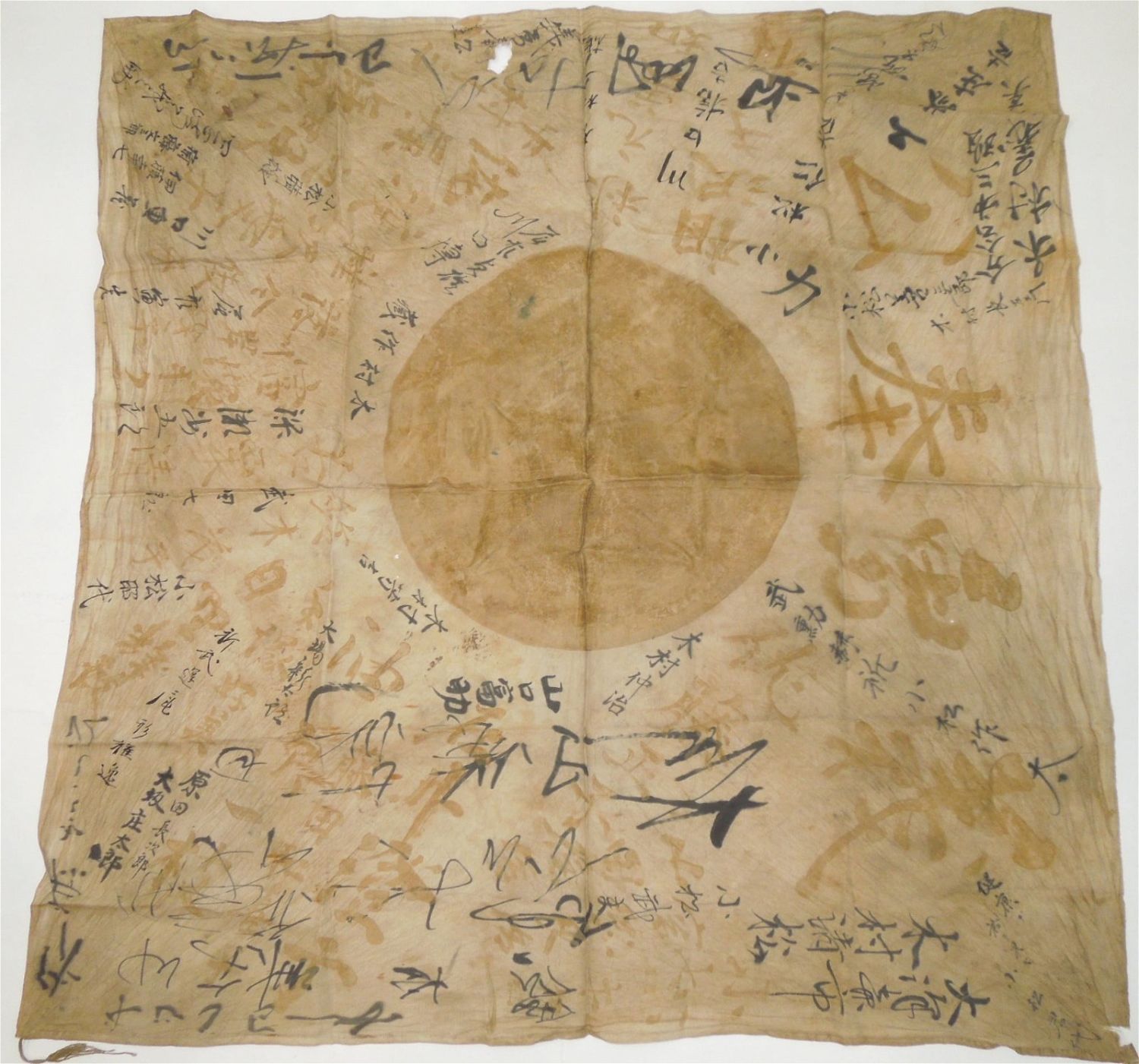 Japanese WWII signed Good Luck / Prayer Meatball Flag. Often these signatures were written as prayers, or good luck messages to Japanese WWII soldiers. Approximate size is 28 x 29 inches. Condition is good for its age with some small holes, a tear and a frayed corner. Also, all around faded color and soiling from age and use.