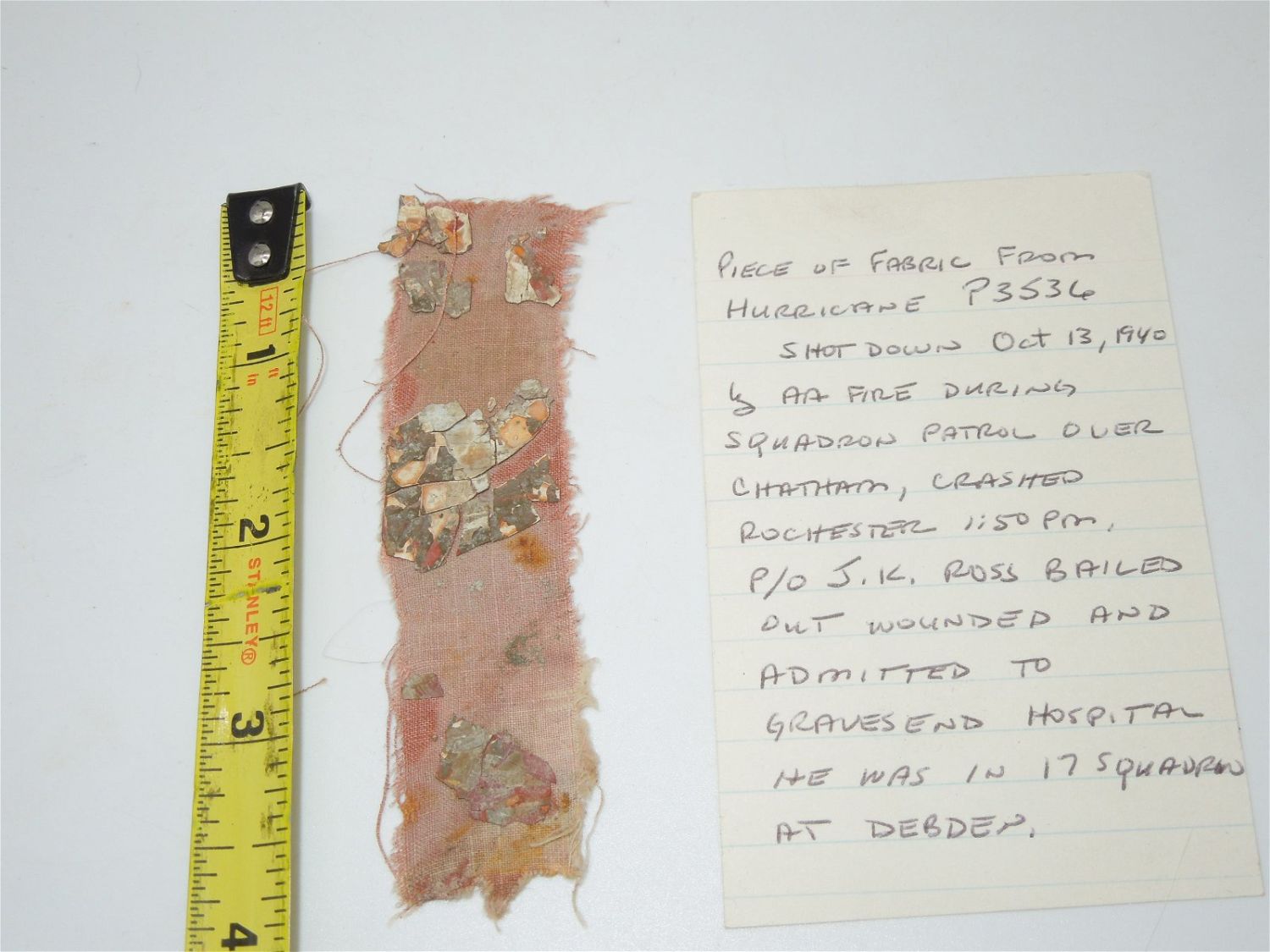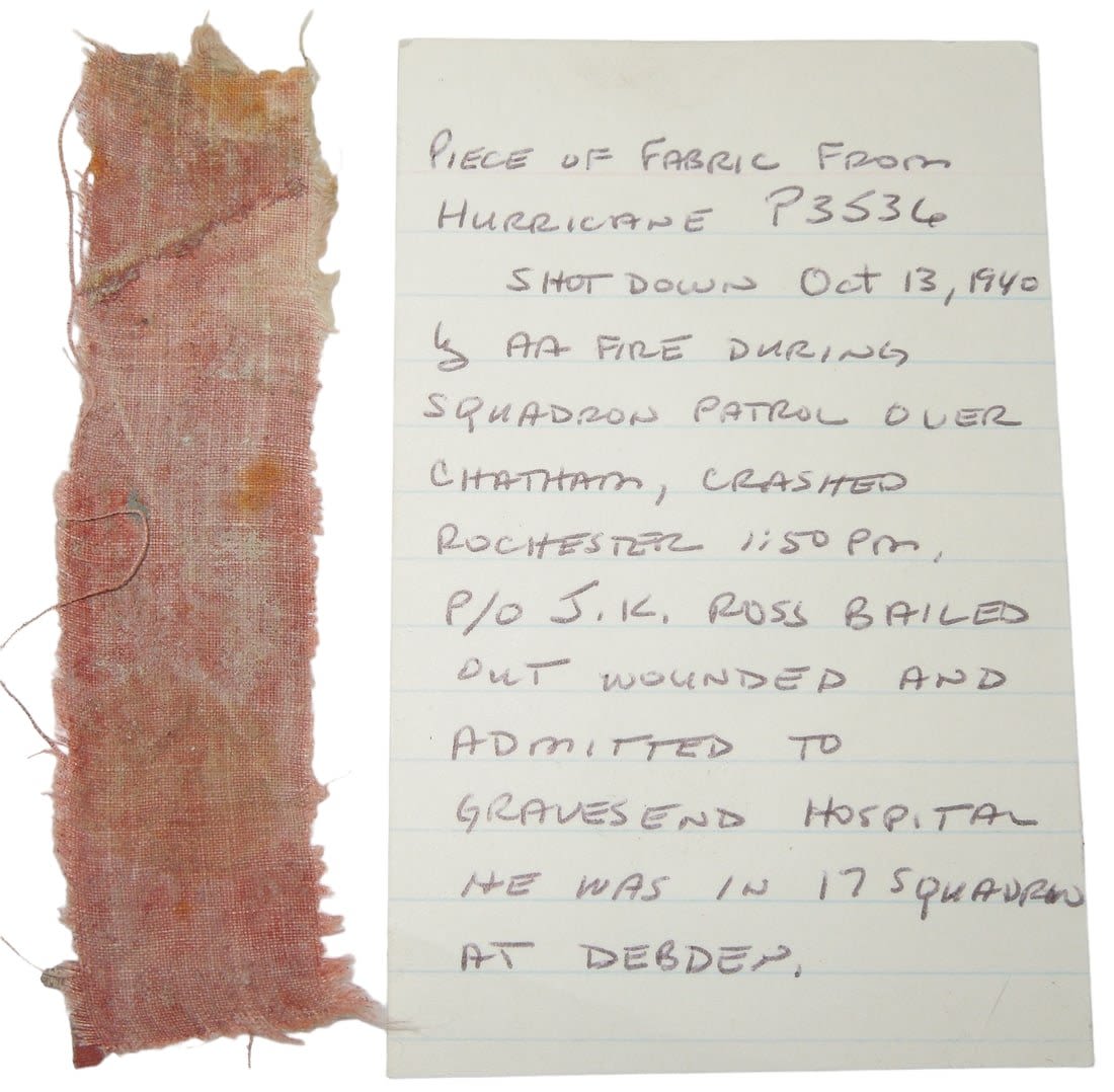 Original piece of a British Hurricane shot down in October 1940. Ross joined 17 Sqd in May 1940, and took part in the combat over Dunkirk and in the Battle of Britain. Ross was credited with a probably destroyed a Me109 on the 14th of May. He shared a Ju88 on 21st August and shared a Do17 on 3rd September. Ross shared another Do17 on 2nd October but had to make a forced landing when he ran out of fuel. On 6th October he shared in destroying another Do17 and on the 13th he was shot down by anti-aircraft fire during a patrol over Chatham. He baled out, wounded, and was admitted to Gravesend Hospital. His Hurricane, P3536, crashed at Rochester. Ross claimed a Do17 destroyed on 27th October and a Ju87 destroyed and probably a second on 11th November. He shared a Ju88 on 11th July 1941. When 134 Squadron was formed at Leconfield on 31st July from 17 Squadron personnel, Ross was promoted and went to the new unit as a Flight Commander. He served in Russia with the squadron and was awarded the DFC (gazetted 25th November 1941). he was Killed on January 6th 1942 when his Spitfire P8393 which suffered a engine or mechanical failure went down in the Irish Sea. After a search by Pilots from his squadron his aircraft or body was never found.