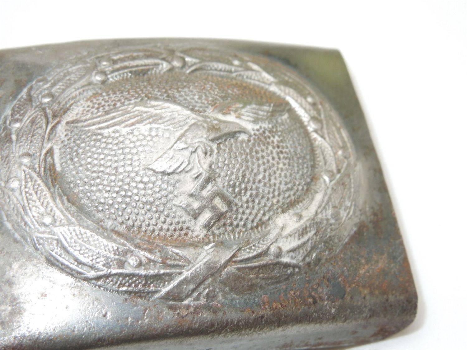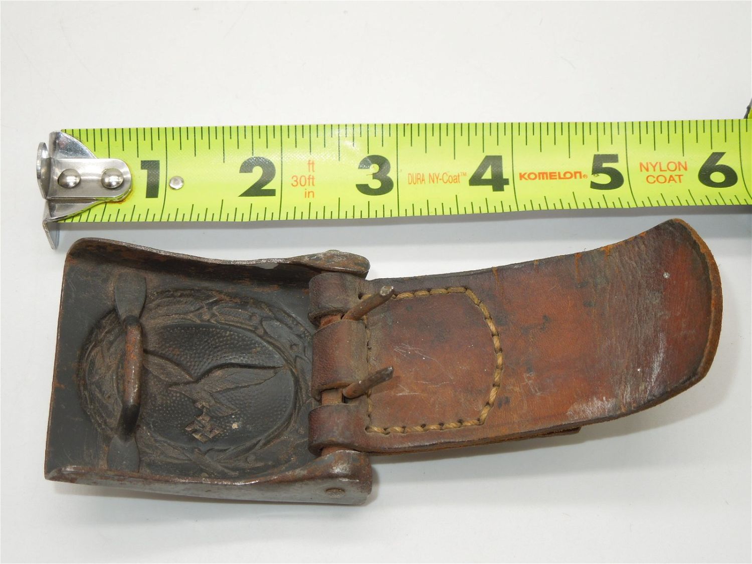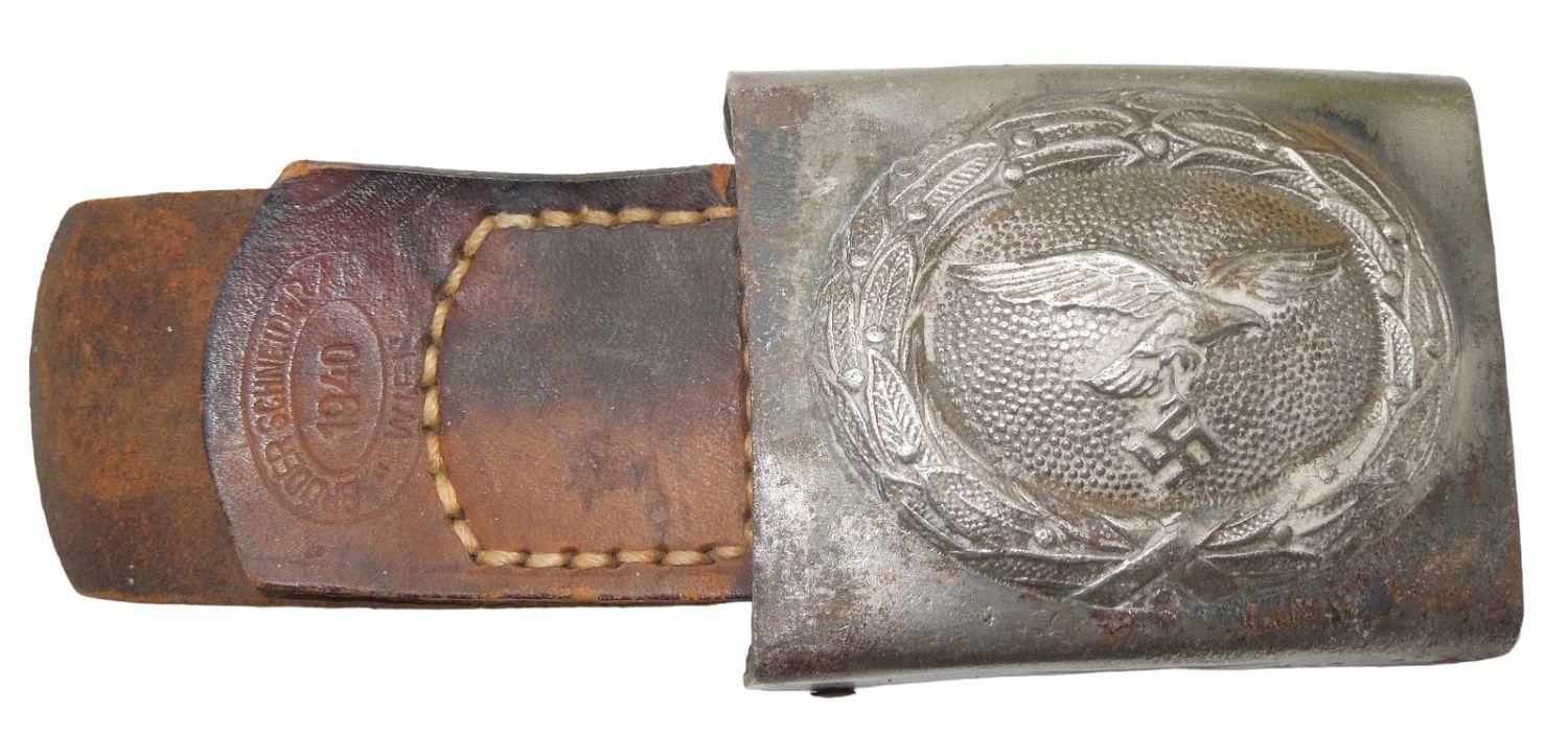 WWII Era German Luftwaffe Belt Buckle. Early-war Luftwaffe steel combat belt buckle. This belt buckle comes with its original natural brown leather tab. Marked 1940 Bruder-Schneider Wien. Good condition for its age.