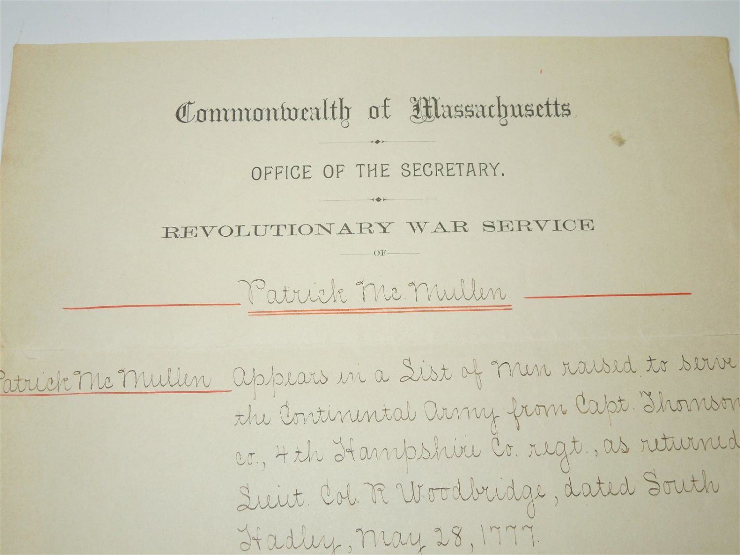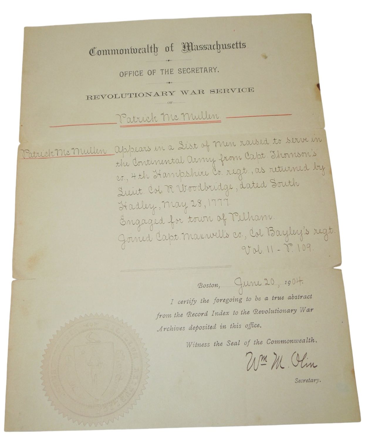 Original service certificate to Patrick McMullen who served in the 4th Hampshire Regt in 1777, engaged at the Town of Pelham. Document is dated 1904.