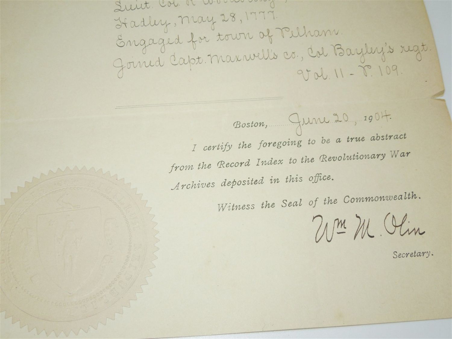 1904 Dated Massachusetts Revolutionary War Service Certificate