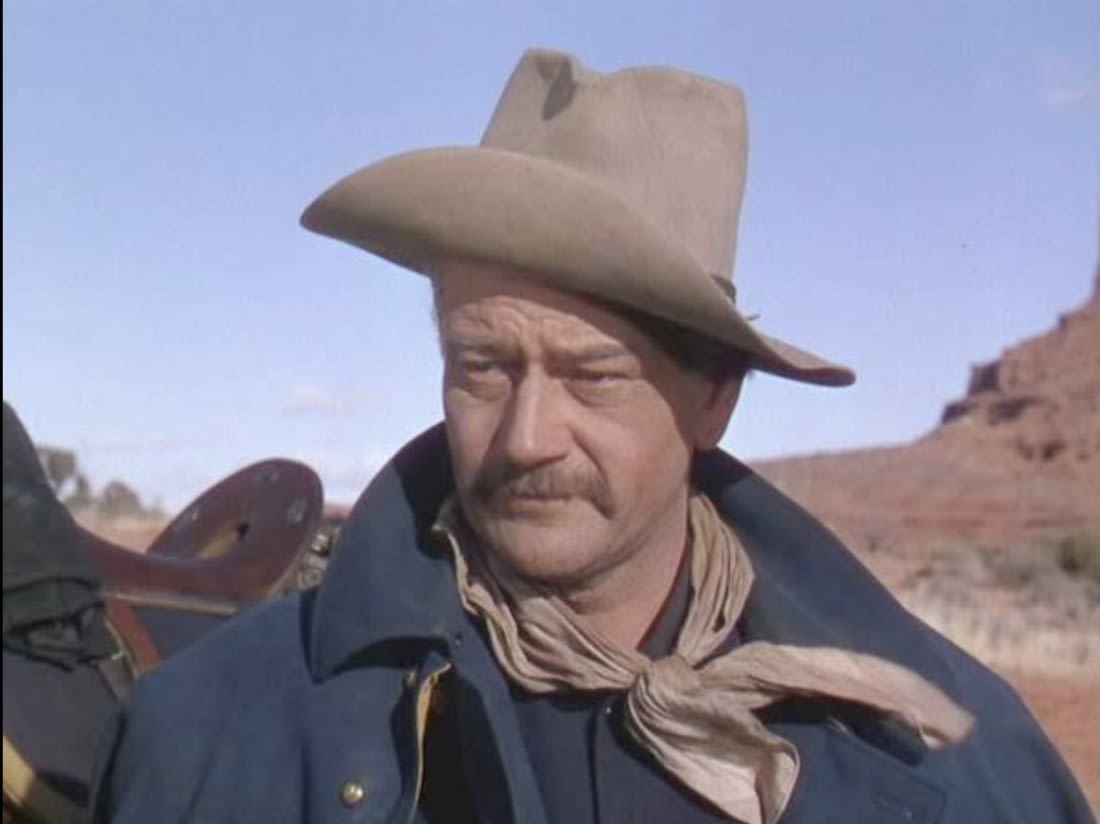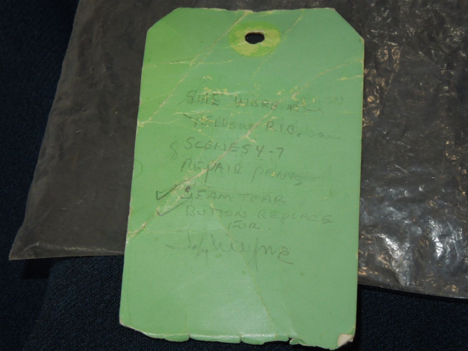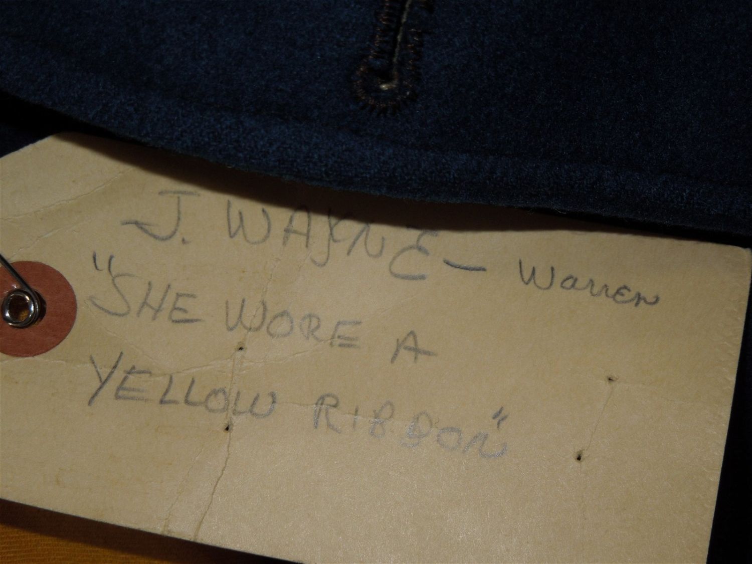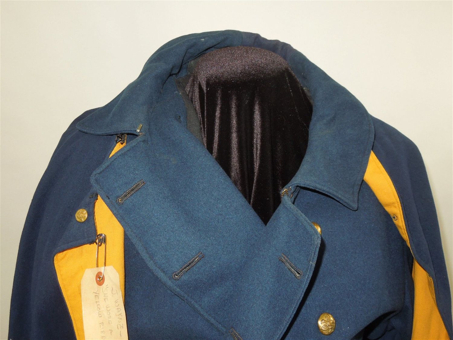 Original lot of provenanced, screen worn, and photo matched Cavalry Officer overcoat, cape, and trousers worn by iconic actor John Wayne during his acting role as Captain Nathan Brittles in the 1949 hit movie She Wore a Yellow Ribbon. This custom made original set bears interior stampings from the movie costuming company, both of which have pinned on paper tags bearing the name John Wayne. A period green tag also notes the alterations needed for Wayne. These items are photo matched to the one he wore during the movie (see digital photos). It should be noted that John Wayne weighed over 200 lbs and stood well over 6 feet tall. This overcoat is marked a size 44, and the pants are also very large, both consistent with his unusually large stature for that time period. This set was acquired directly from a technical advisor who worked as a consultant for the Western Costume Company in California and personally purchased it, as is, from their warehouse many years ago. Of note, the paper tag with the safety pin is consistent with how the company typically labels items used by notable actors and actresses. Two buttons have popped off but are included.