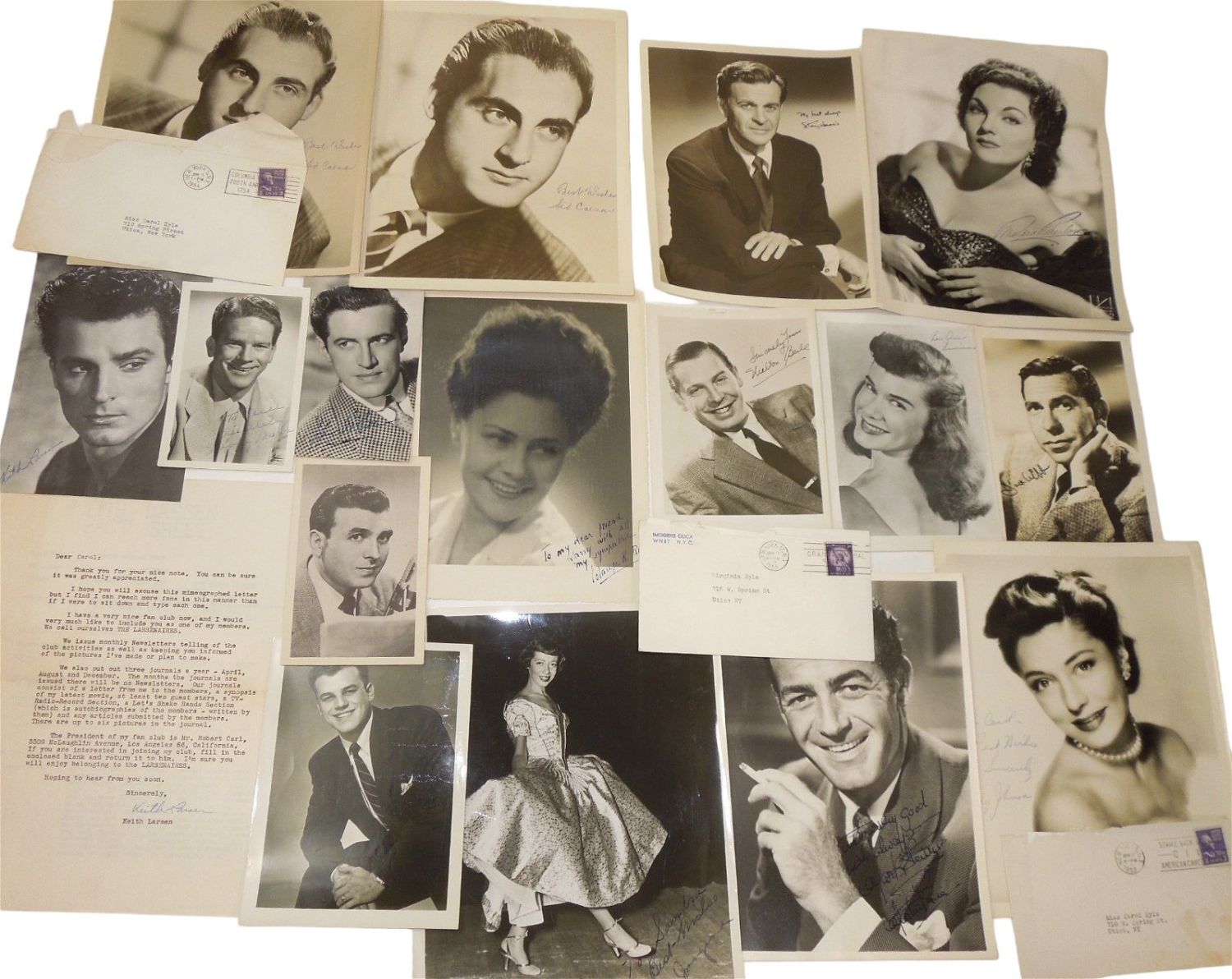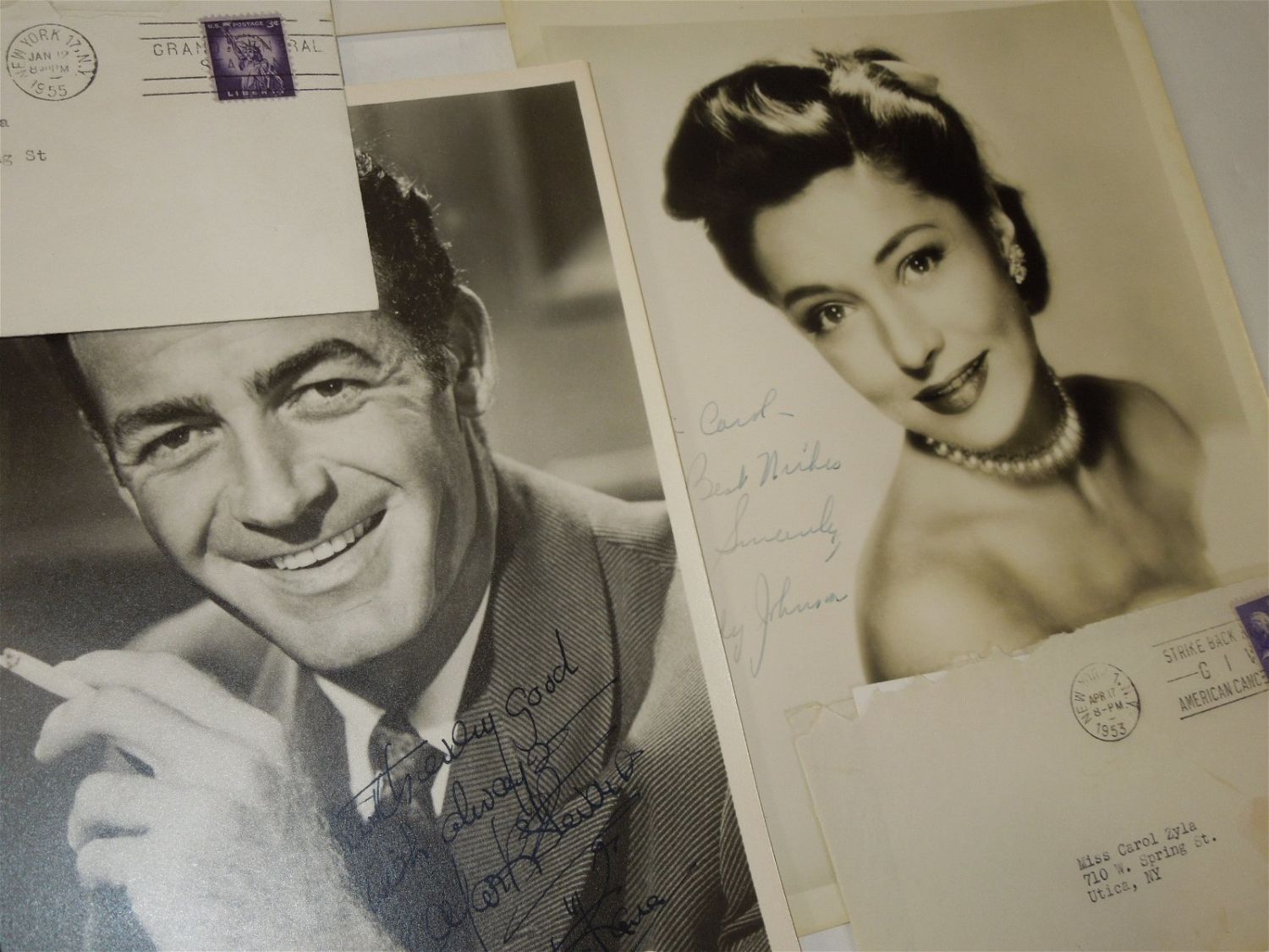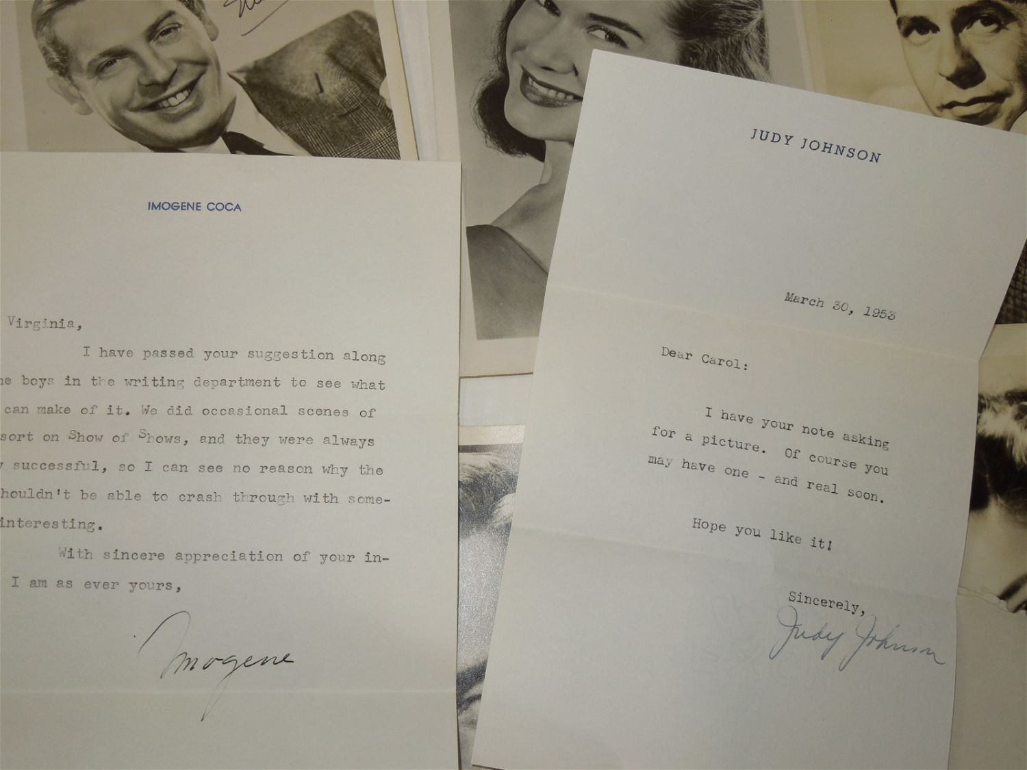 Large lot of Hollywood and other Celebrity autographed photos and letters from the 1950s. All items are original signed and include such namesakes as Judy Johnson, Sid Caesar, Milton Berle, Imogene Coca, Keith Larsen. Some are accompanied by hand signed letters and envelopes from the celebrities.