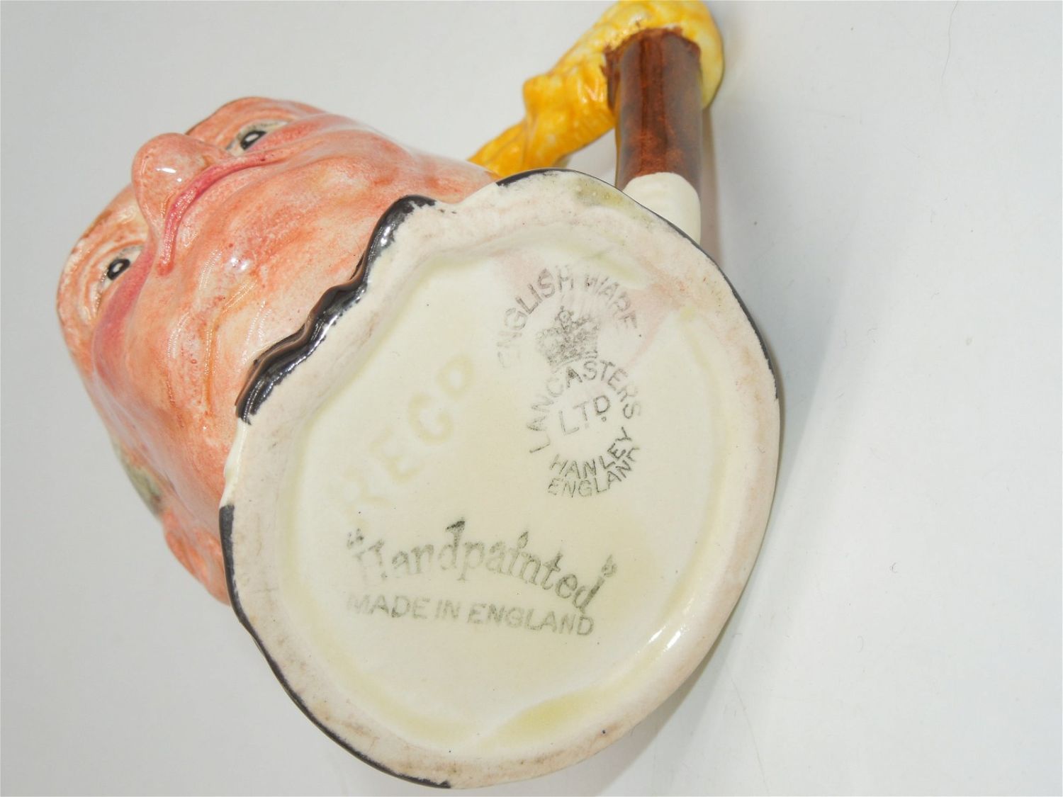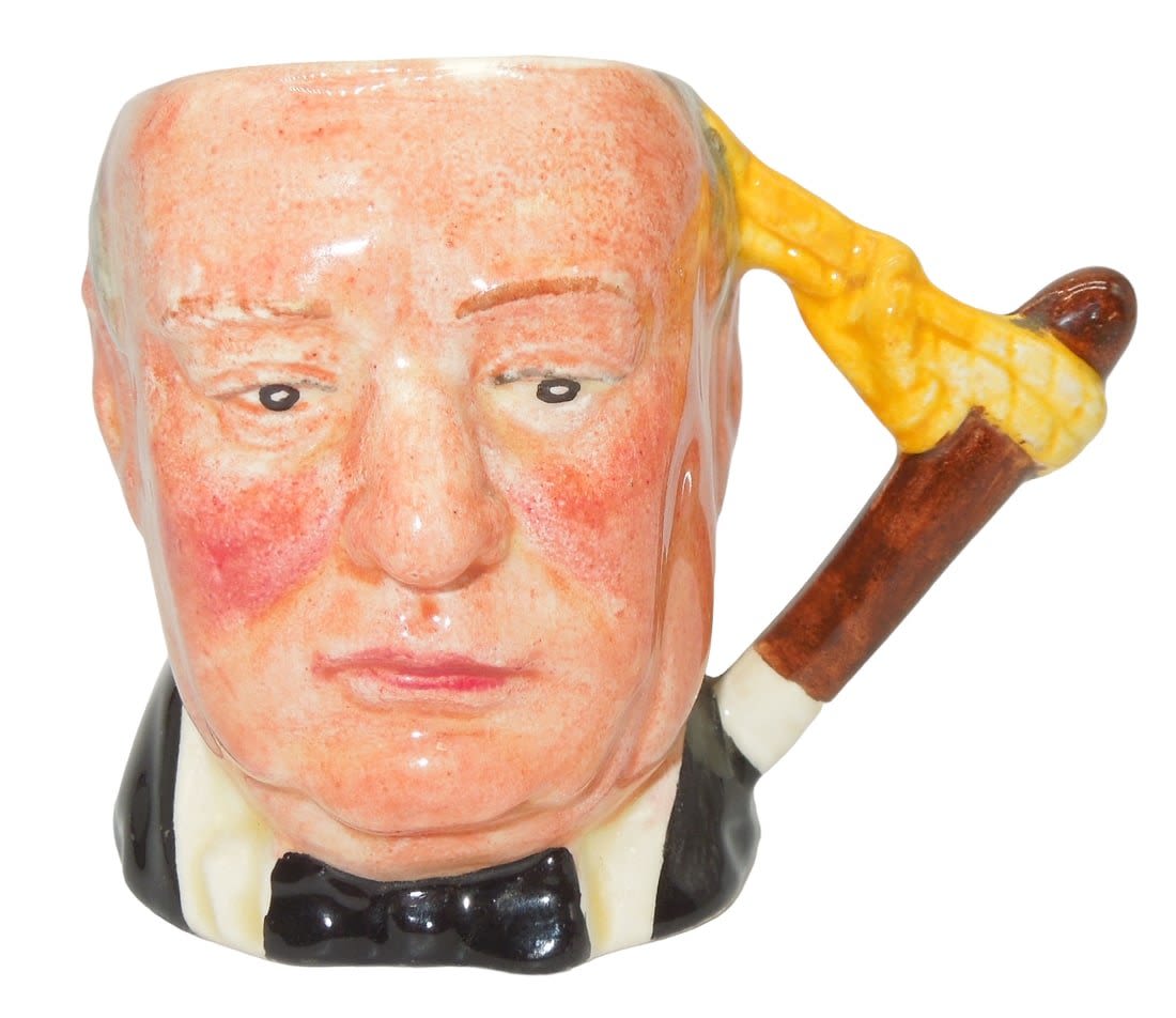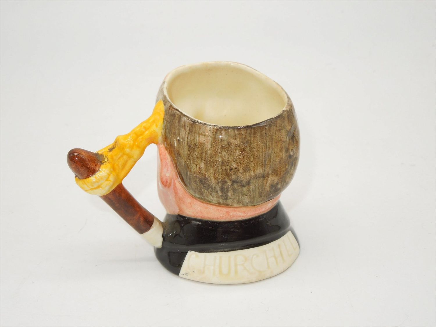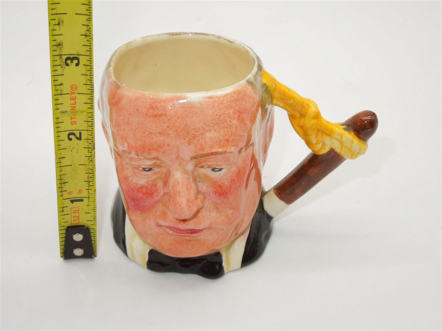 Winston Churchill Toby Mug with a Cigar Handle. Produced and stamped on the bottom: English Ware Lancasters LTD Hanley England Hand Painted Made in England. Approximate size is 3 x 4 inches. Very good condition.
