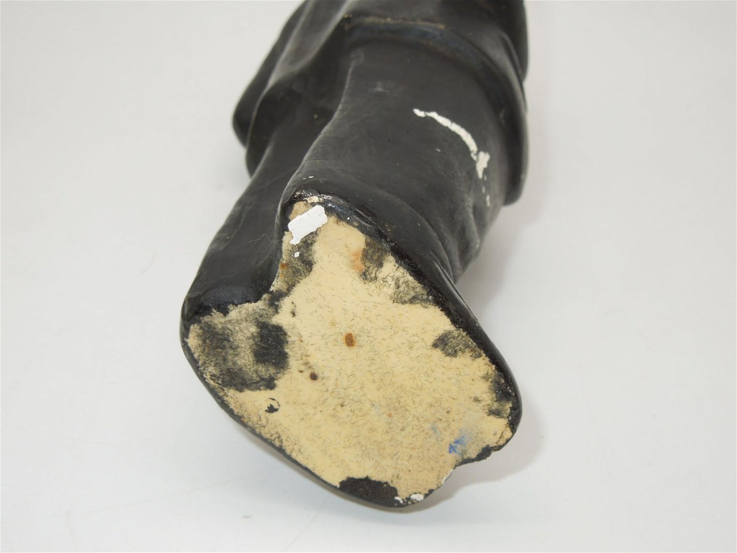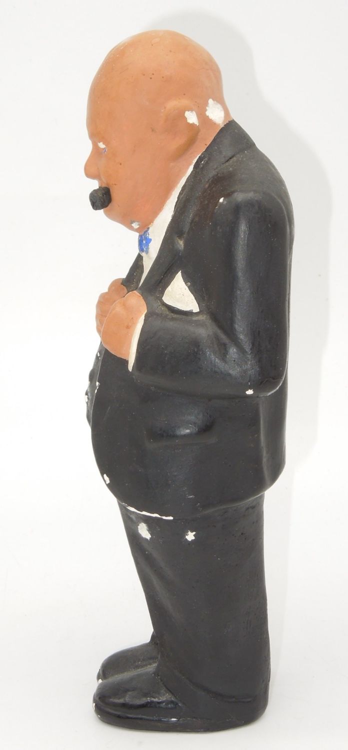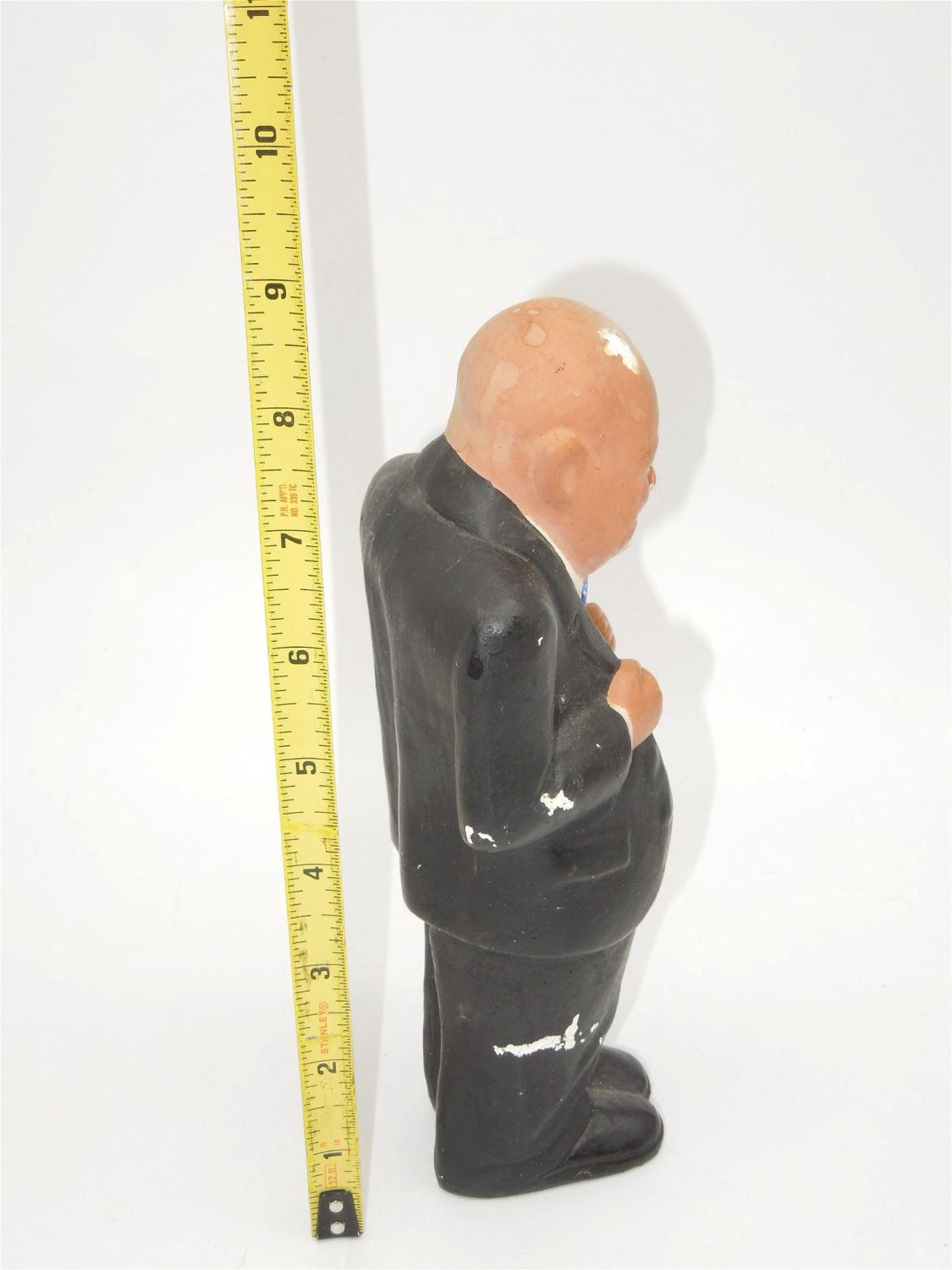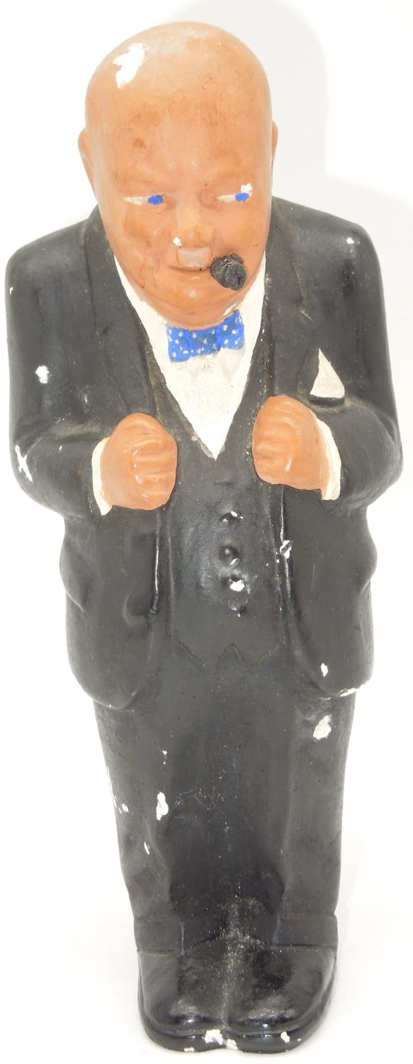 Painted plaster ceramic figure of WWII Prime Minister Winston Churchill. He is shown wearing a black three piece suit, a white shirt with three black buttons and bow tie. He has a cigar stub in his mouth. No maker mark is seen. Approximate size is 9 inches tall. There are chips with missing paint throughout the piece. See the photos for the exact places where the paint is missing.