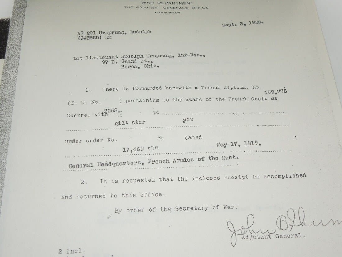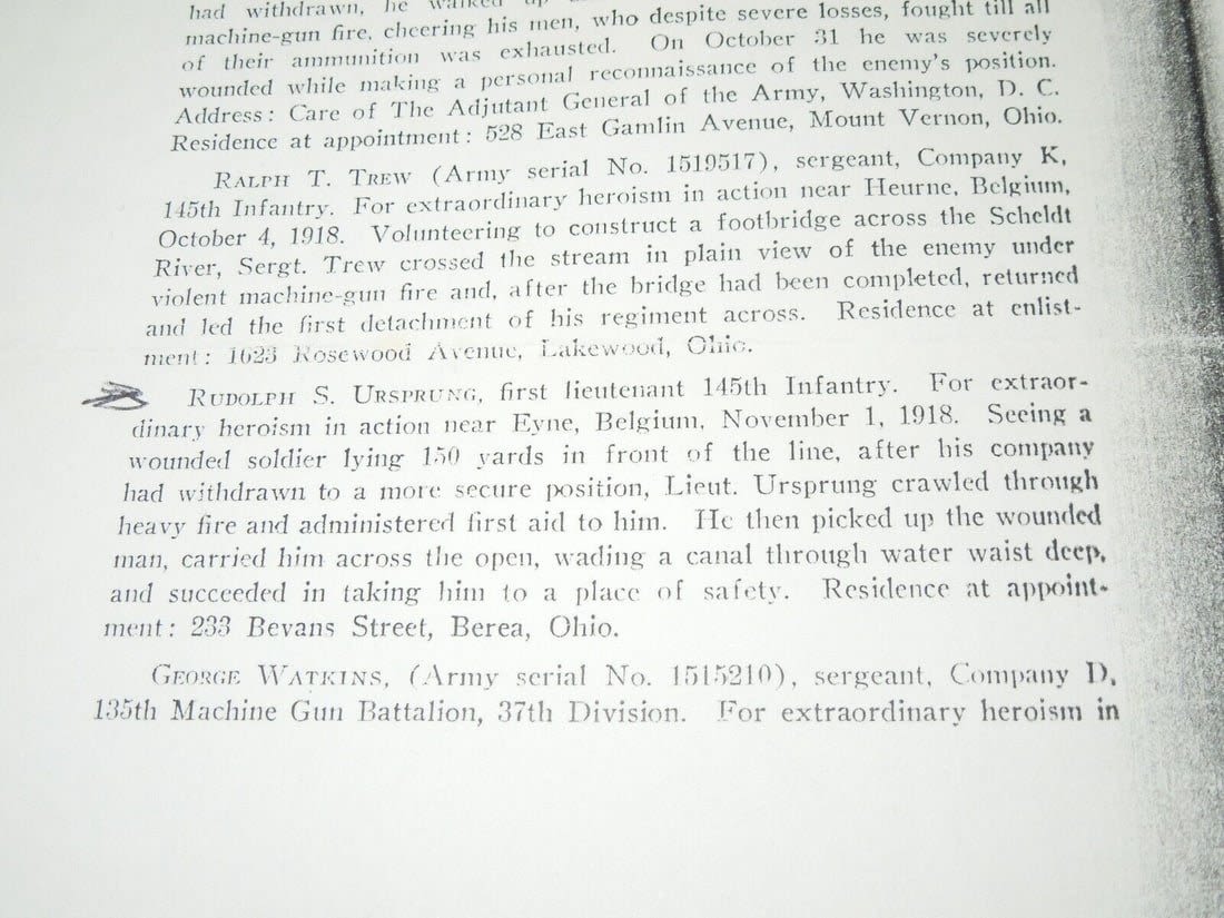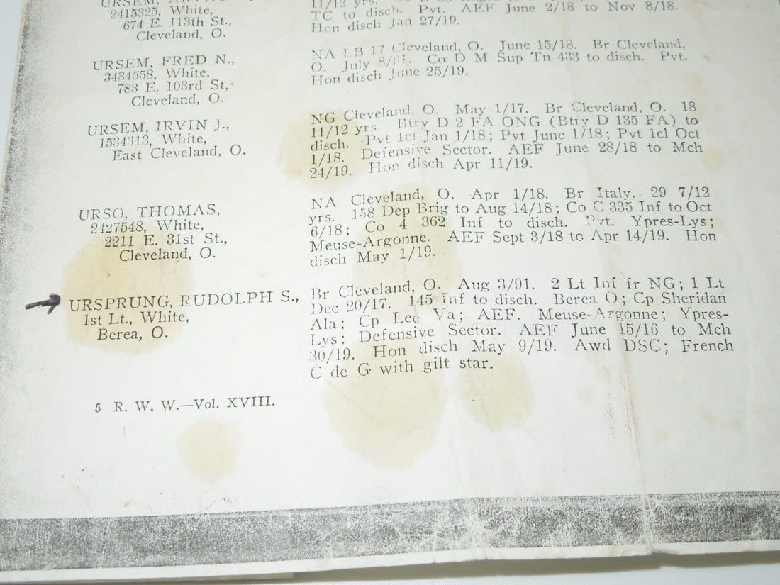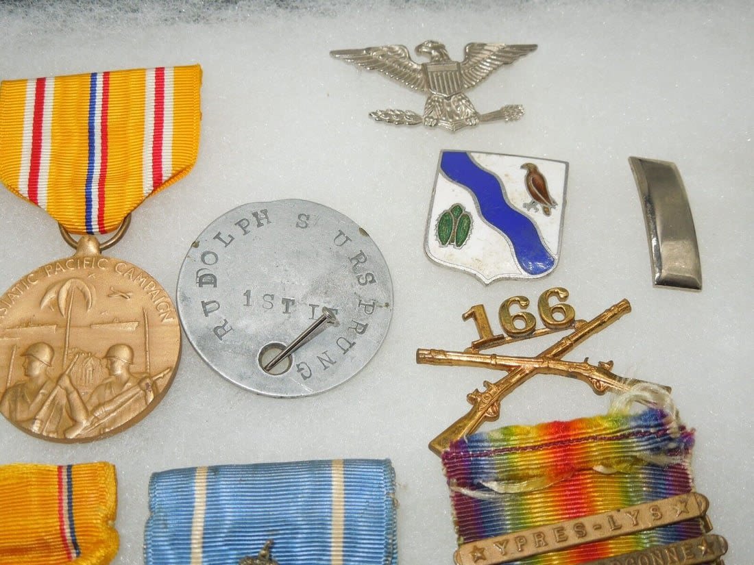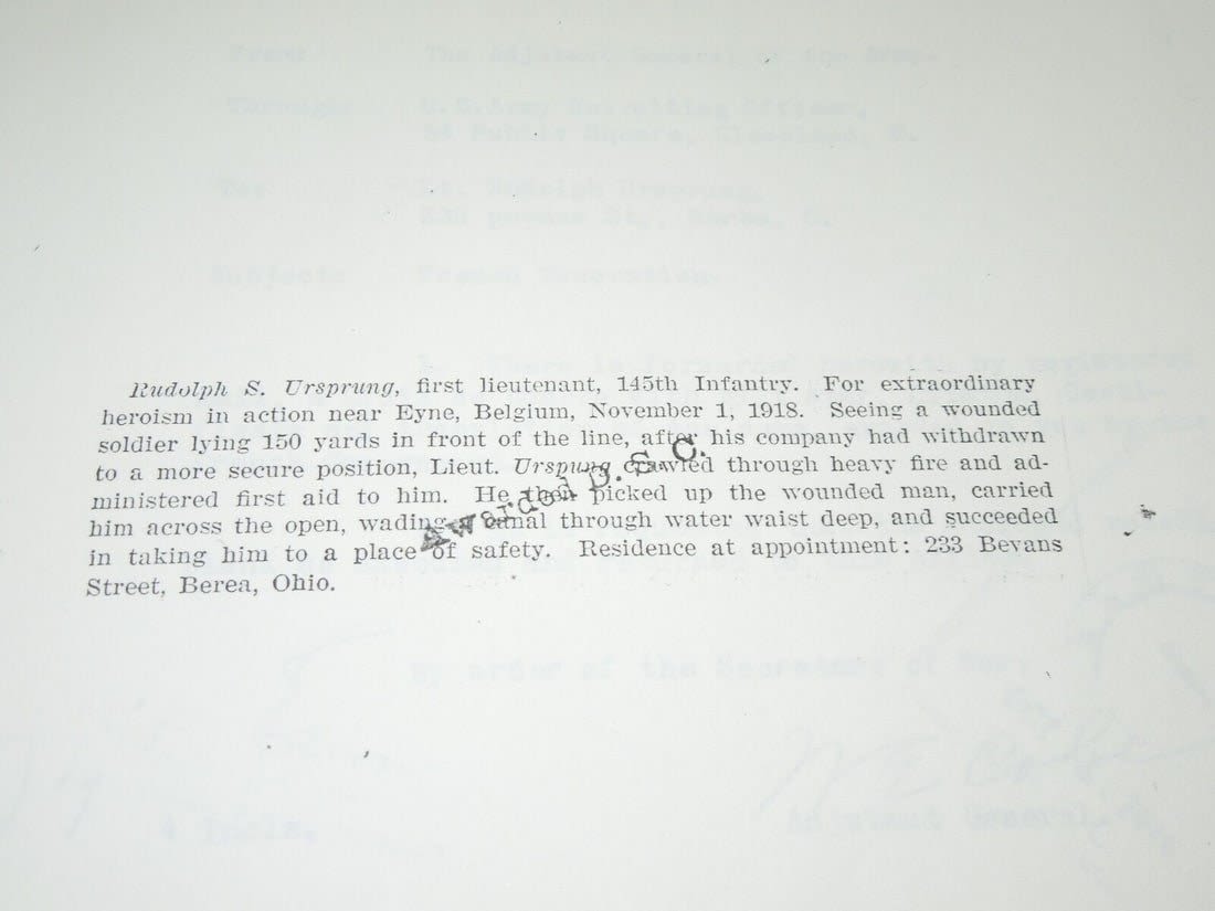 WWI Distinguished Service Cross Recipient Medal / Dog Tag Group of Colonel Rudolph Ursprung, 145th Infantry Regiment, 37th Division. He would go on to serve in the 37th in WWII as a Colonel as well. The Mexican Border Medal (#583) traces to a different Captain. All of the items are well worn, some appeared to have been mounted on a display that didn’t age well. Comes with numerous paper copies of his records. This auction house does not have any other items from him nor do we know where the DSC is located. DSC Citation: The Distinguished Service Cross is presented to Rudulph S. Ursprung, First Lieutenant (Infantry), U.S. Army, for extraordinary heroism in action while serving with 145th Infantry Regiment, 37th Division, A.E.F., near Eyne, Belgium, November 1, 1918. Seeing a wounded soldier lying 150 yards in front of the line, after his company had withdrawn to a more secure position, Lieutenant Ursprung crawled through heavy fire and administered first aid to him. He then picked up the wounded man, carried him across the open, wading a canal through water waist deep, and succeeded in taking him to a place of safety. The display case does not come with this group.