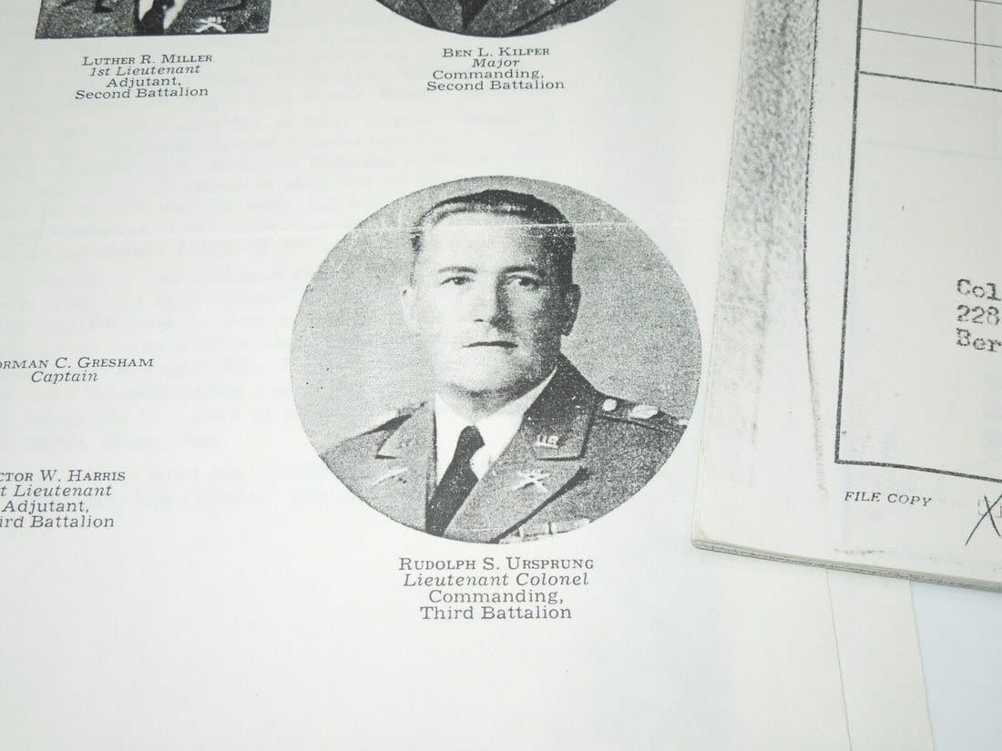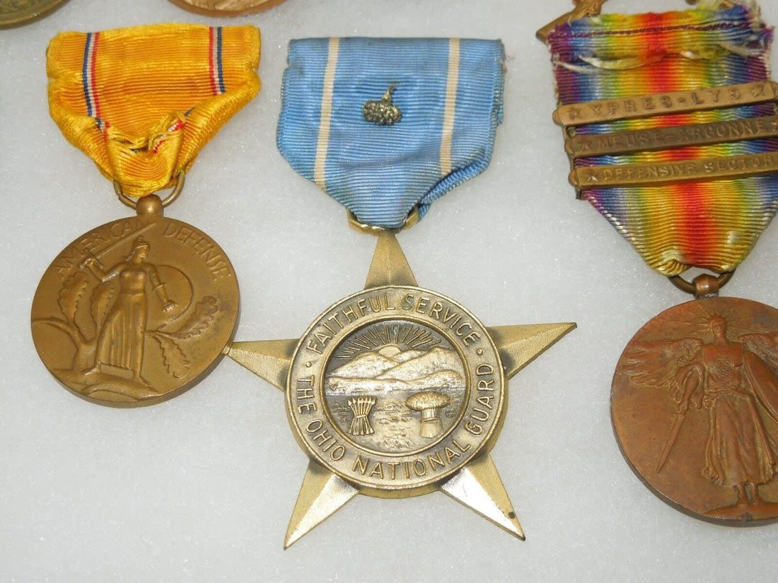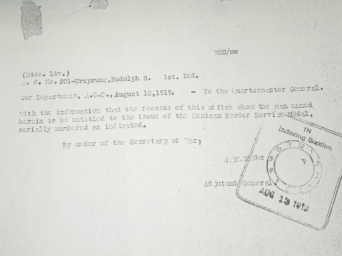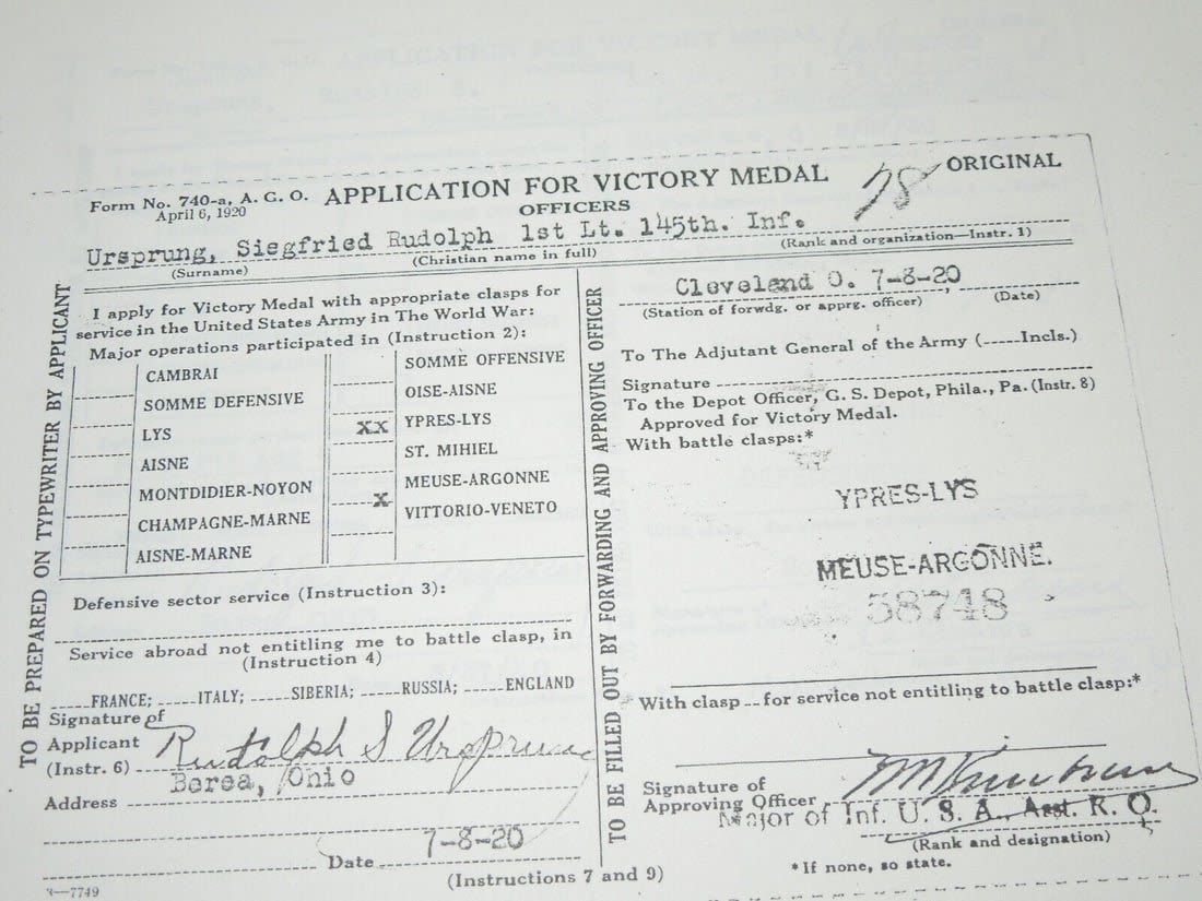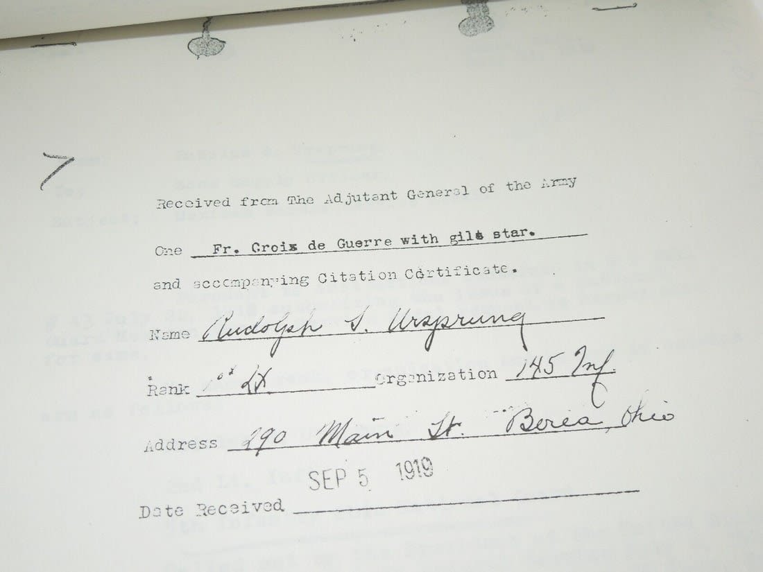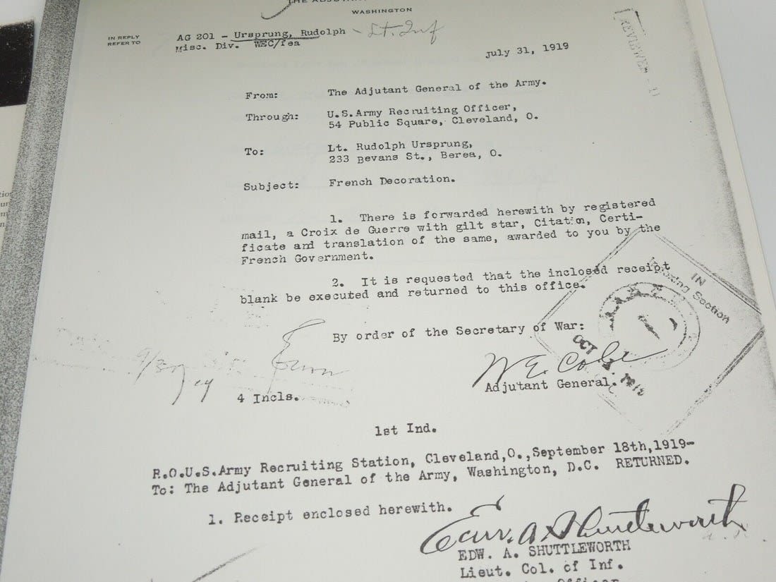 WWI Distinguished Service Cross Recipient Medal / Dog Tag Group of Colonel Rudolph Ursprung, 145th Infantry Regiment, 37th Division. He would go on to serve in the 37th in WWII as a Colonel as well. The Mexican Border Medal (#583) traces to a different Captain. All of the items are well worn, some appeared to have been mounted on a display that didn’t age well. Comes with numerous paper copies of his records. This auction house does not have any other items from him nor do we know where the DSC is located. DSC Citation: The Distinguished Service Cross is presented to Rudulph S. Ursprung, First Lieutenant (Infantry), U.S. Army, for extraordinary heroism in action while serving with 145th Infantry Regiment, 37th Division, A.E.F., near Eyne, Belgium, November 1, 1918. Seeing a wounded soldier lying 150 yards in front of the line, after his company had withdrawn to a more secure position, Lieutenant Ursprung crawled through heavy fire and administered first aid to him. He then picked up the wounded man, carried him across the open, wading a canal through water waist deep, and succeeded in taking him to a place of safety. The display case does not come with this group.