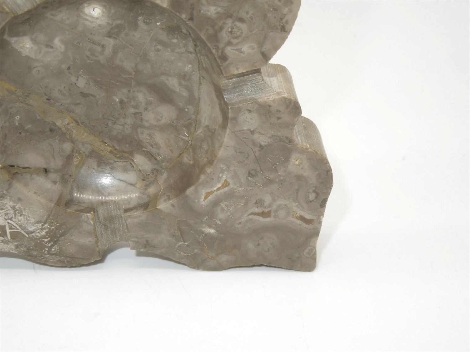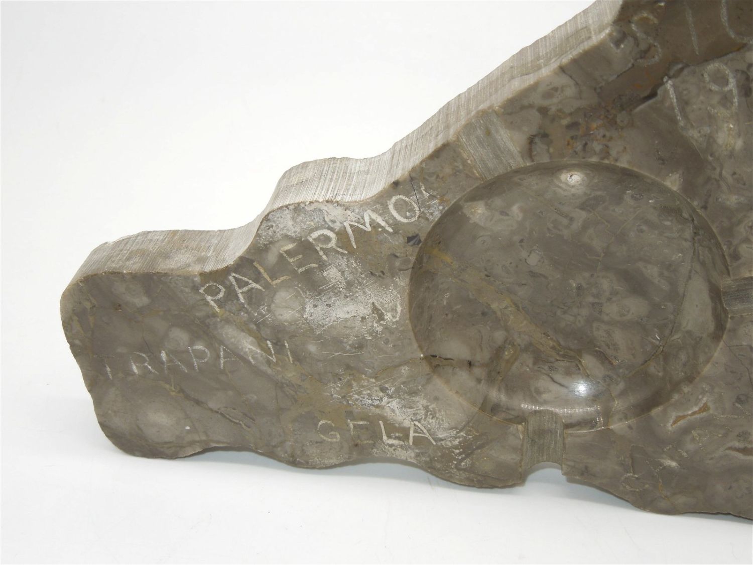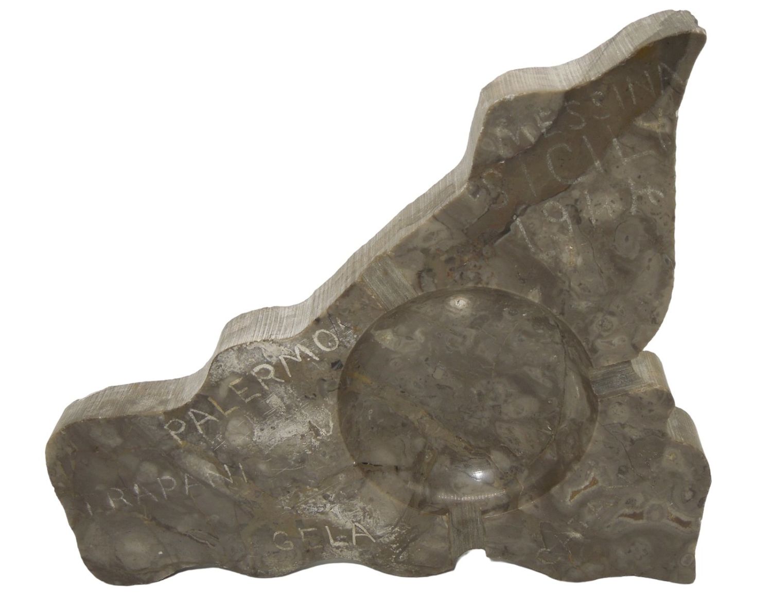 WWII Era 1944 Ashtray. Etched into the top of the ashtray are the following cities in Italy. Palermo, Sicily, Catania, Messina, Gela and Trapani. No makers mark. Approximate size is 5.5 x 6 inches. The ashtray appears to be made out of granite or marble. Good usable condition.