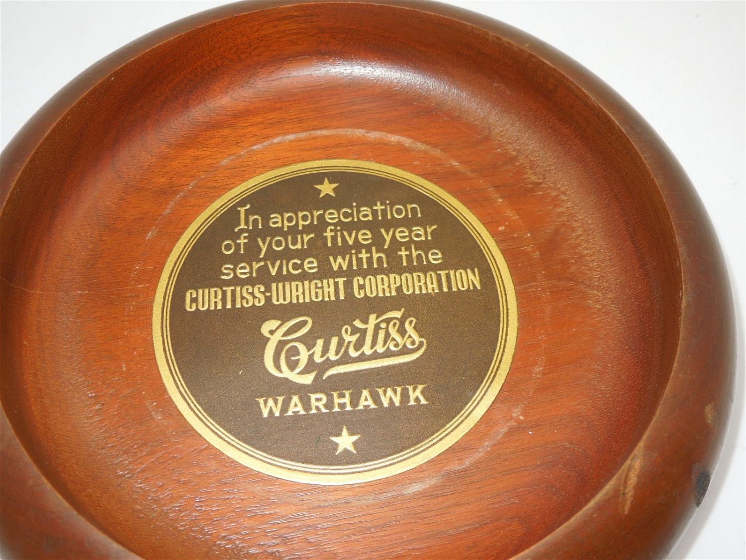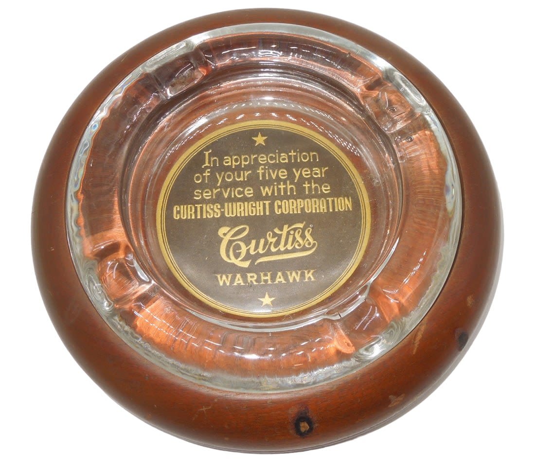 Curtiss-Wright P-40 Warhawk Ashtray Home Front Aircraft Corporation. Gift given for 5 years of service. Approximate diameter size is 7.25 inches for the wooden holder and 6 inches for the actual glass ashtray. The bottom of the wooden base appears to be missing a piece. Overall, nice condition.