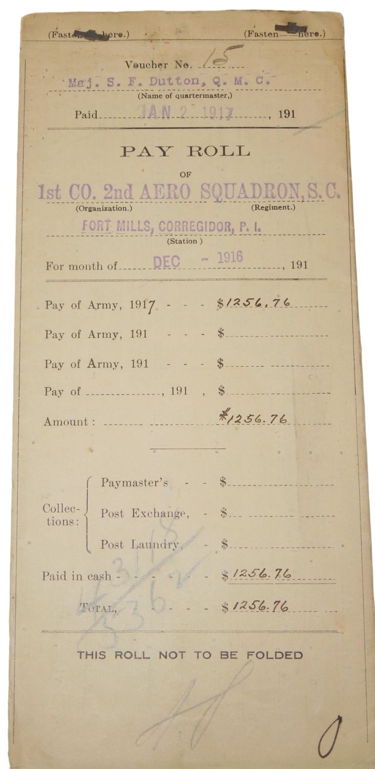 WWI 1917 2nd Aero Squadron Fort Mills, Corregidor Philippines Islands Pay Roll Document. Signatures of Pay Roll Voucher of Quartermaster Corps Major S.F. Dutton and 35 members of the 1st CO. 2nd Aero Squadron, S.C. There are 3 pages with this document. The condition is soiled and shows signs of handling. It also has small tears that do not affect the readability. This piece would make an excellent research project!