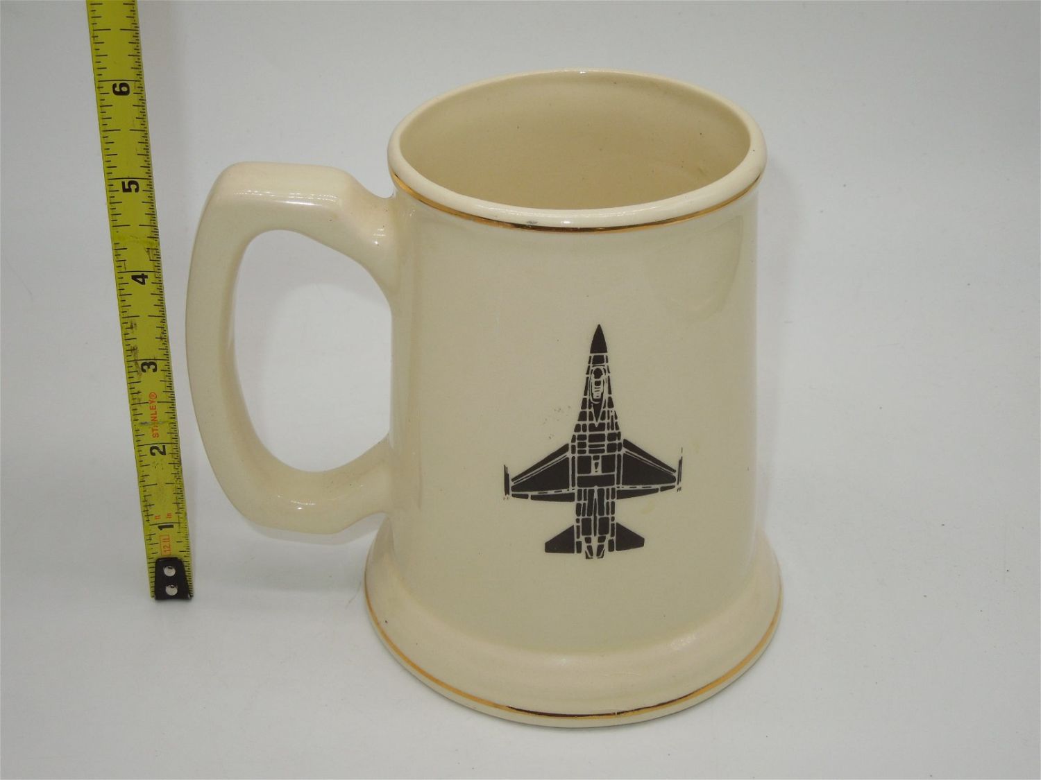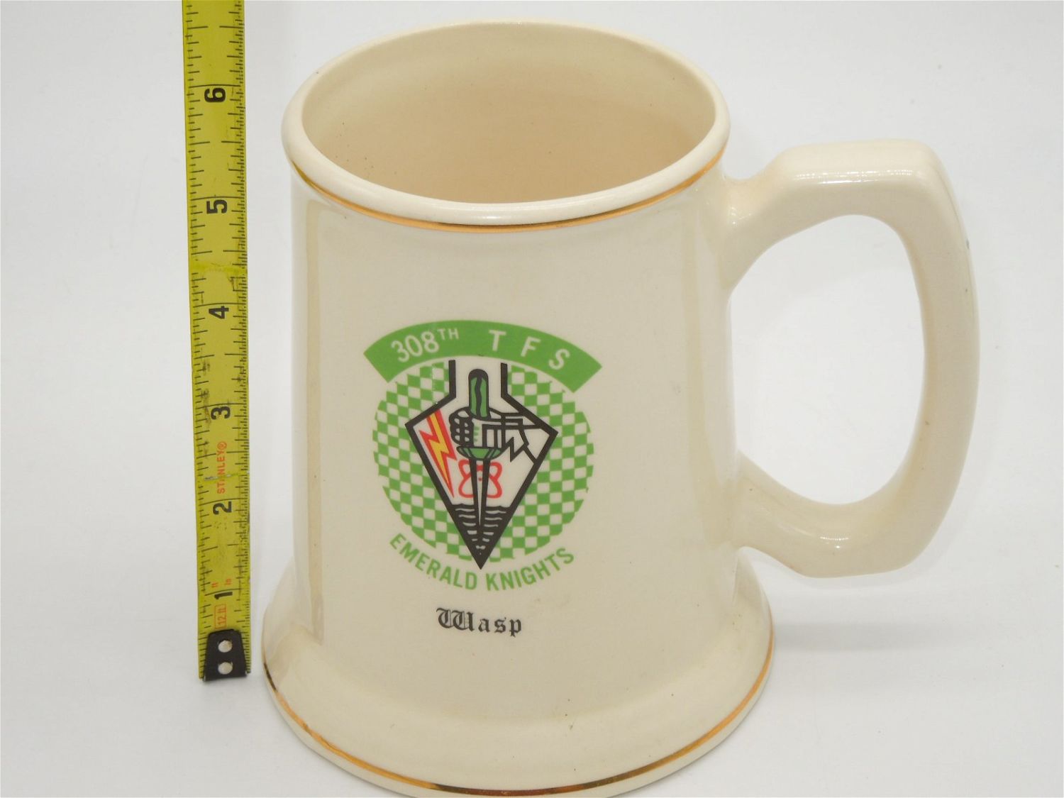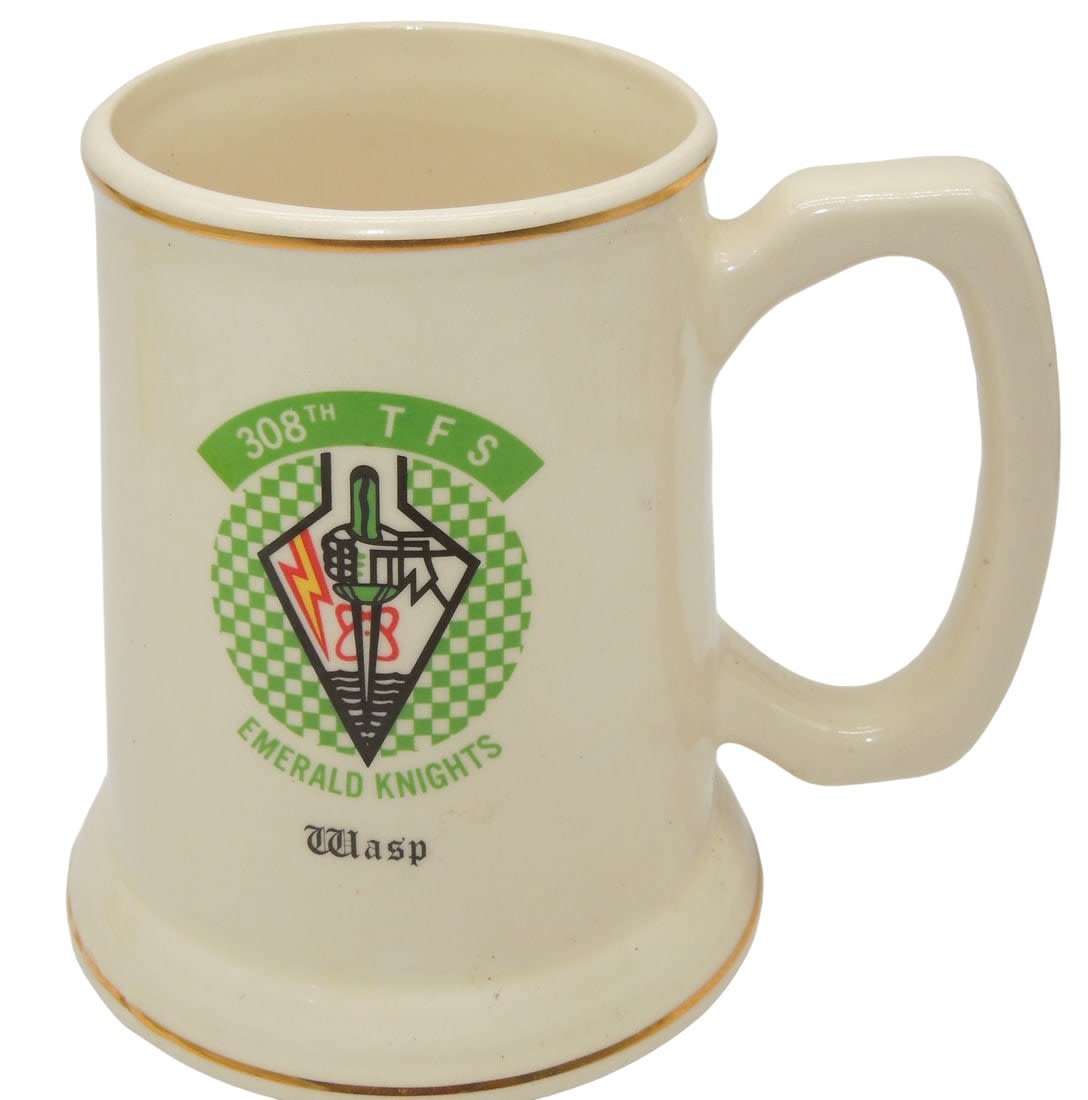 1960s 308th T.F.S. Tactical Fighter Squadron Emerald Knights WASP Mug. The 308th T.F.S. flew F-16s. Approximate size is 5.5 inches tall. Manufactured by Queens China Co. Nice overall condition.