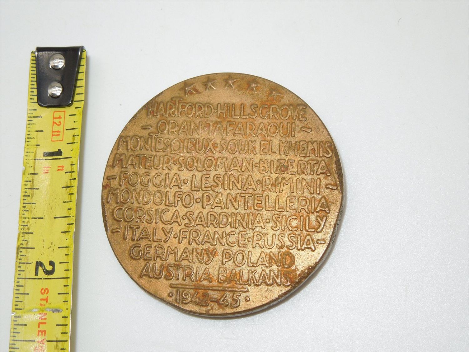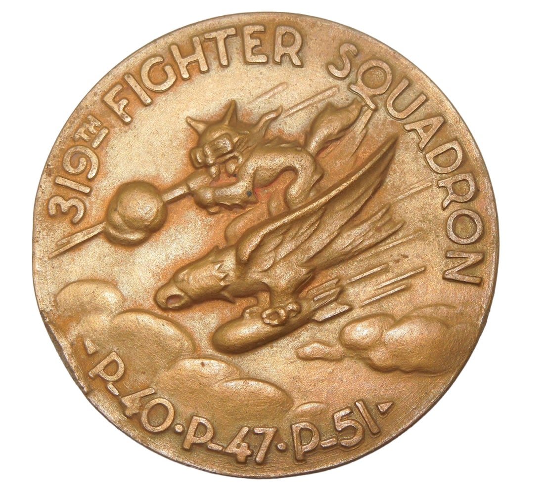 WWII Era 1942-1945 319th Fighter Squadron Challenge Coin. The 319th Fighter Squadron was attached to the 325th Fighter Group. On the reverse is a list of where the Fighter Squadron was activated and the combat missions involved throughout the war. The Diameter is 2 inches. The condition show wear from handling. Specifically, the rim has a ding. See photos.