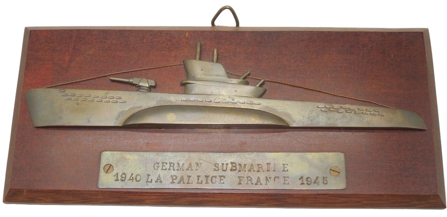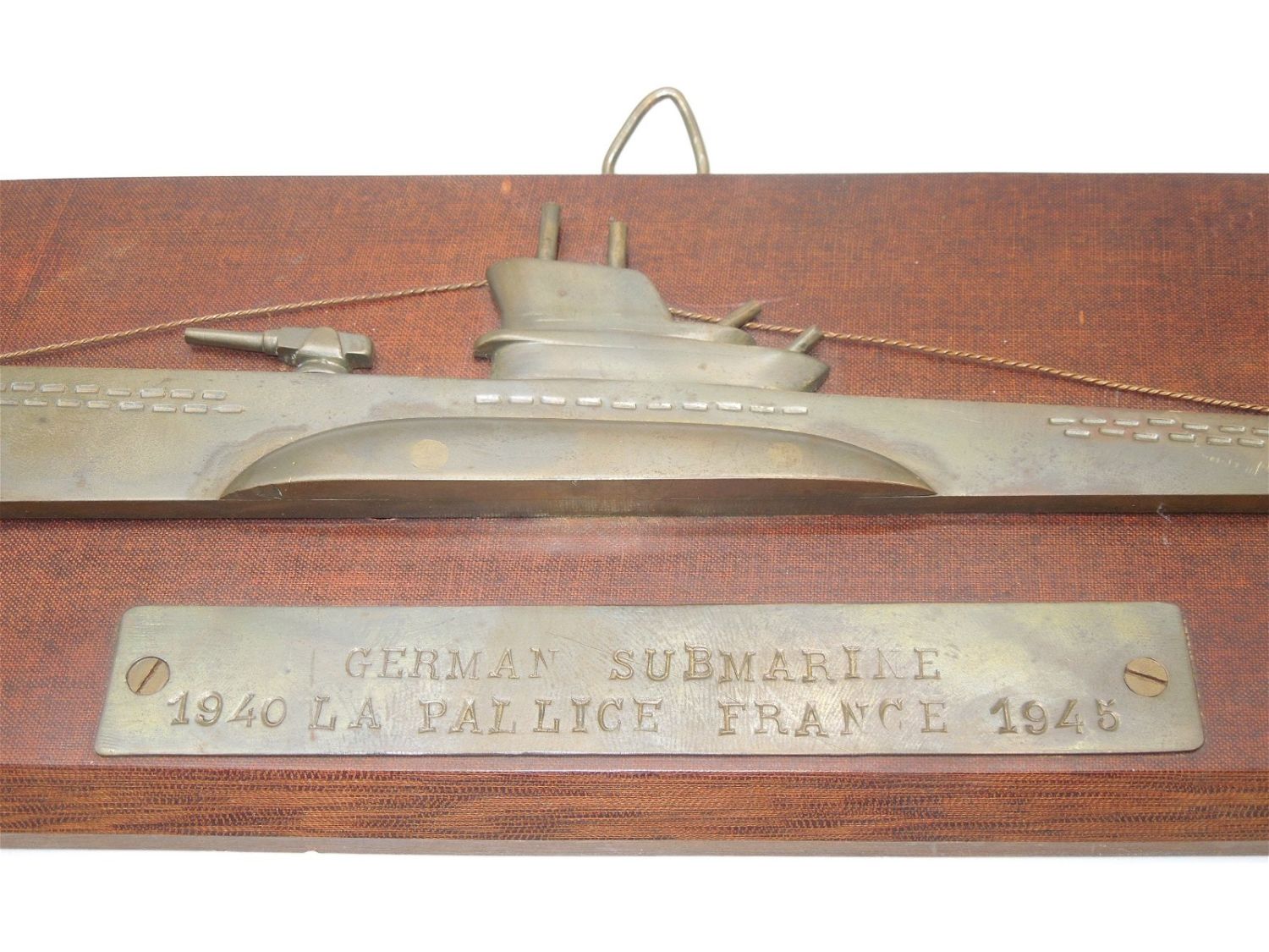WWII Era 1940-1945 German Kriegsmarine U-Boat Submarine La Pallice, France Wooden Plaque. This German Submarine is all medal and heavy. Under the Nazi Occupation of France, La Pallice was used as a U-Boat base from October 1941 when the 3rd U-boat Flotilla was moved there from its base in Kiel. Approximate size of the plaque is 11.5 x 4.75 inches. Nice condition for its age.