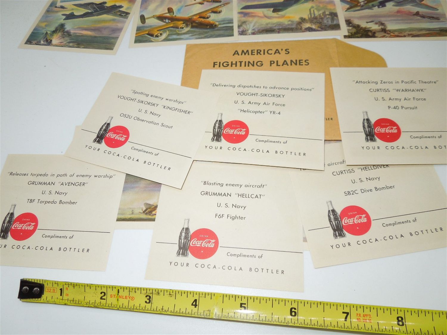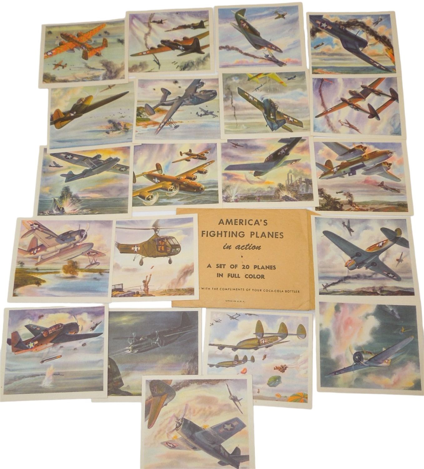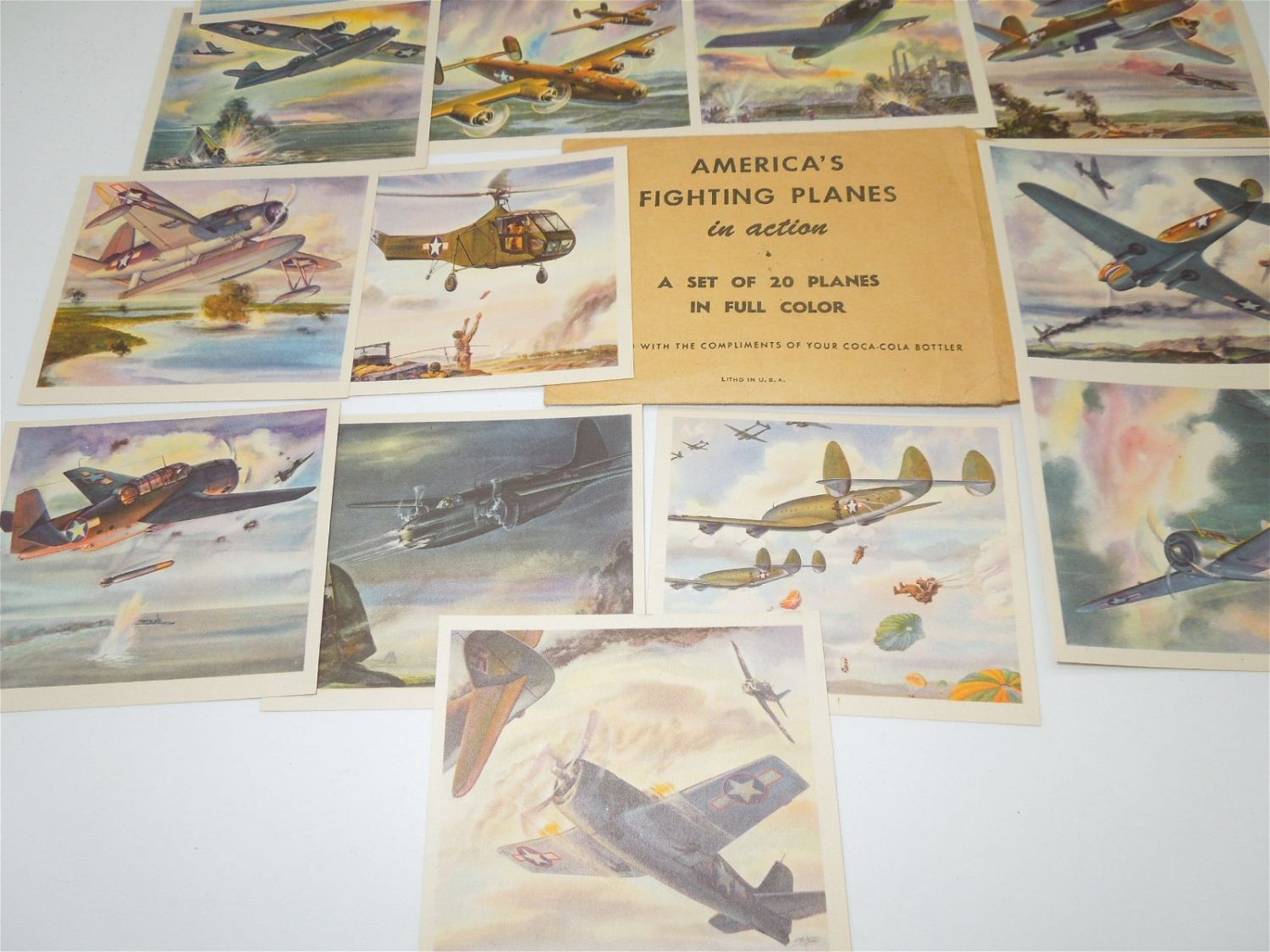1943 Coca-Cola Americas Fighting Planes in action card set 1-20. Includes original envelope. Presented With The Compliments of Your Coca-Cola Bottler. Approximate size is 3.5 x 3 inches. Cards are in nice condition for their age.