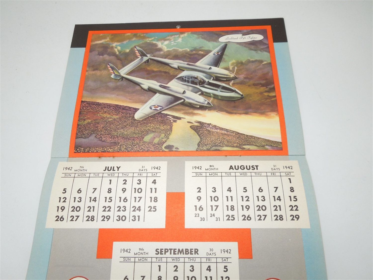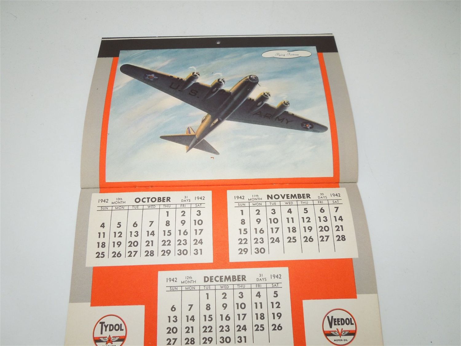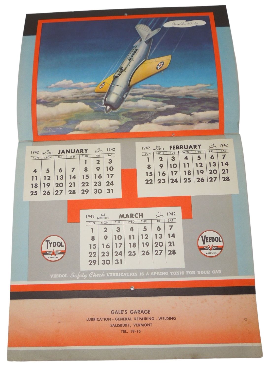 WWII Era 1942 Advertisement for Tydol Gasoline & Veedol Motor Oil Calendar. This calendar was produced for Gale’s Garage. The calendar shows some aircrafts- the Curtiss Dive Bomber, Bell Airacobra, Lockheed P-38 Fighter and Flying Fortress. There are also Veedol Safety Checks, Household Hints and Recipes. Good condition for its age.