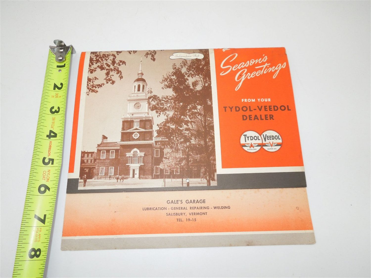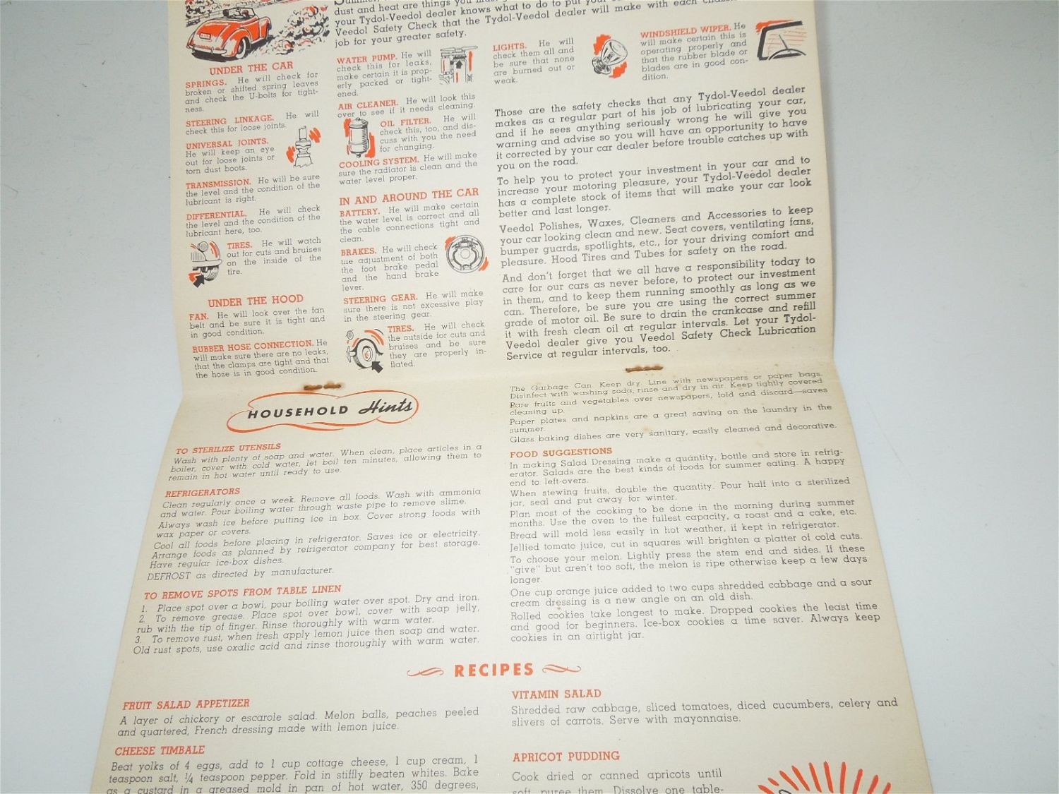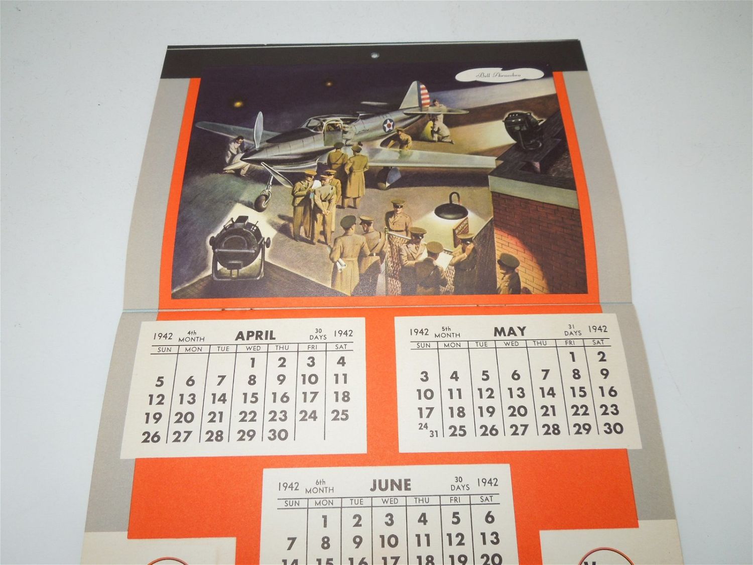 WWII Era 1942 Advertisement for Tydol Gasoline & Veedol Motor Oil Calendar. This calendar was produced for Gale’s Garage. The calendar shows some aircrafts- the Curtiss Dive Bomber, Bell Airacobra, Lockheed P-38 Fighter and Flying Fortress. There are also Veedol Safety Checks, Household Hints and Recipes. Good condition for its age.