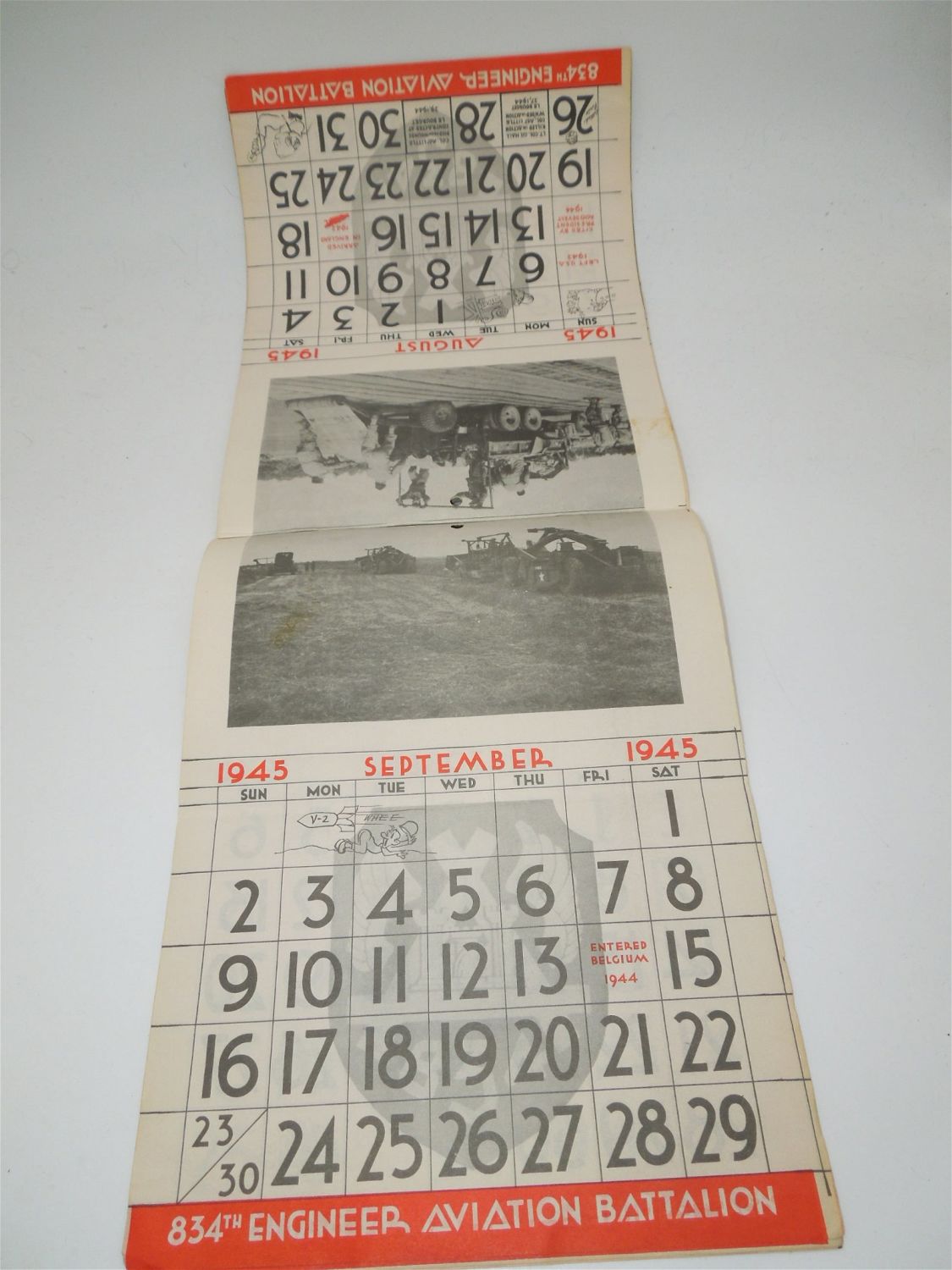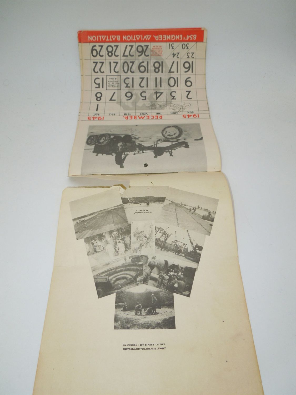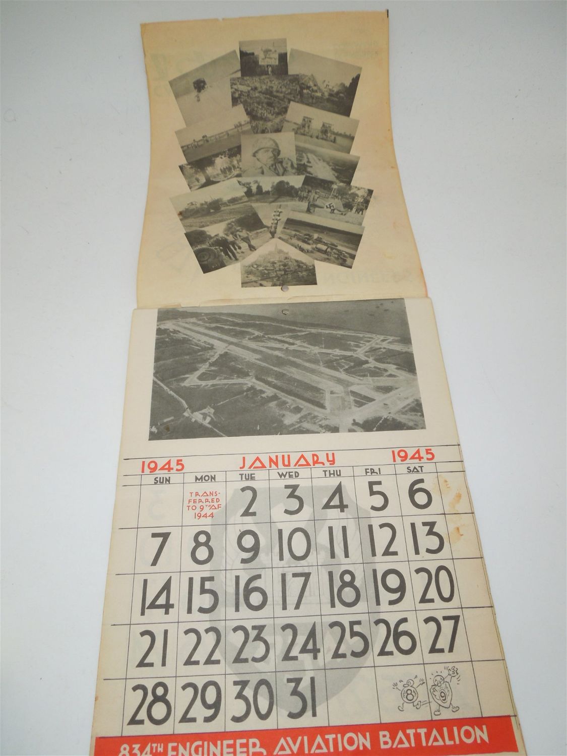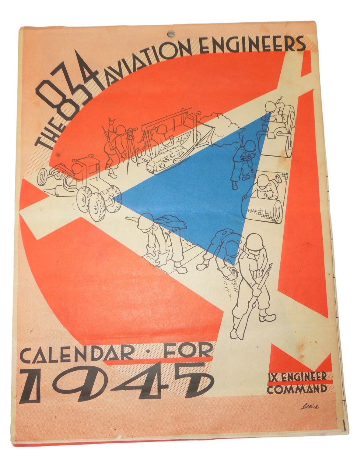 WWII 1945 IX Engineer Command, 834th Engineer Aviation Battalion Calendar. Cover design by Lettick. There is spotting & soiling from age. Also the back cover has a tear.