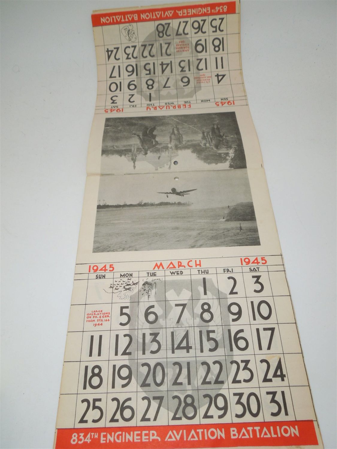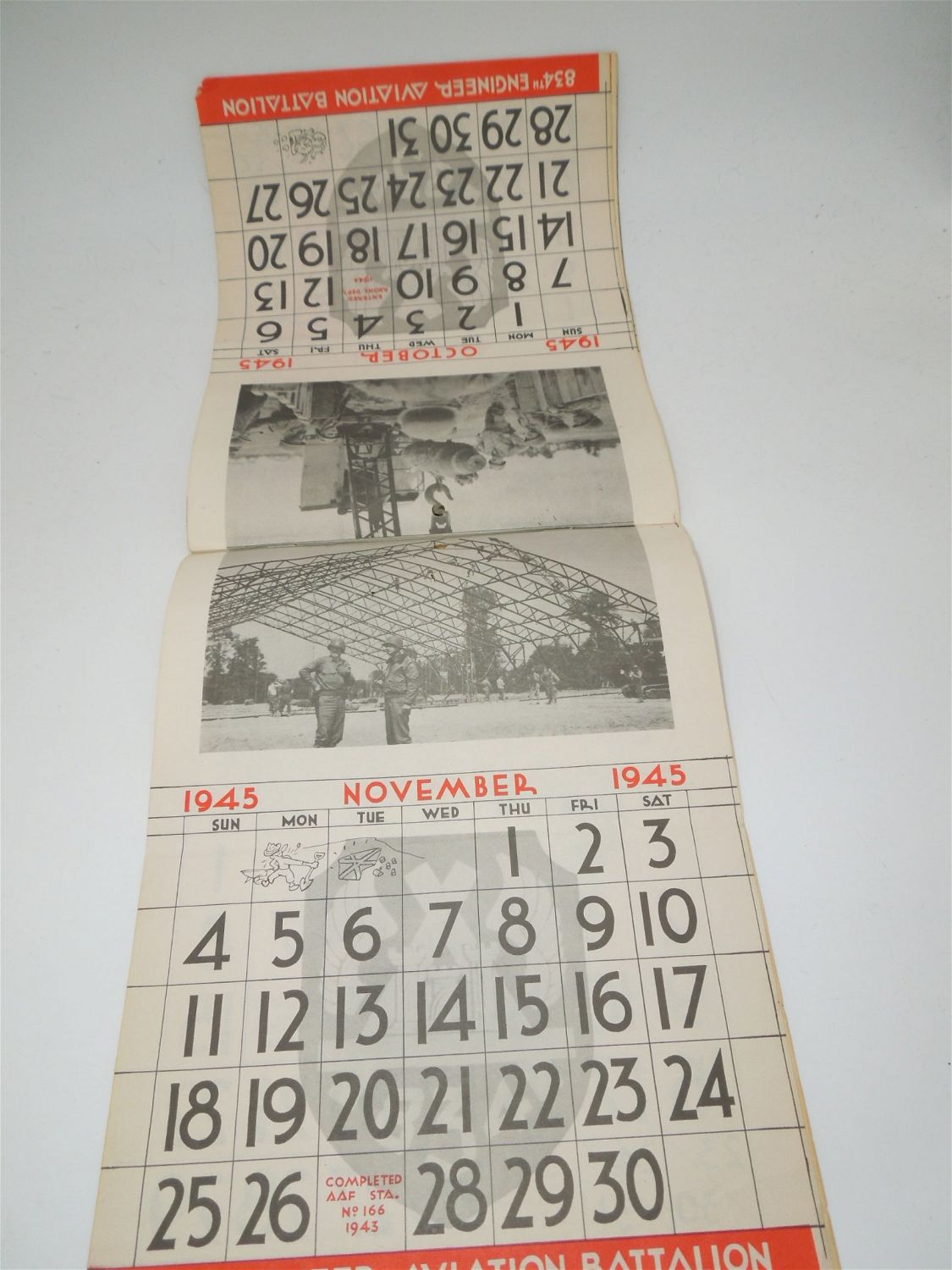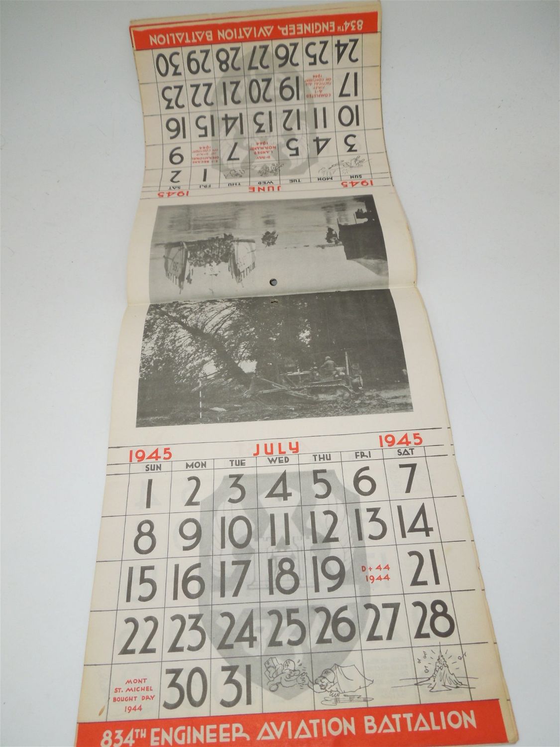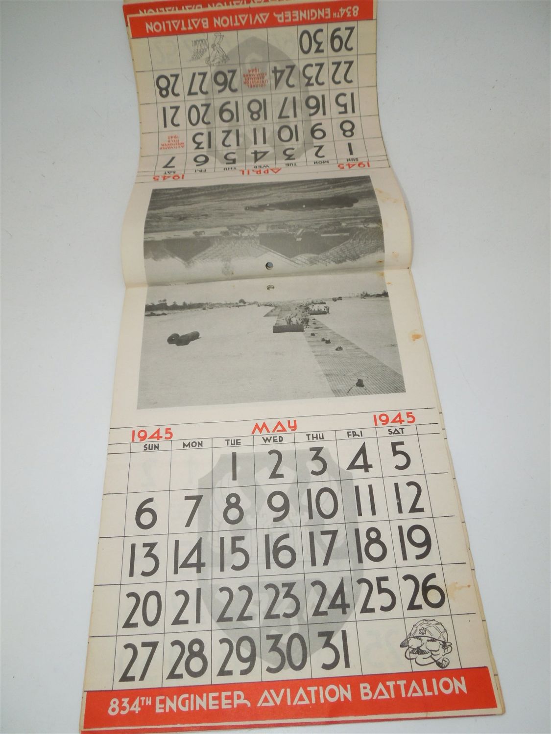 WWII 1945 IX Engineer Command, 834th Engineer Aviation Battalion Calendar. Cover design by Lettick. There is spotting & soiling from age. Also the back cover has a tear.