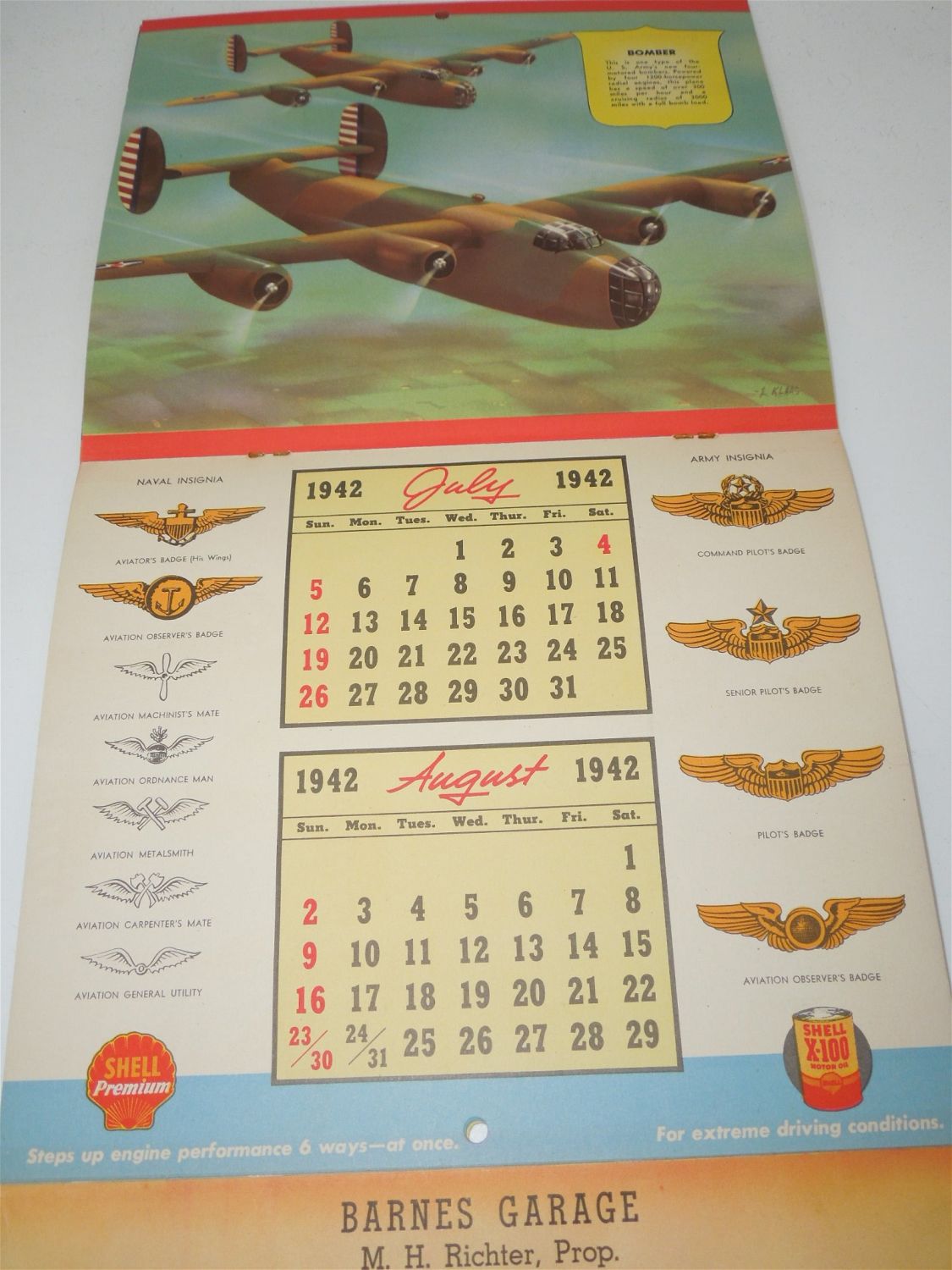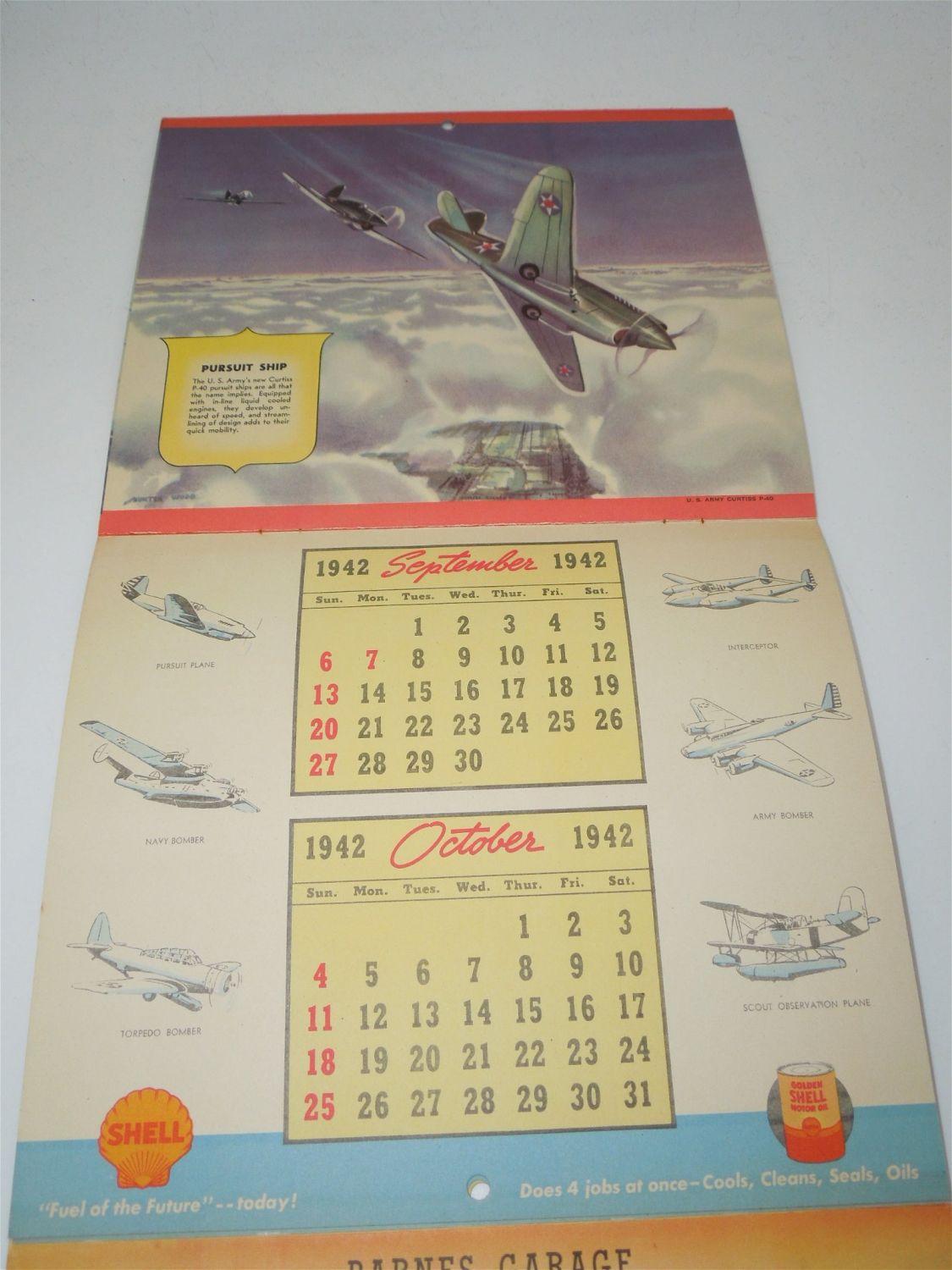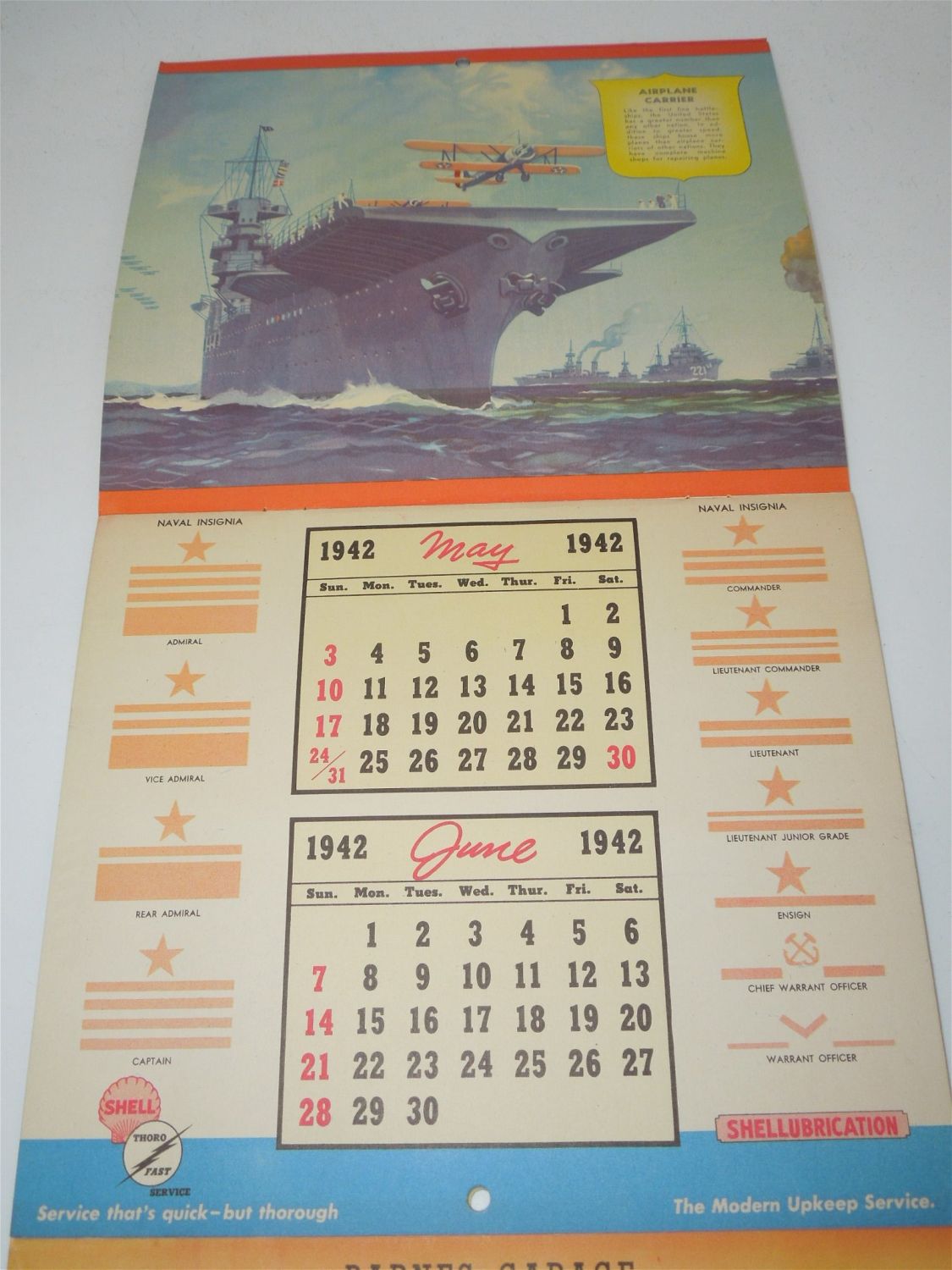 WWII 1942 Advertisement for Shell Oil & Barnes Garage. Included in this calendar are Navy Ships, Army Air Corps Aircrafts, Navy Insignia, Marine Insignia, and Army Insignia. The bottom left hand corner has been clipped off, and foxing on the back cover otherwise, good used condition.