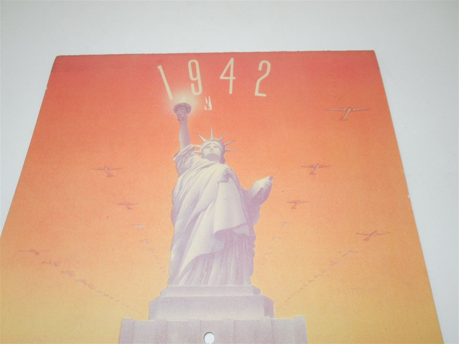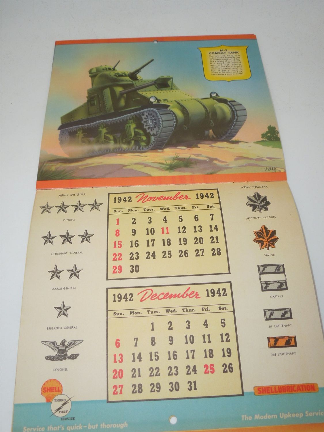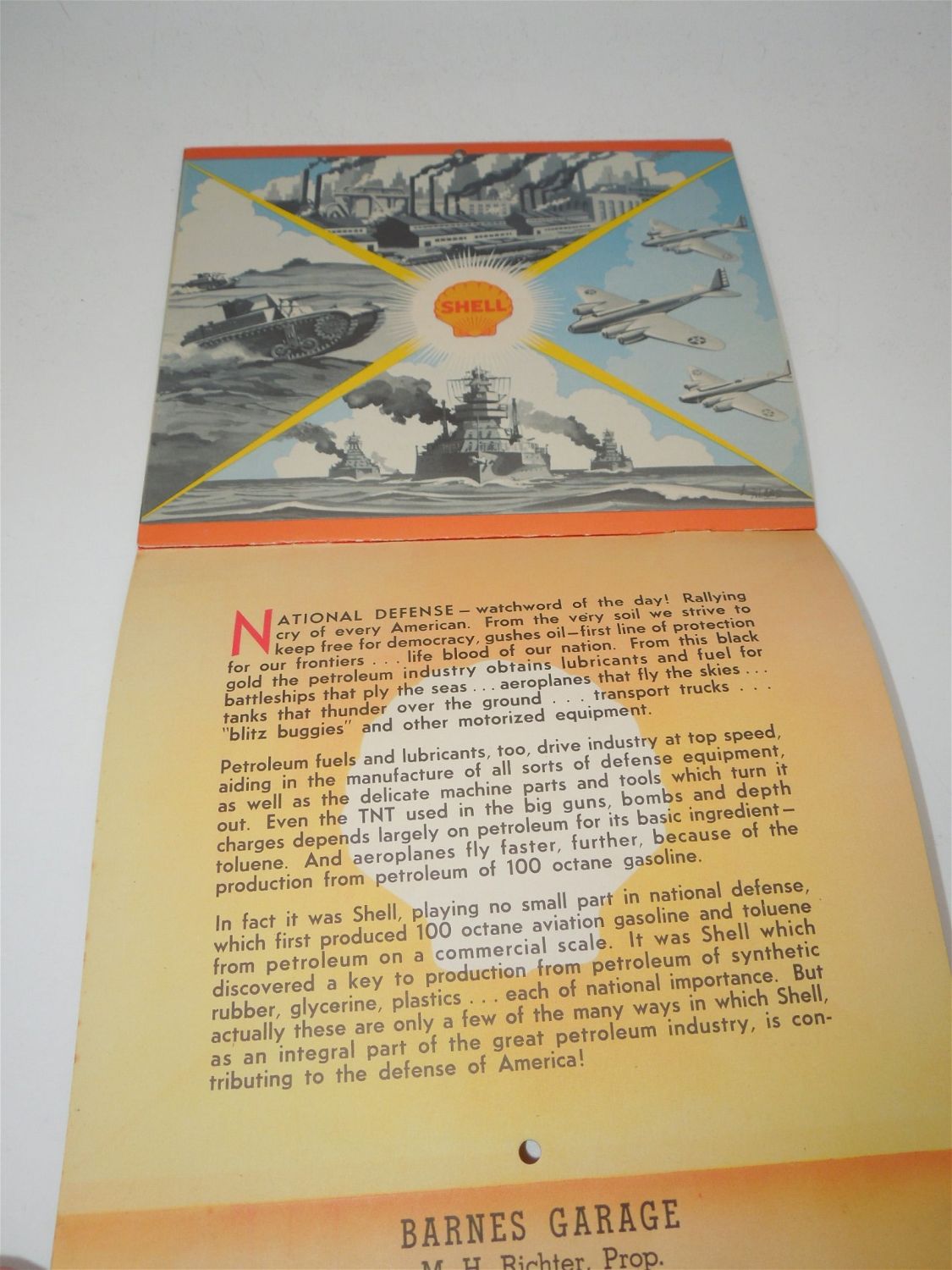 WWII 1942 Advertisement for Shell Oil & Barnes Garage. Included in this calendar are Navy Ships, Army Air Corps Aircrafts, Navy Insignia, Marine Insignia, and Army Insignia. The bottom left hand corner has been clipped off, and foxing on the back cover otherwise, good used condition.
