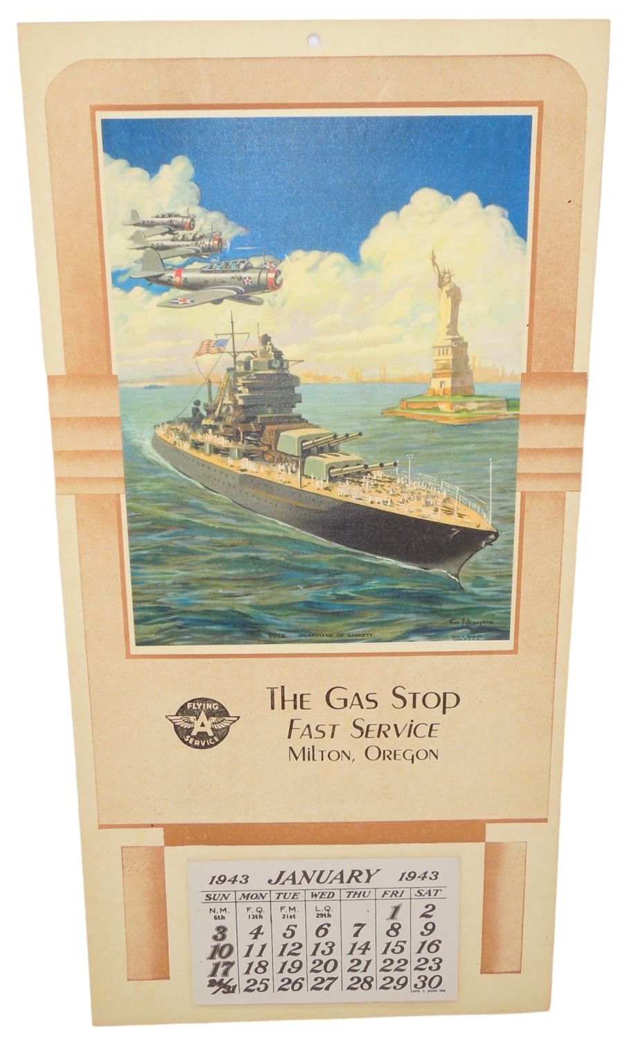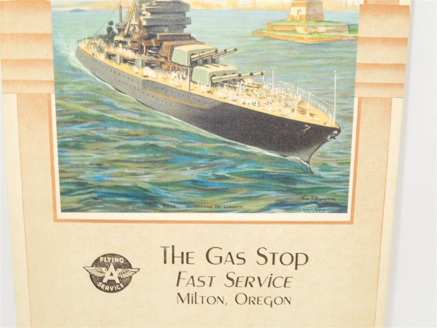 WWII Era 1943 Battleship, Douglas TBD Devastators & Lady Liberty Calendar. From an internet search this piece is titled, Guardians of Liberty. It depicts the Statue of Liberty in the background and a Battleship and (3) Douglas TBD Devastators. Flying A Service, The Gas Stop is the advertisement that put out this calendar. The artist is Thos. A. Slaughter. Nice condition for its age.