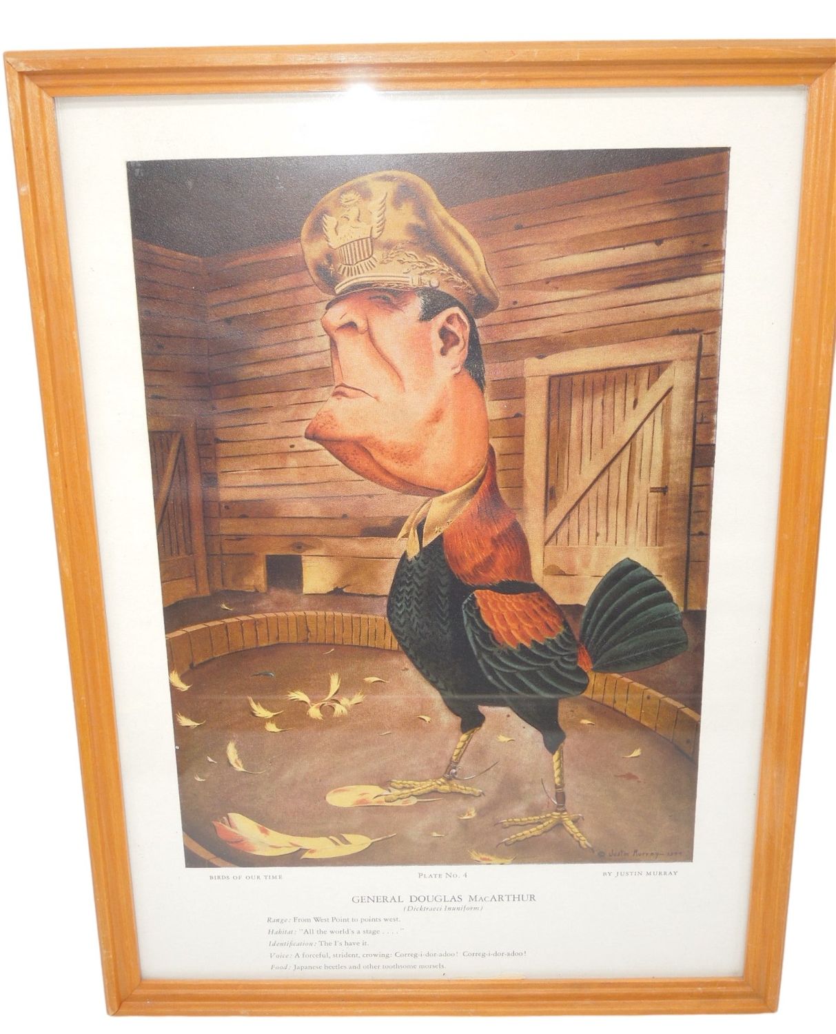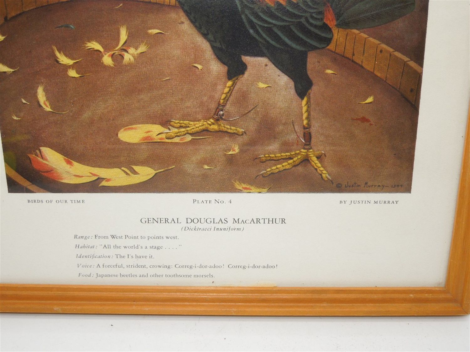 WWII Army General Douglas MacArthur titled Birds Of Our Time Framed Picture. Plate No. 4. Designed by Justin Murray. Approximate size of frame is 9.5 x 13 inches. Unfortunately, we are unable to see what is on the reverse because this piece is professionally framed. Nice displayed condition.