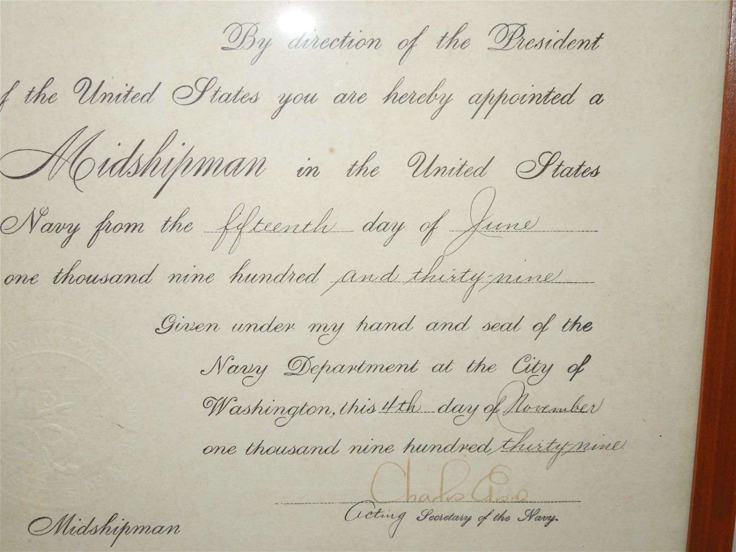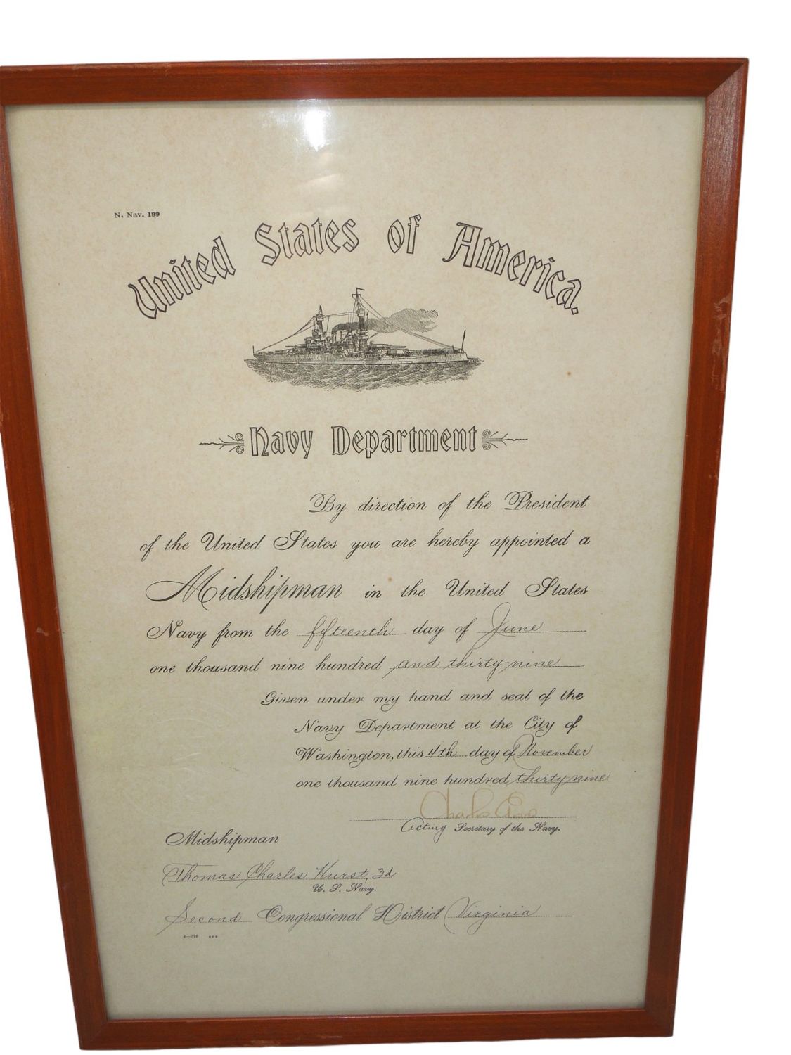 USNA Naval Academy Annapolis Named Midshipman Promotion Document. Thomas Charles Hurst III was a captain in the U.S. Navy. Hurst was a graduate of the U.S. Naval Academy, Class of 1943, serving until 1970, when he retired to assume the presidency of Norfolk, Baltimore & Carolina Lines, a local shipping company. Decorated for valor with the Bronze Star for submarine action in the Pacific during World War II, Capt. Hurst was also a veteran of Korea and Vietnam, and was qualified in underwater demolition and submarine rescue/salvage operations. Approximate size of frame is 15.75 x 10 inches. This is a nice framed document.