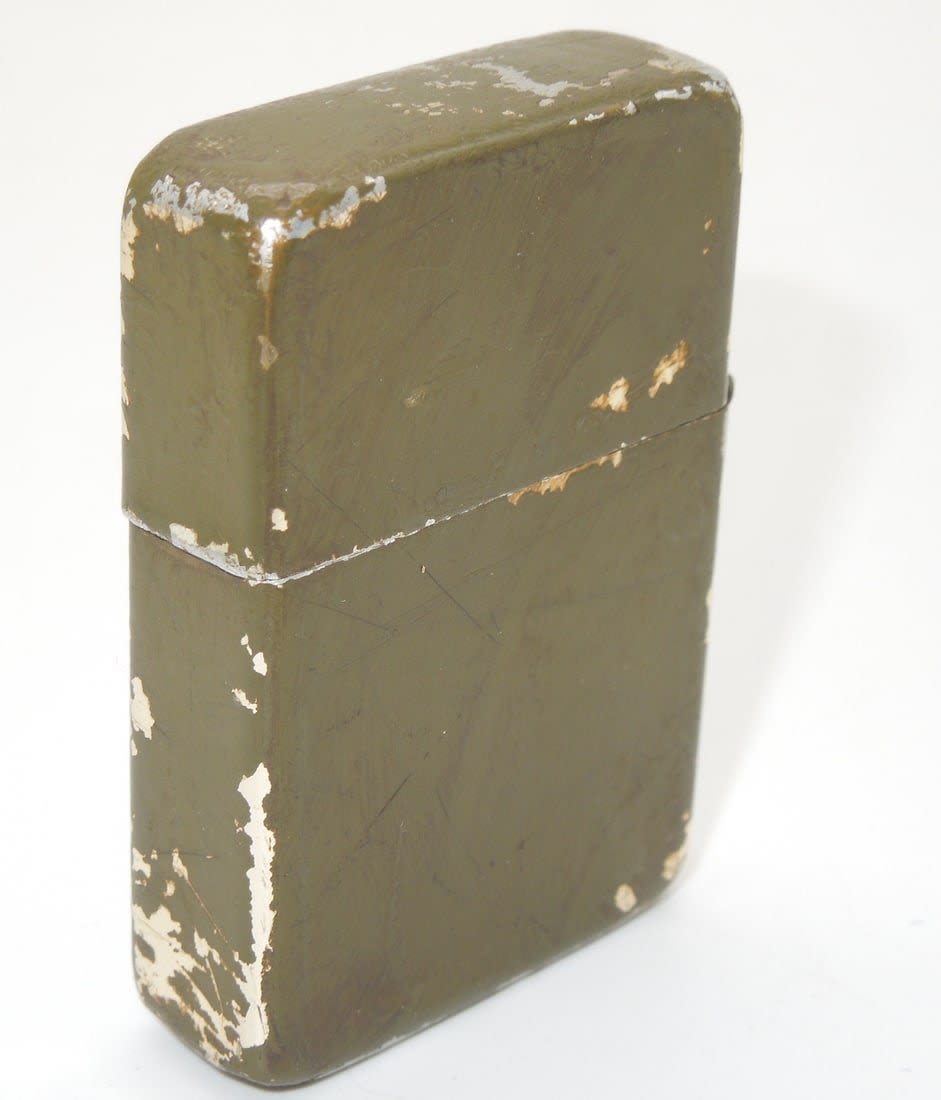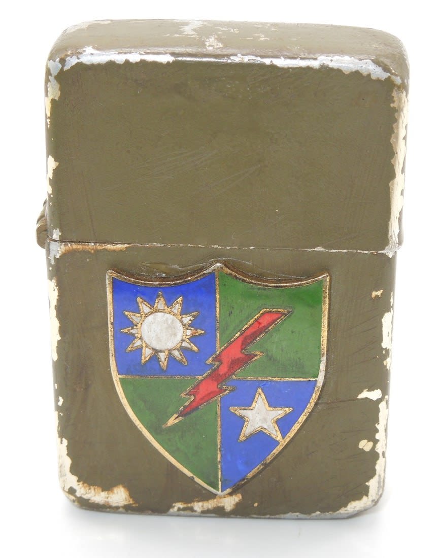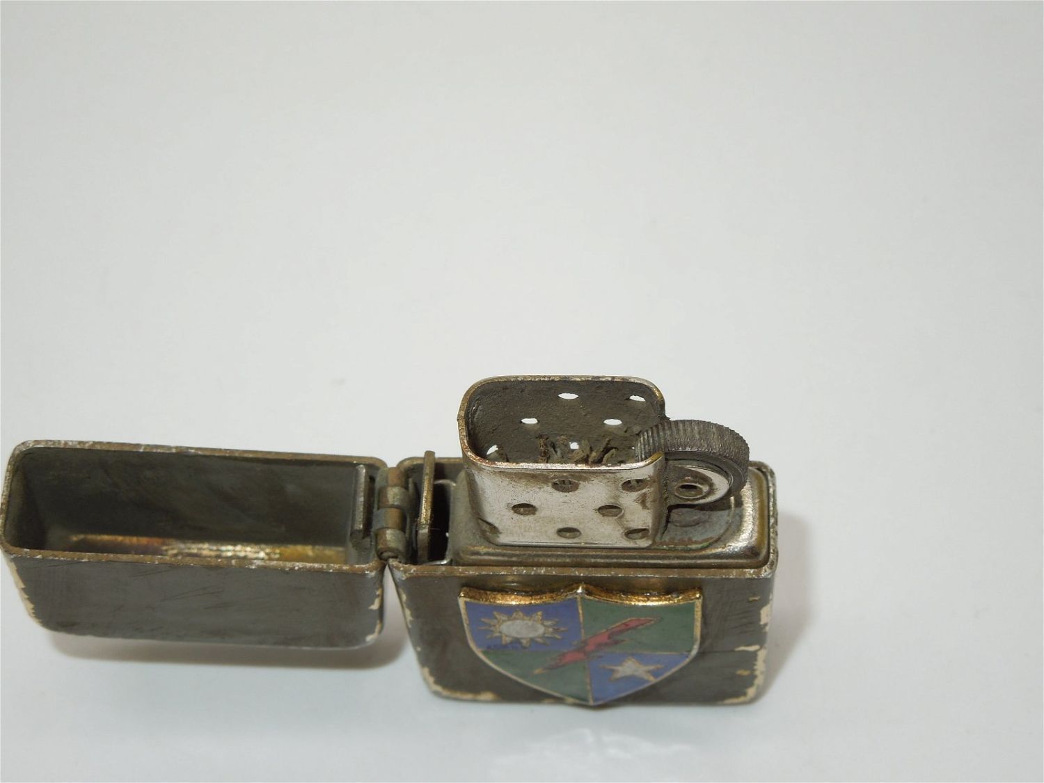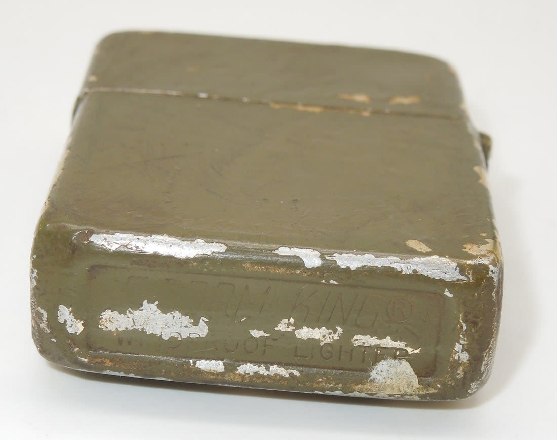 WWII Merrill’s Marauders Army 75th Ranger Regiment Green Crackle Cigarette Lighter. Maker marked is Storm King. This lighter does spark when used. Paint chips missing throughout the lighter. The DUI is in very good shape.