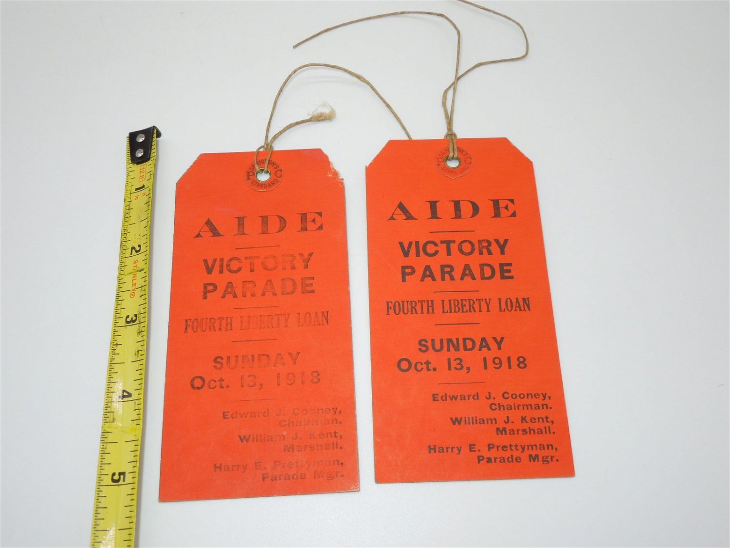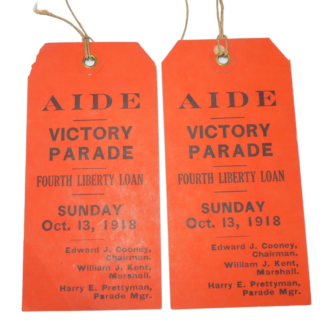 WWI 1918 dated, double sided pair of orange colored paper identification tags for an Aide to the Victory Parade, Fourth Liberty Loan, on October 13, 1918. Good condition