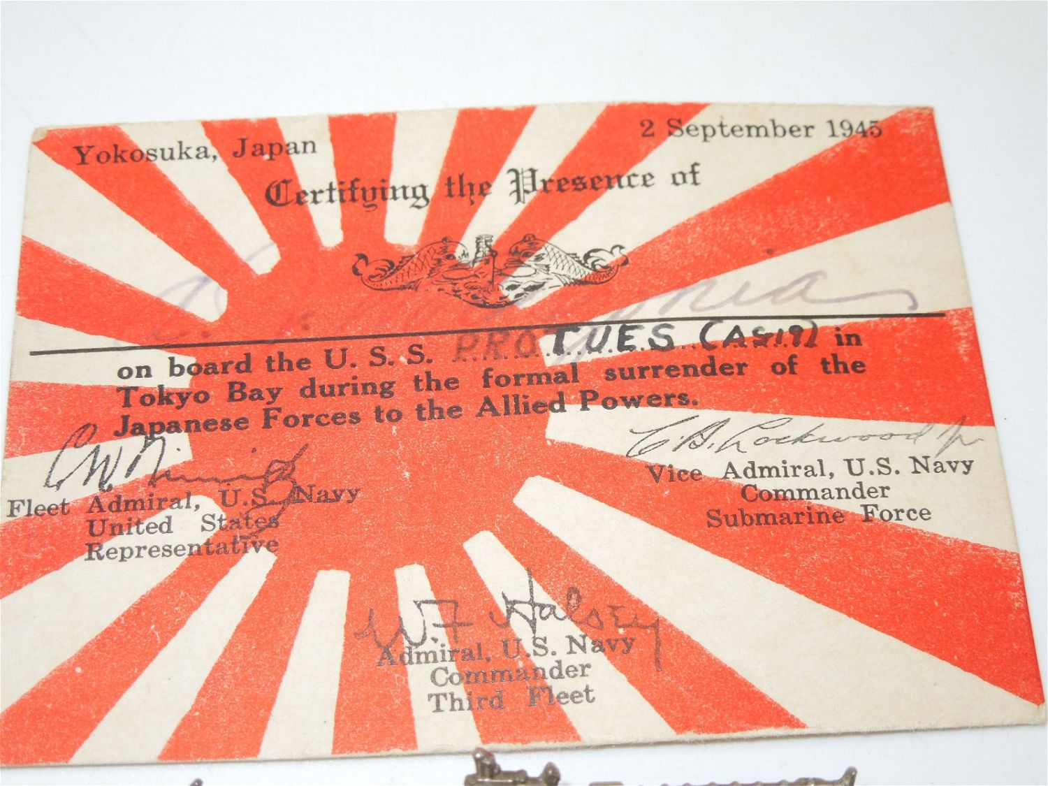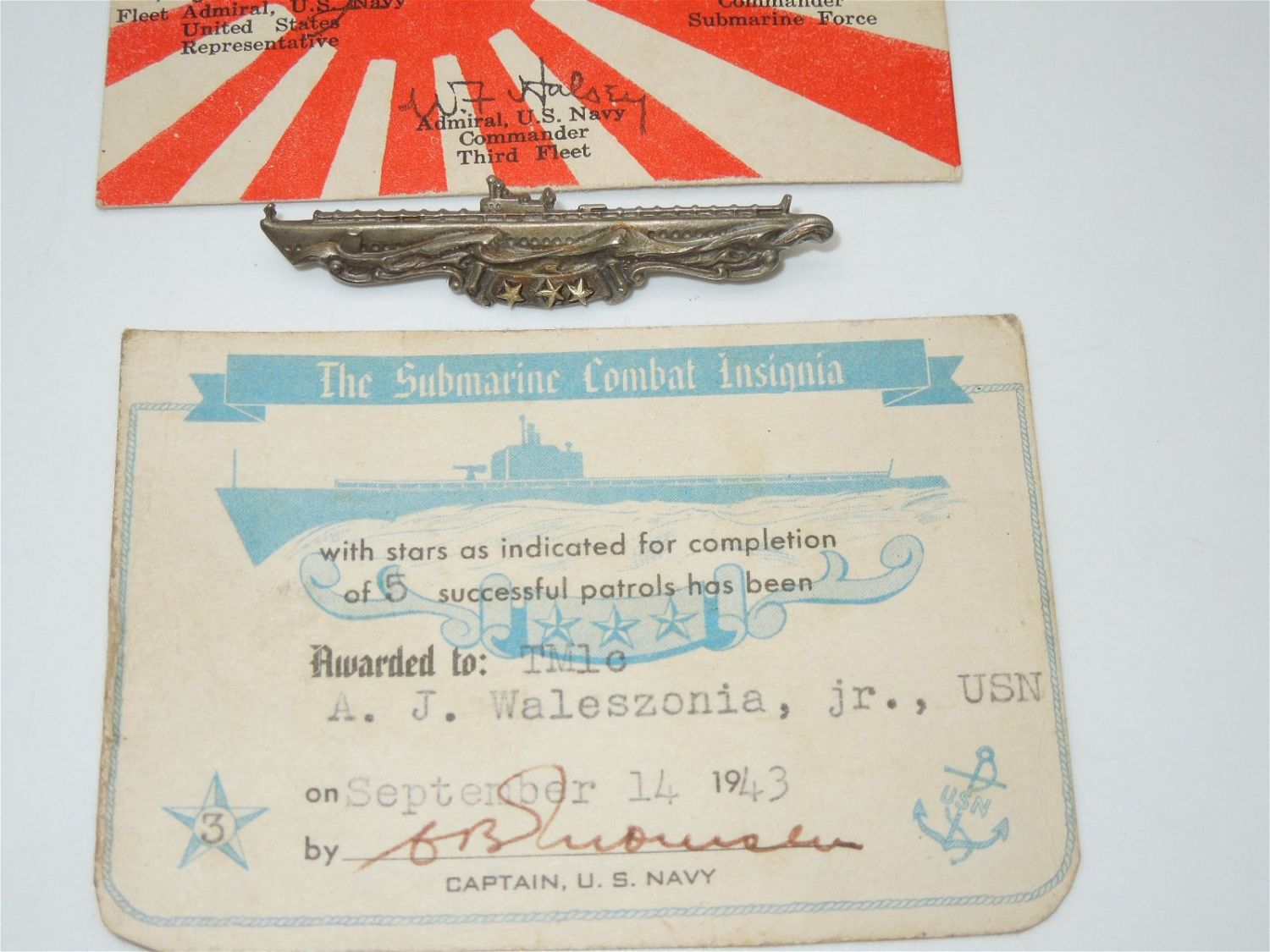 WWII Era Named Navy Submarine USS Proteus Badge & Surrender Group named to Torpedoman Mate 1st Class (TM1c) A. J. Waleszonia, Jr. The group includes: 1945 named US Navy Japanese Surrender Souvenir Card, 1943 named Submarine Combat Insignia Card, Submarine Combat Patrol Badge with three stars. Maker is Amico sterling. The surrender card was given on board the U.S.S. Protues (AS-19) in Tokyo Bay during the formal surrender of the Japanese Forces to the Allied Powers. Very good overall condition for its age.