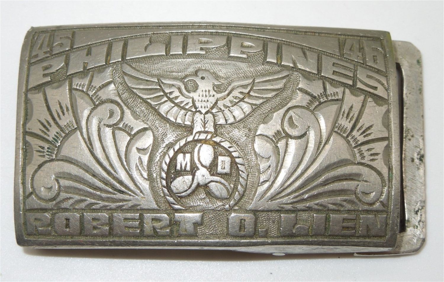 WWII Era USN Navy Philippines Named Belt Buckle. Named to Motor Machinists Mate Robert O. Lien. No makers mark seen. Nice condition for its age.