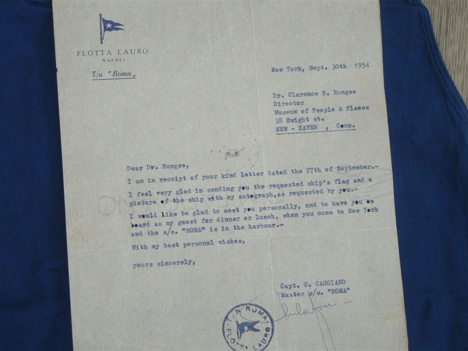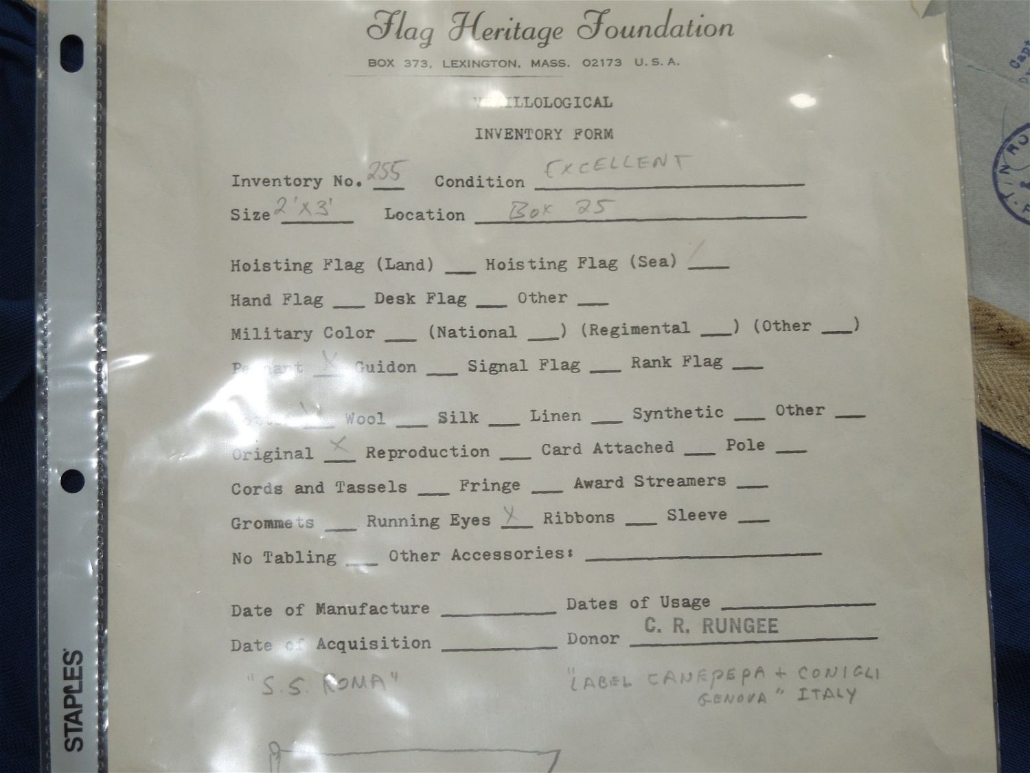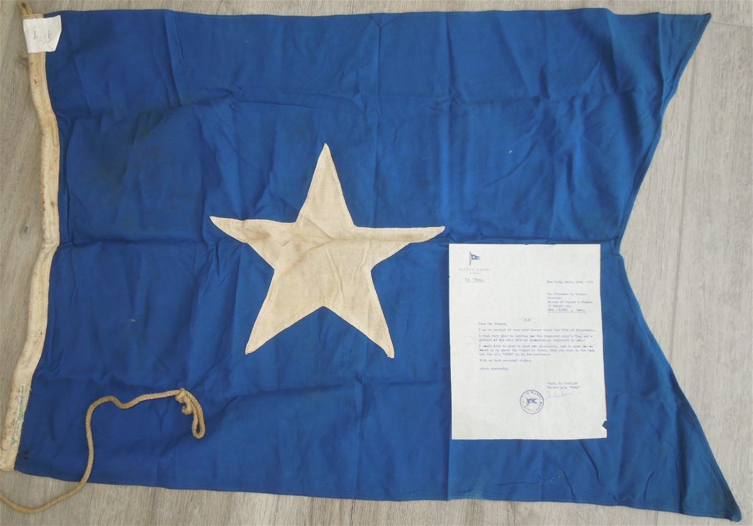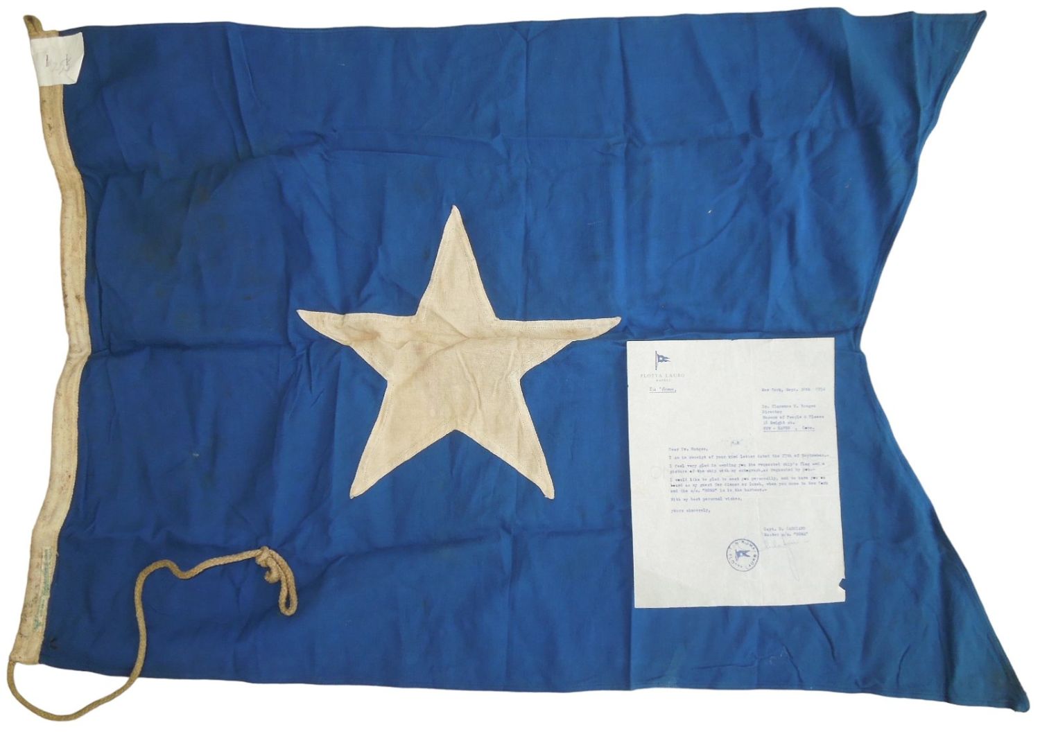 Original Dr. Clarence Rungee collection flag. Measures 2 x 3 feet. Well used condition. With inventory sheet and original 1954 letter.