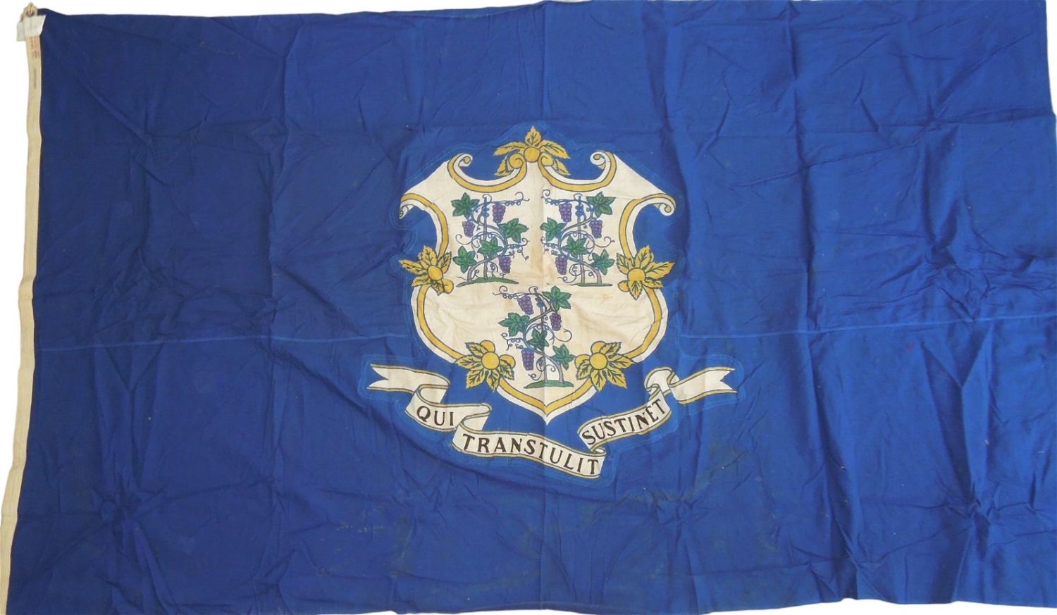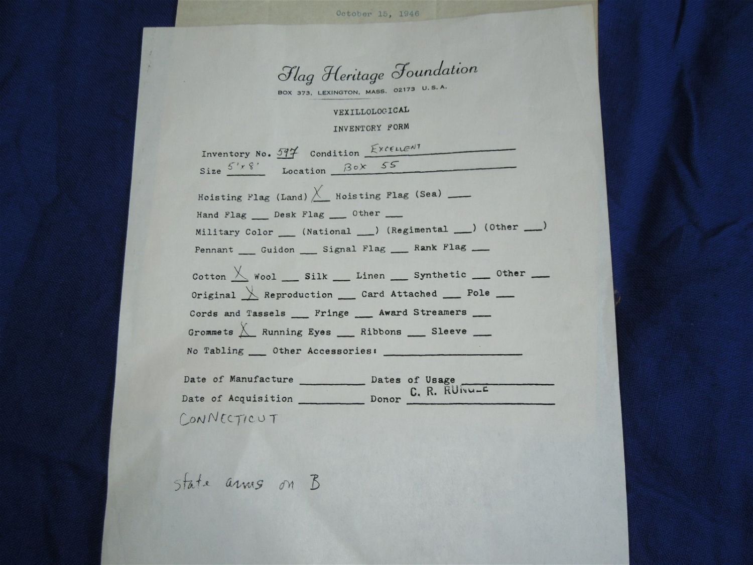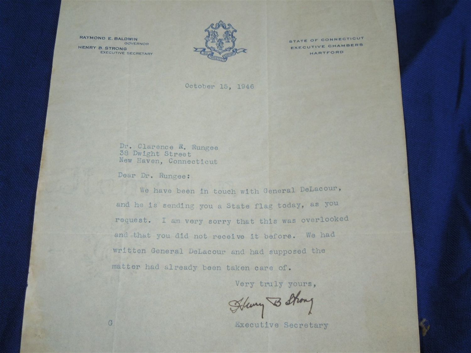 WWII cotton flag measuring 5 x 8 feet, in well used condiiton, accompanied by a letter to Dr. Clarence Rungee from the state transmitting the flag.