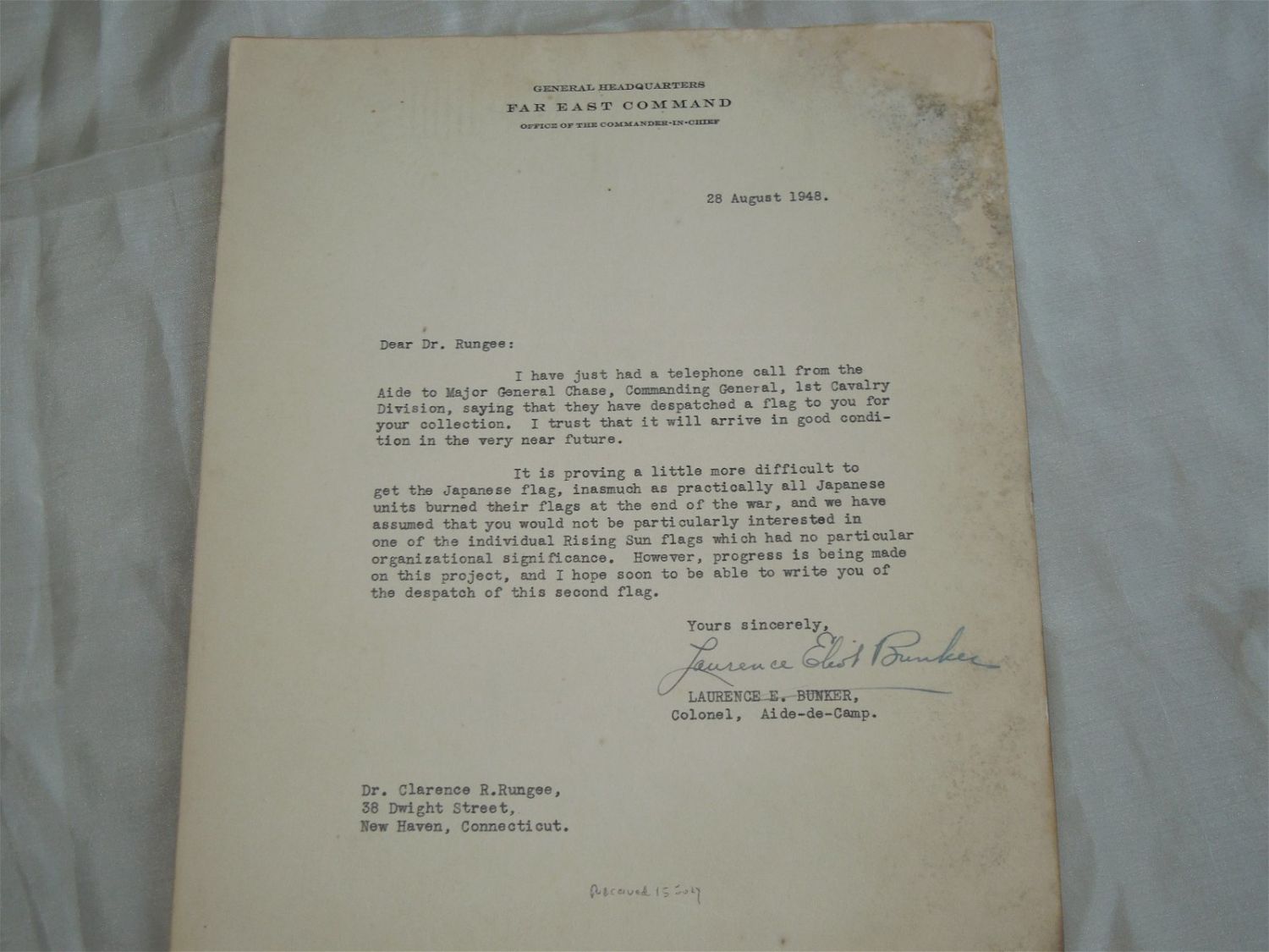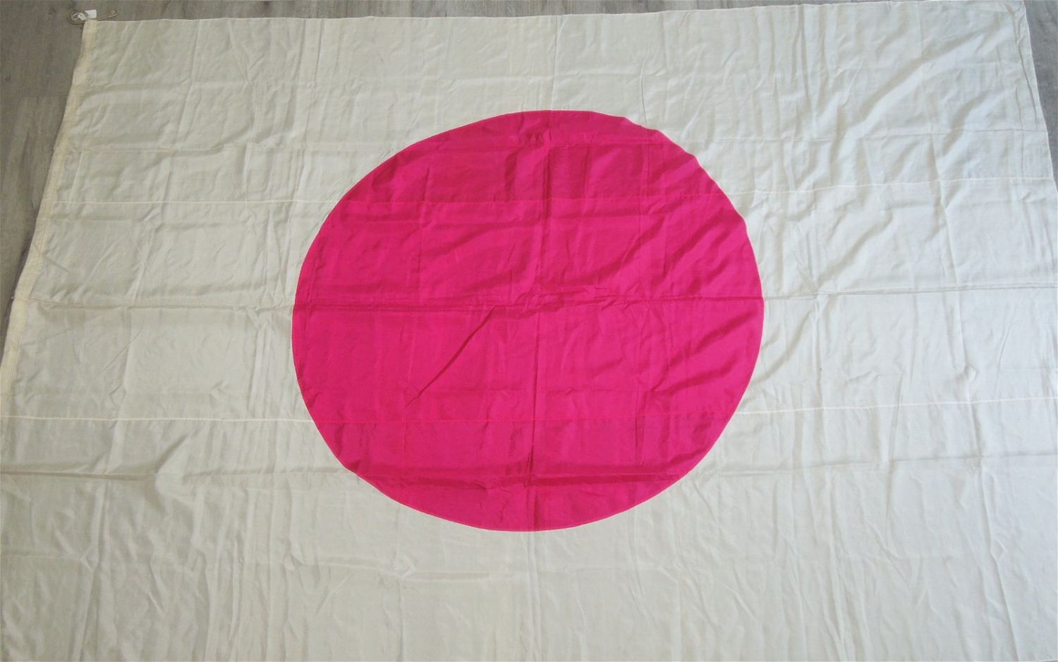 Original WWII silk flag accompanied by a 1948 letter from Aide de Camp to General MacArthur sending the flag. Paper is dry mounted and has some staining in the upper corner. Measures 5 feet by 7 feet 4 inches, with pole ties.