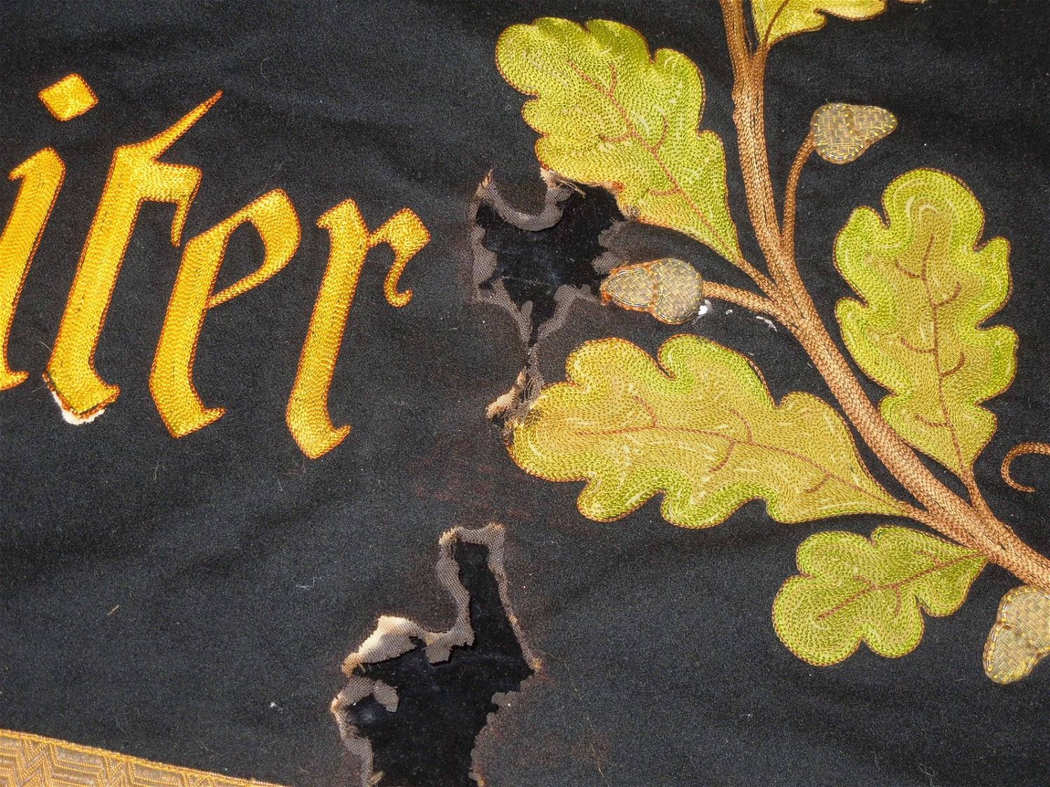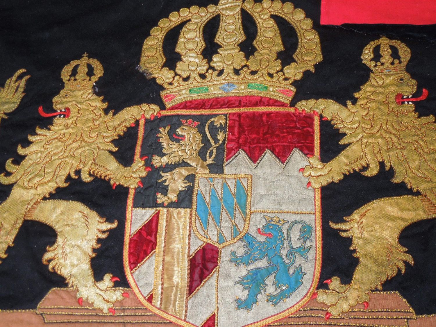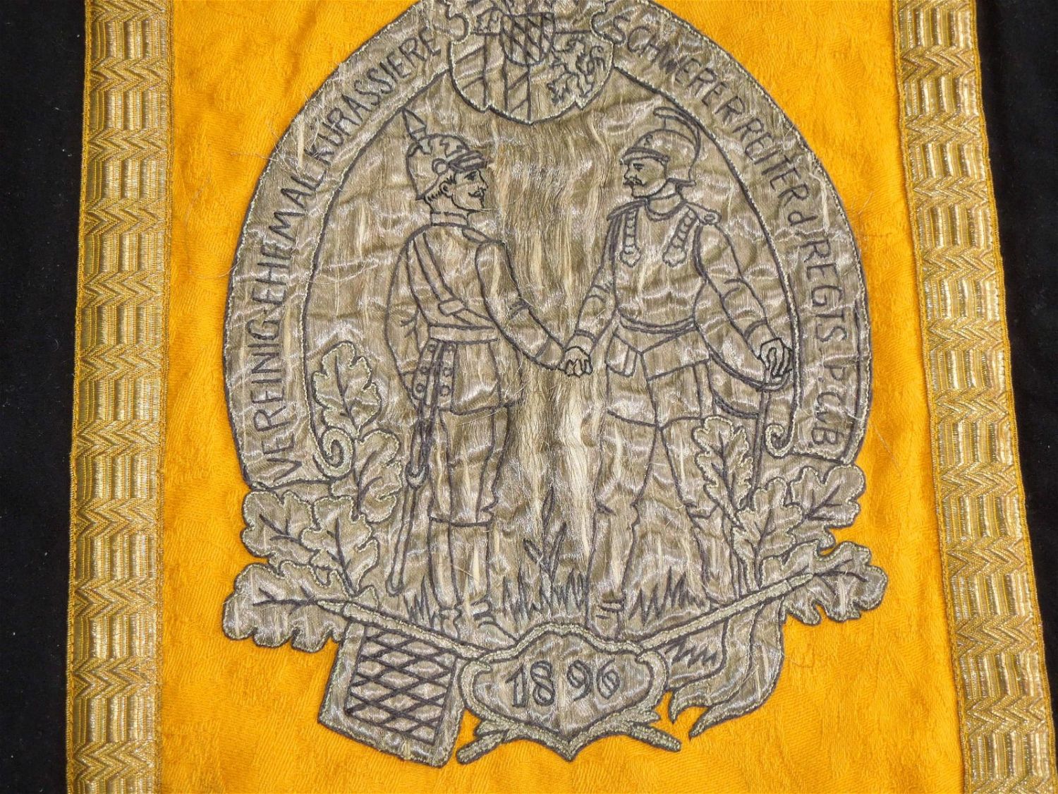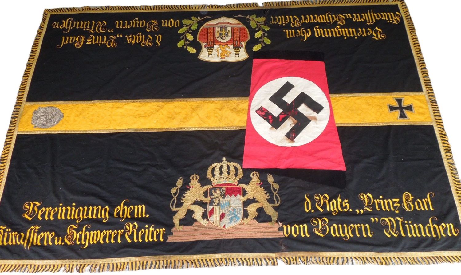 Spectacular Imperial German elaborate bullion embroidered official, decorative trestle table cover of the Bavarian Heavy Cavalry Rider Regiment Prince Carl of Bavaria, dated 1896. In April of 1944 the old Munich city hall was destroyed during a US bombing raid. Brought there for safe keeping, this important artifact was rescued but unfortunately did suffer some burn damage. In a show of defiance and resolve, the mayor of Munich, Karl Fiehler ordered a 40 inch x 26 inch NSDAP flag to be sewn over the damaged portion of the cover in the center which does not affect the art embroidery or wording. This was acquired from a bunker below the old Munich city hall and brought home by a WWII US Army Captain. The Captain sold this piece to a well-known antique gun dealer, who subsequently resold it to an American collector in 1969. It has been in that collection for 54 years until its current offering. Further details: 81 inch x 119 inch black velveteen material with a 1 inch wide gold wire tape perimeter and 2 inch black and yellow/gold fringe. A 8 inch wide yellow-gold stripe with 1 inch wide gold wire borders creates a center panel covering the entire length. One end has a 9 inch x 7 1/4 inch black silk Iron Cross with a silver wire border. When placed on an approximately 27 inch wide trestle table both draped sides exhibit the magnificent art work embroidery. One side has a 20 1/2 inch x 27 inch relief gold bullion/multi-color Bavarian crowned coat-of-arms. Flanking the center piece in 4 1/2" embroidered yellow-gold letters is Vereinigung ehem. Kurassiere u. Schwerer Reiter – d. Rgts. Prinz Graf von Bayern Munchen. The opposite draped side has the same wording which encompasses a 17 1/2 inch x 16 inch colorful shield of the arms of the city of Munich – a lion, the twin tower gate and the Munchen Kidnl. All within oak leaf branches.