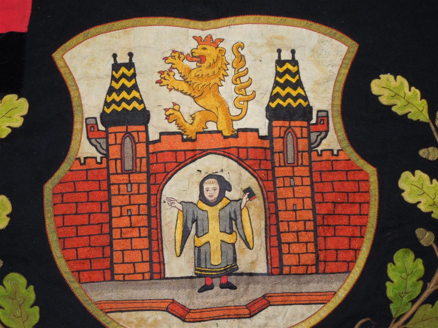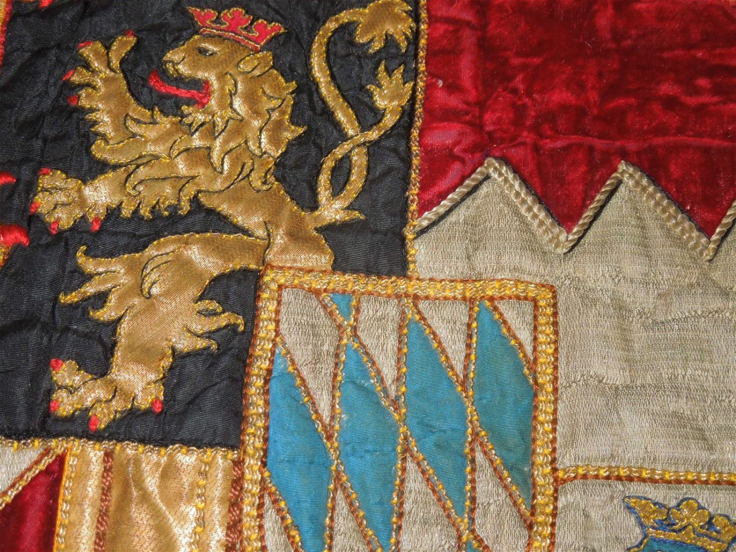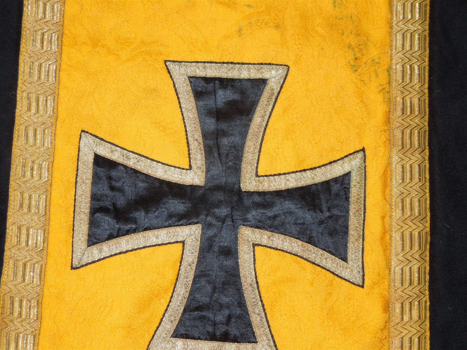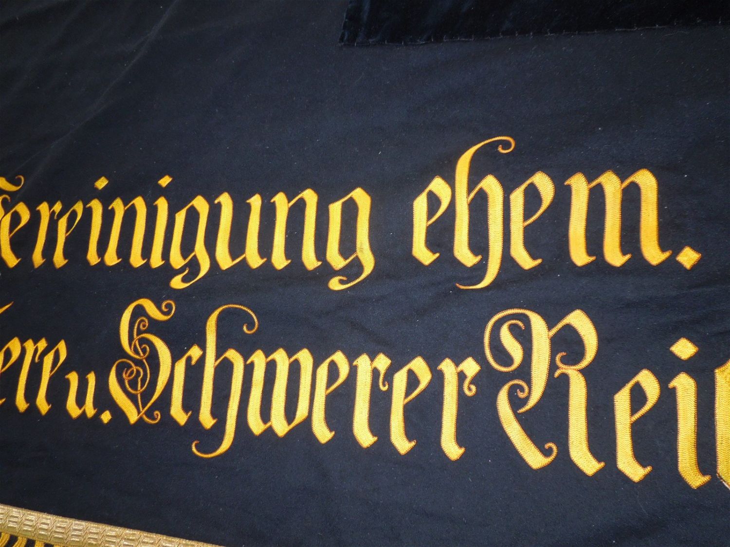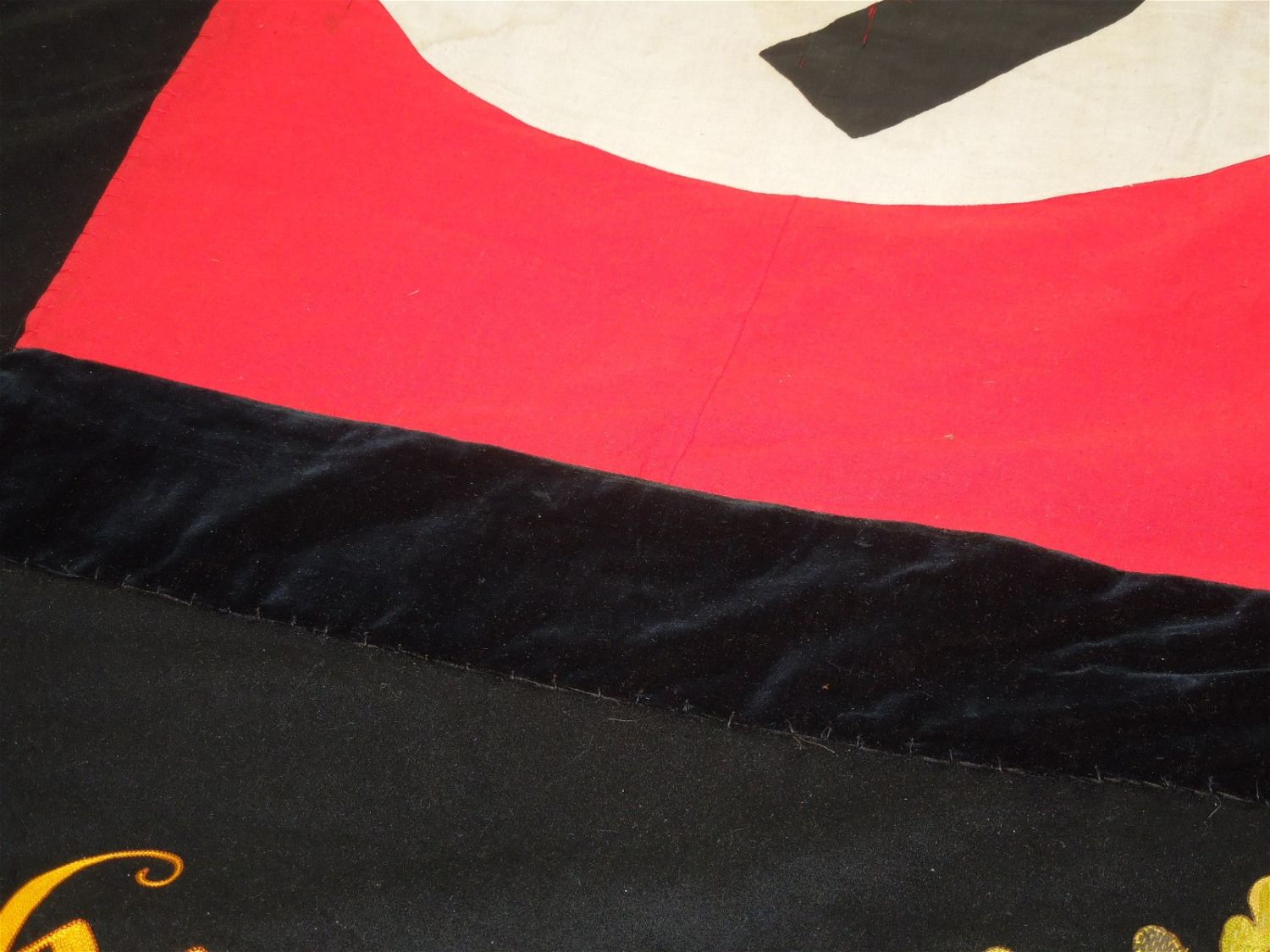 Spectacular Imperial German elaborate bullion embroidered official, decorative trestle table cover of the Bavarian Heavy Cavalry Rider Regiment Prince Carl of Bavaria, dated 1896. In April of 1944 the old Munich city hall was destroyed during a US bombing raid. Brought there for safe keeping, this important artifact was rescued but unfortunately did suffer some burn damage. In a show of defiance and resolve, the mayor of Munich, Karl Fiehler ordered a 40 inch x 26 inch NSDAP flag to be sewn over the damaged portion of the cover in the center which does not affect the art embroidery or wording. This was acquired from a bunker below the old Munich city hall and brought home by a WWII US Army Captain. The Captain sold this piece to a well-known antique gun dealer, who subsequently resold it to an American collector in 1969. It has been in that collection for 54 years until its current offering. Further details: 81 inch x 119 inch black velveteen material with a 1 inch wide gold wire tape perimeter and 2 inch black and yellow/gold fringe. A 8 inch wide yellow-gold stripe with 1 inch wide gold wire borders creates a center panel covering the entire length. One end has a 9 inch x 7 1/4 inch black silk Iron Cross with a silver wire border. When placed on an approximately 27 inch wide trestle table both draped sides exhibit the magnificent art work embroidery. One side has a 20 1/2 inch x 27 inch relief gold bullion/multi-color Bavarian crowned coat-of-arms. Flanking the center piece in 4 1/2" embroidered yellow-gold letters is Vereinigung ehem. Kurassiere u. Schwerer Reiter – d. Rgts. Prinz Graf von Bayern Munchen. The opposite draped side has the same wording which encompasses a 17 1/2 inch x 16 inch colorful shield of the arms of the city of Munich – a lion, the twin tower gate and the Munchen Kidnl. All within oak leaf branches.