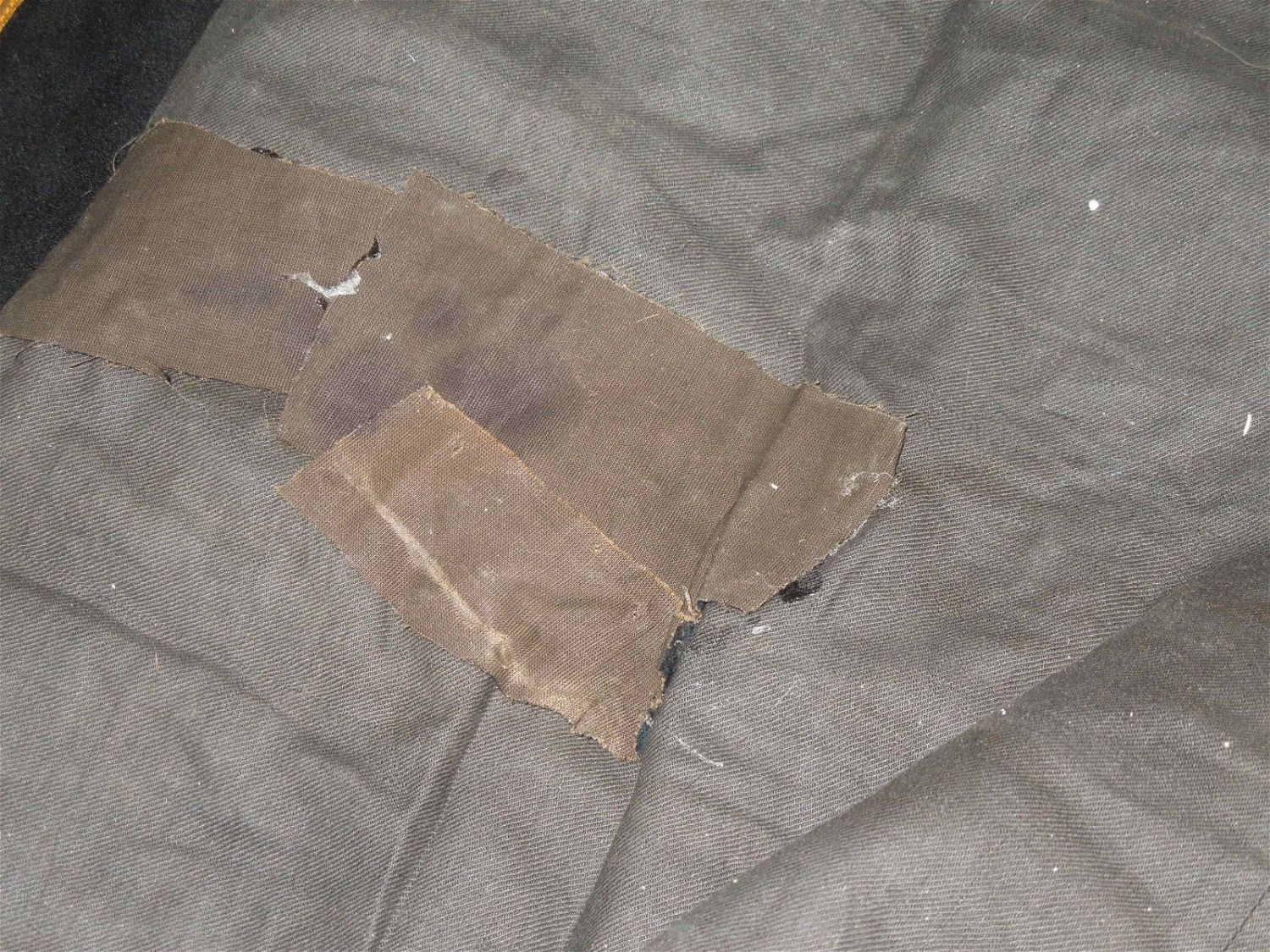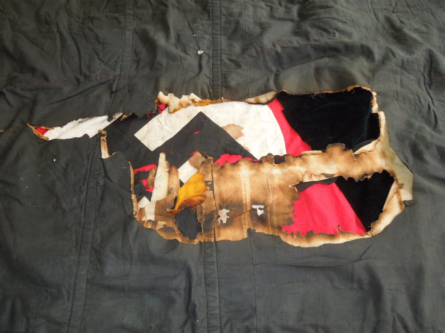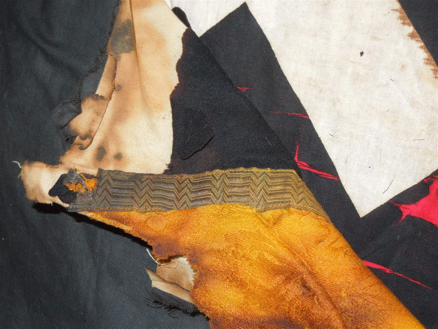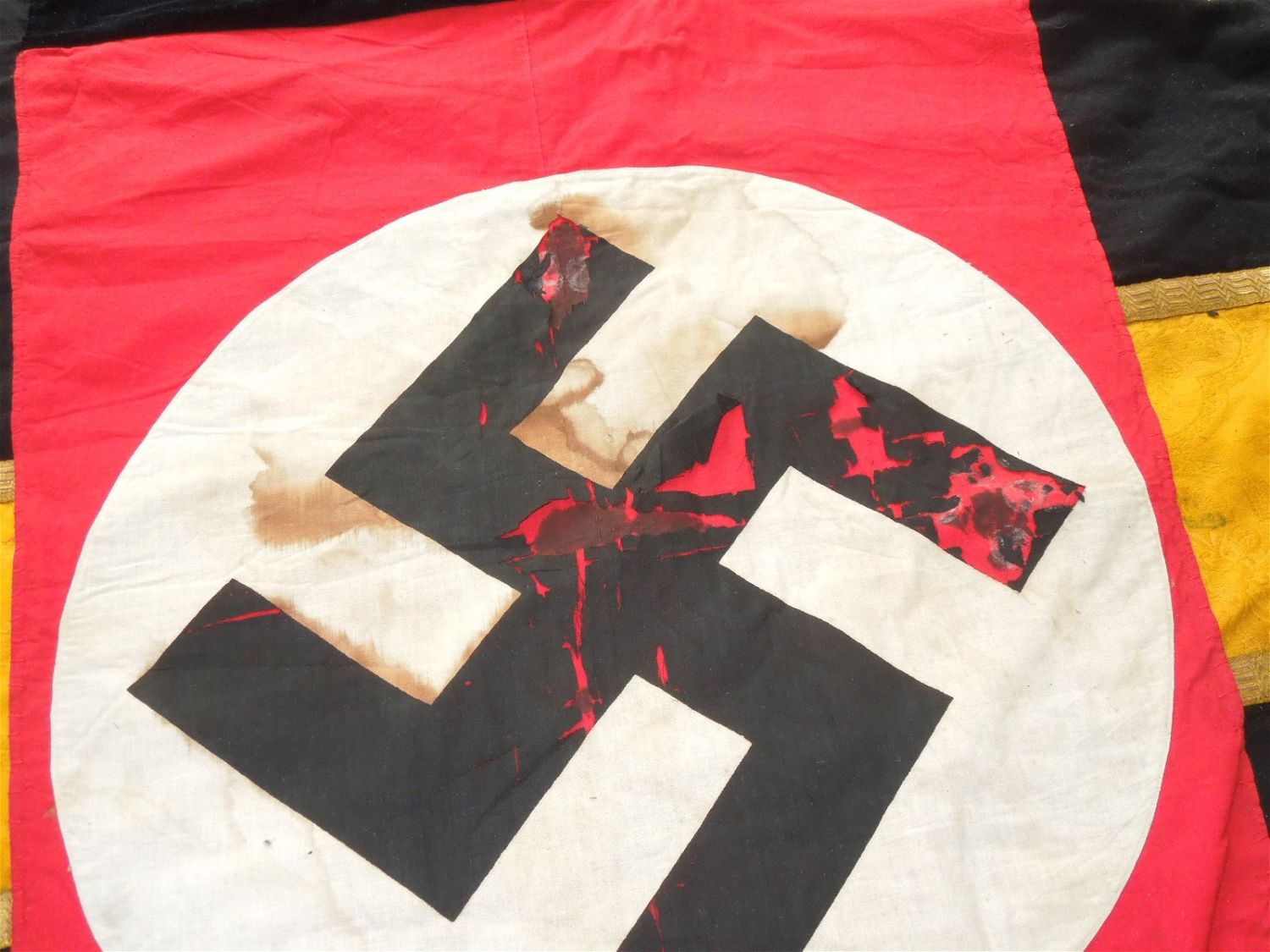 Spectacular Imperial German elaborate bullion embroidered official, decorative trestle table cover of the Bavarian Heavy Cavalry Rider Regiment Prince Carl of Bavaria, dated 1896. In April of 1944 the old Munich city hall was destroyed during a US bombing raid. Brought there for safe keeping, this important artifact was rescued but unfortunately did suffer some burn damage. In a show of defiance and resolve, the mayor of Munich, Karl Fiehler ordered a 40 inch x 26 inch NSDAP flag to be sewn over the damaged portion of the cover in the center which does not affect the art embroidery or wording. This was acquired from a bunker below the old Munich city hall and brought home by a WWII US Army Captain. The Captain sold this piece to a well-known antique gun dealer, who subsequently resold it to an American collector in 1969. It has been in that collection for 54 years until its current offering. Further details: 81 inch x 119 inch black velveteen material with a 1 inch wide gold wire tape perimeter and 2 inch black and yellow/gold fringe. A 8 inch wide yellow-gold stripe with 1 inch wide gold wire borders creates a center panel covering the entire length. One end has a 9 inch x 7 1/4 inch black silk Iron Cross with a silver wire border. When placed on an approximately 27 inch wide trestle table both draped sides exhibit the magnificent art work embroidery. One side has a 20 1/2 inch x 27 inch relief gold bullion/multi-color Bavarian crowned coat-of-arms. Flanking the center piece in 4 1/2" embroidered yellow-gold letters is Vereinigung ehem. Kurassiere u. Schwerer Reiter – d. Rgts. Prinz Graf von Bayern Munchen. The opposite draped side has the same wording which encompasses a 17 1/2 inch x 16 inch colorful shield of the arms of the city of Munich – a lion, the twin tower gate and the Munchen Kidnl. All within oak leaf branches.