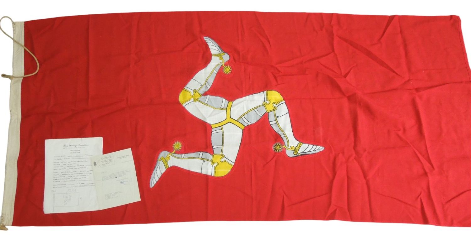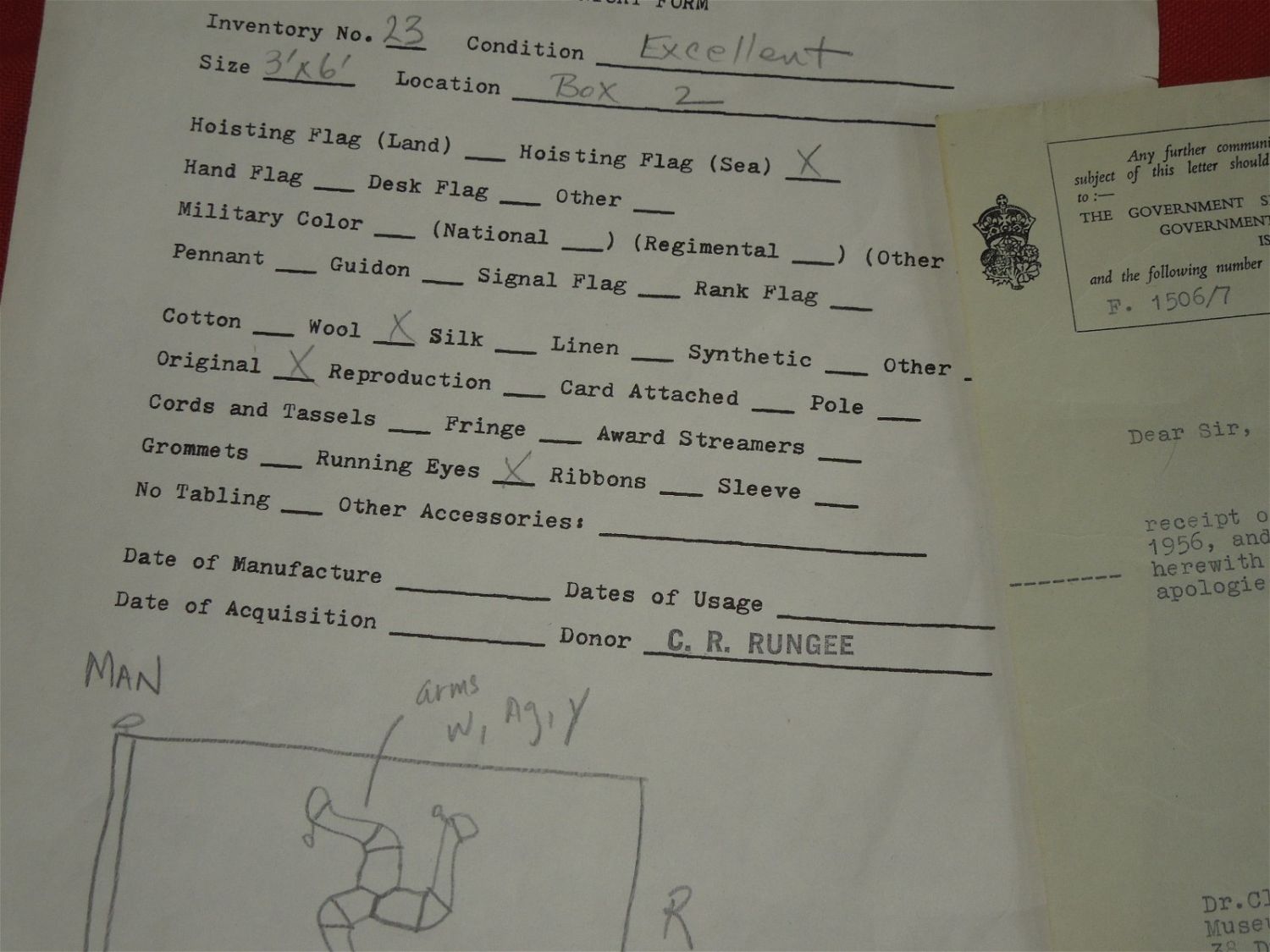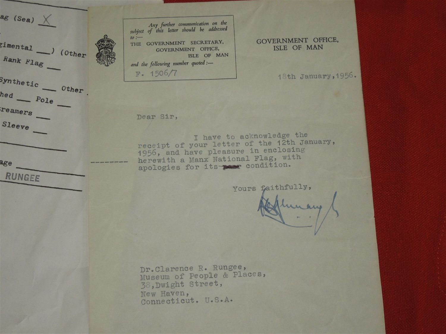 Original flag measuring 3×6 feet sent from the Government Secretary of the Isle of Man in 1956 to Dr. Clarence Rungee for his International flag museum. Good condition. With original letter.