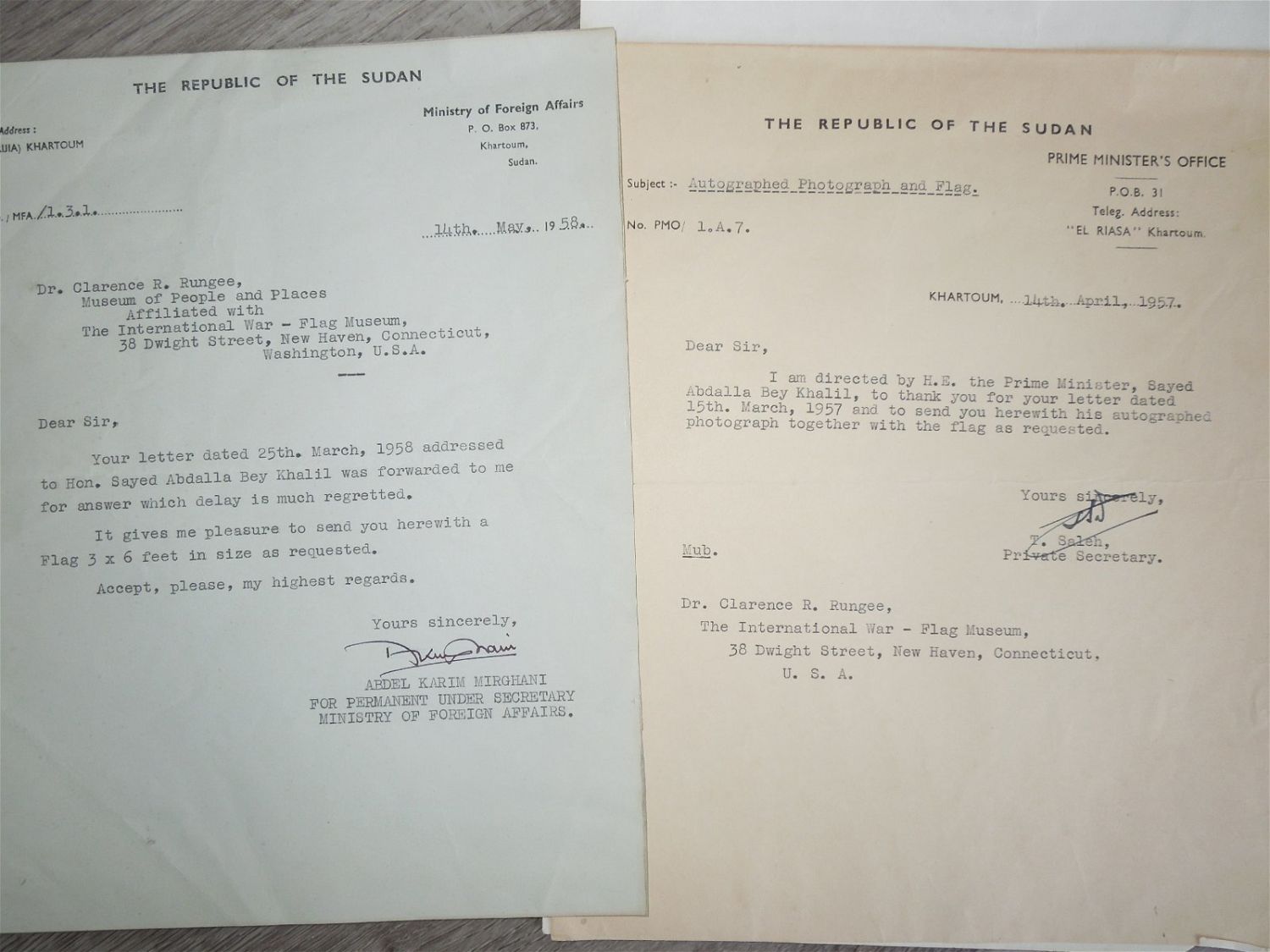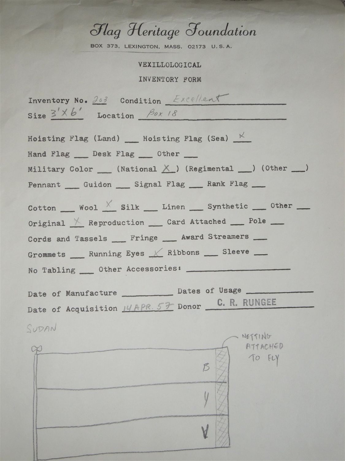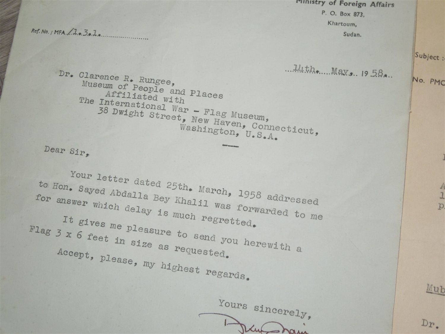 Original flag measuring 3×6 feet inches sent from the government of Sudan to Dr. Clarence Rungee for his International flag museum. Good condition. Comes with two letters and an inventory sheet.