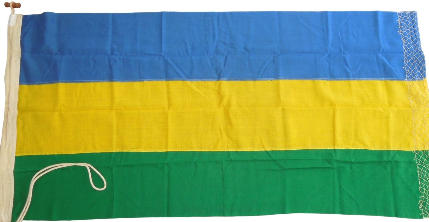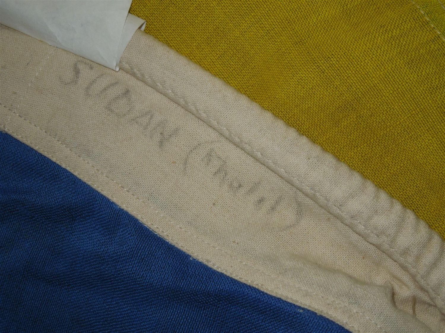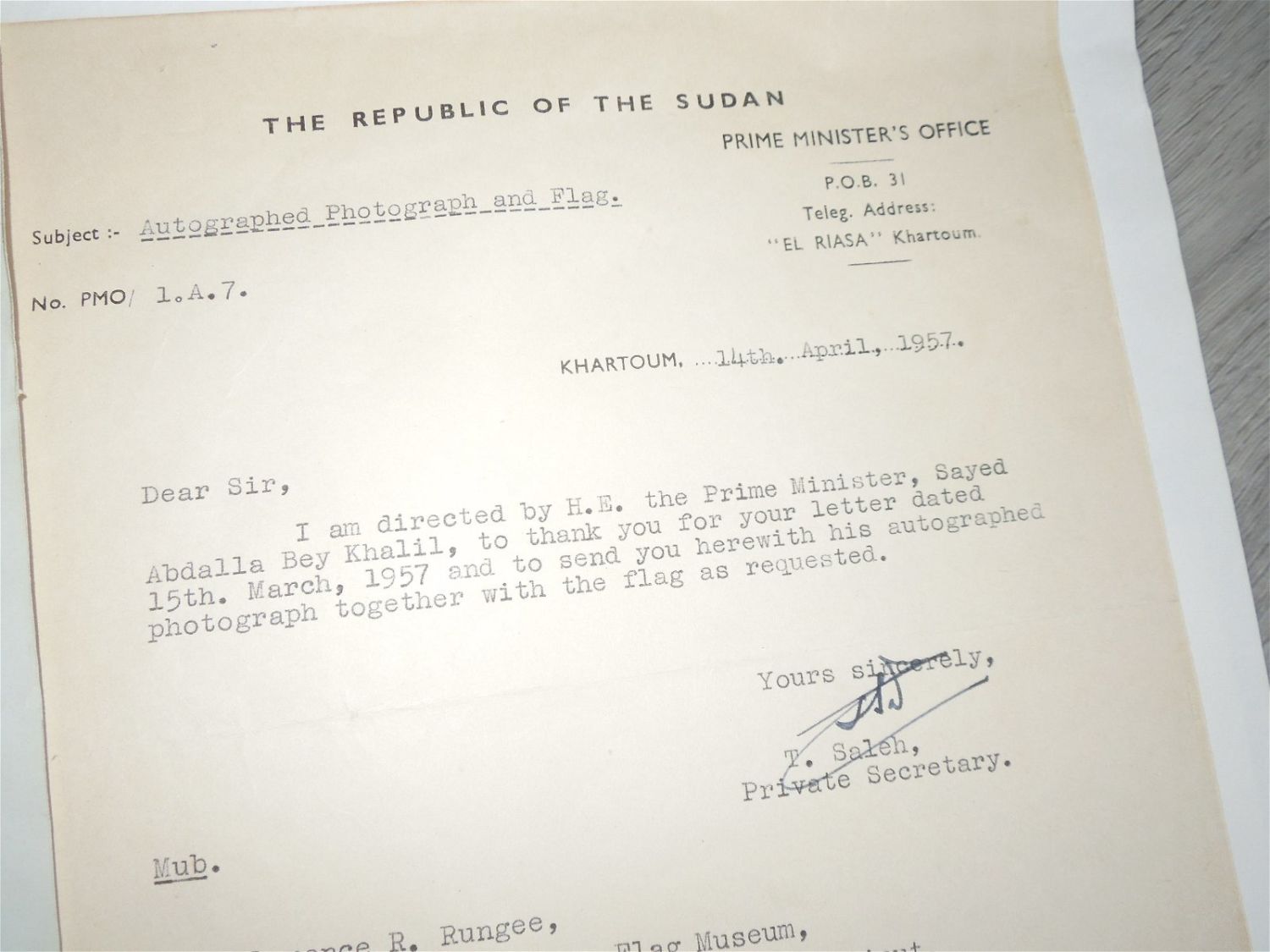 Original flag measuring 3×6 feet inches sent from the government of Sudan to Dr. Clarence Rungee for his International flag museum. Good condition. Comes with two letters and an inventory sheet.