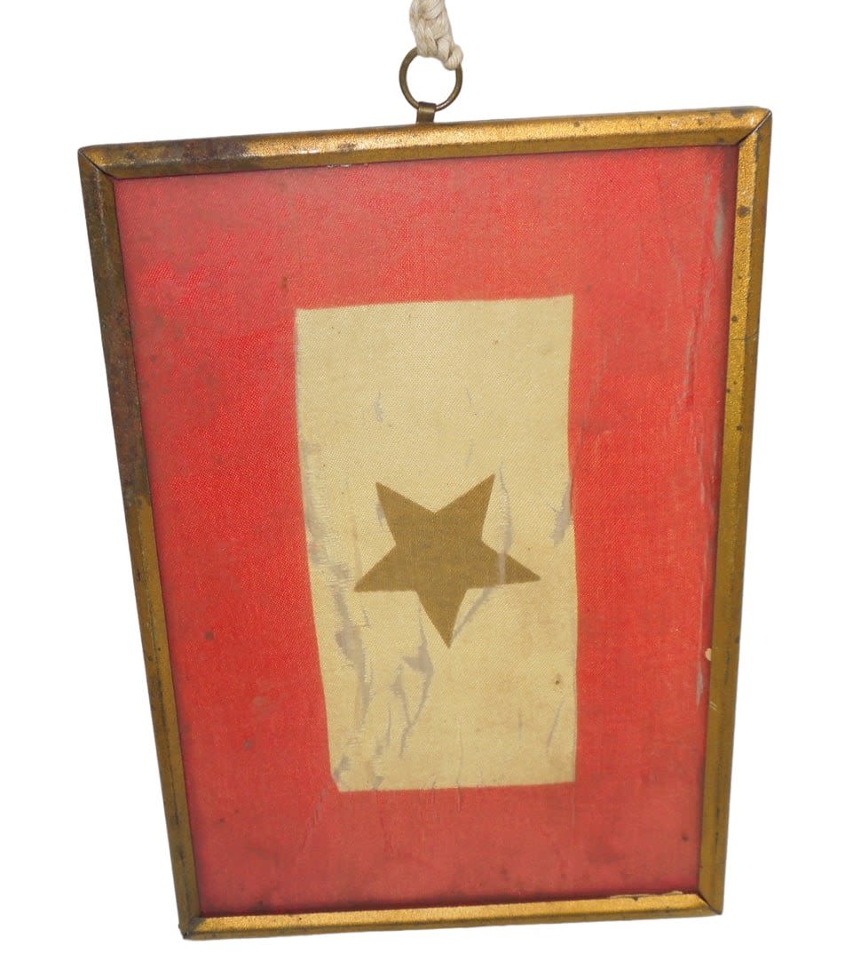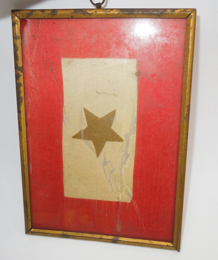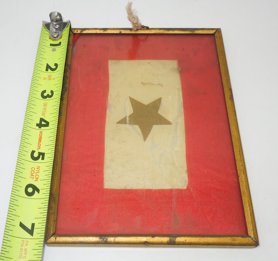 Original flag under glass on both sides. Fair condition with some tearing and rust to the frame. Scale shown for size reference.