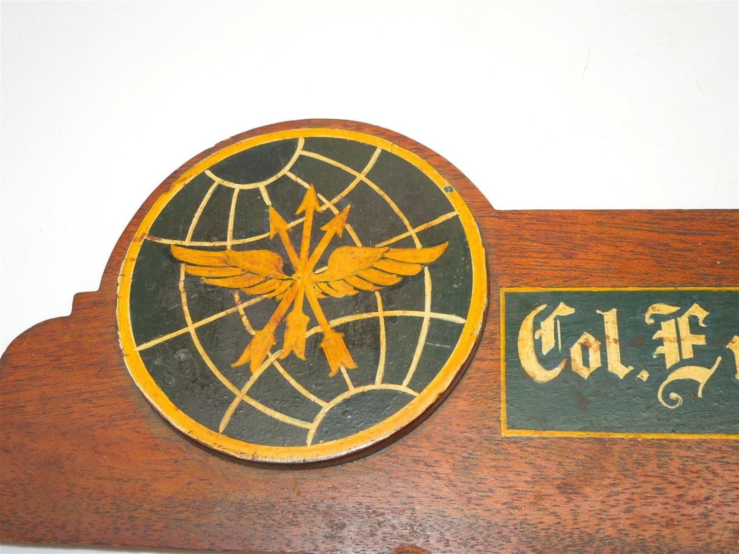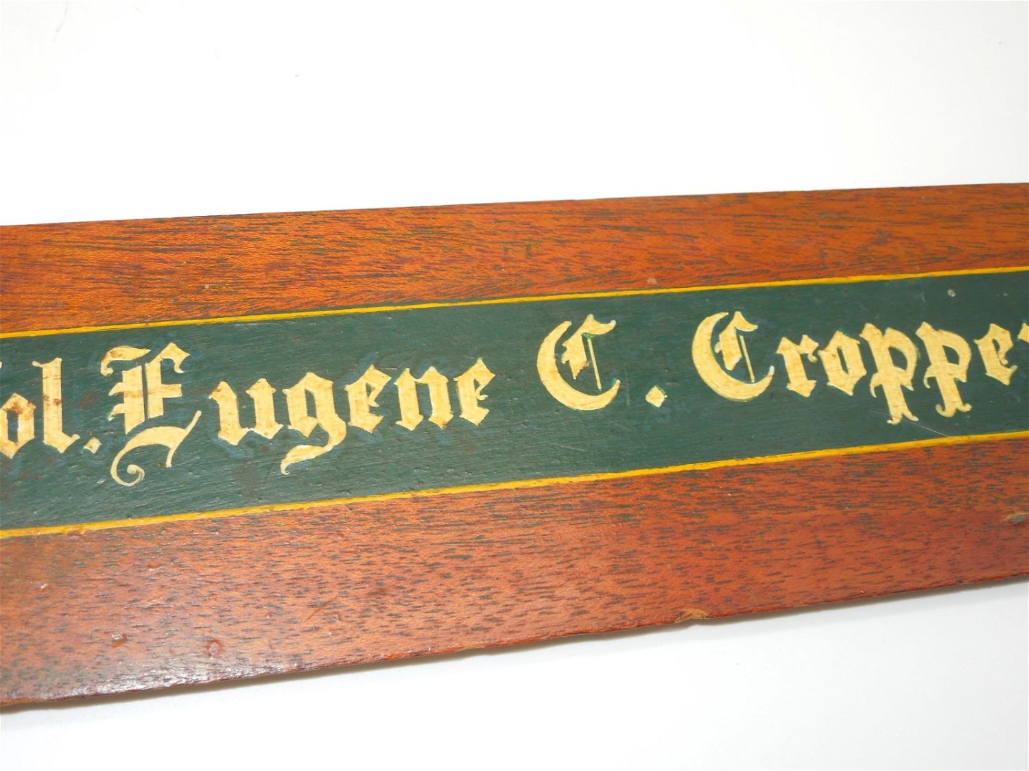 Original wooden name plate, painted with Colonel Eugene C. Cropper, and a Military Air Transport Service logo. He served in Europe for over two years during WWII, and earned a Bronze Star.