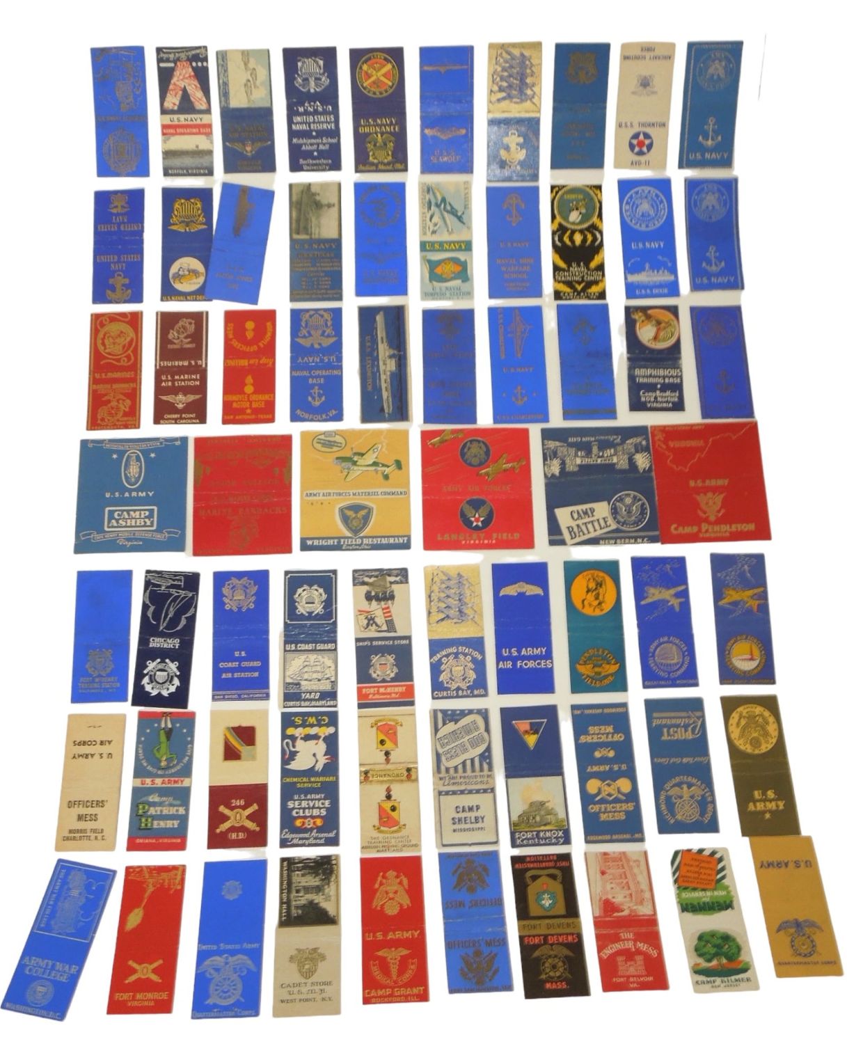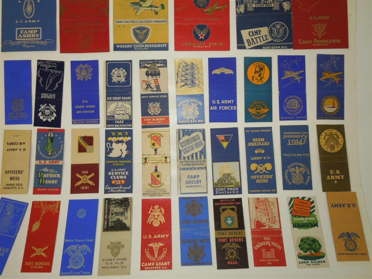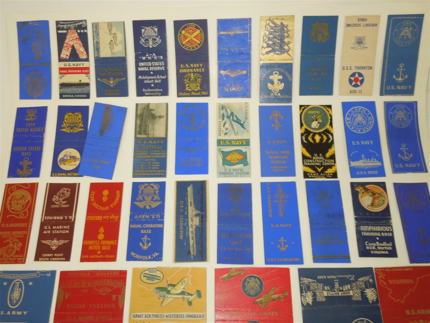 WWII Era Army, Navy, Air Force, Marines, Coast Guard Matchbook Covers Display Board. Matchbook Covers as shown. You will receive 66 matchbook covers as shown. Each cover is glue (old glue) to a backing. At this moment most pieces are glued to this backing, but it is possible that some more may also come detached during shipping.
