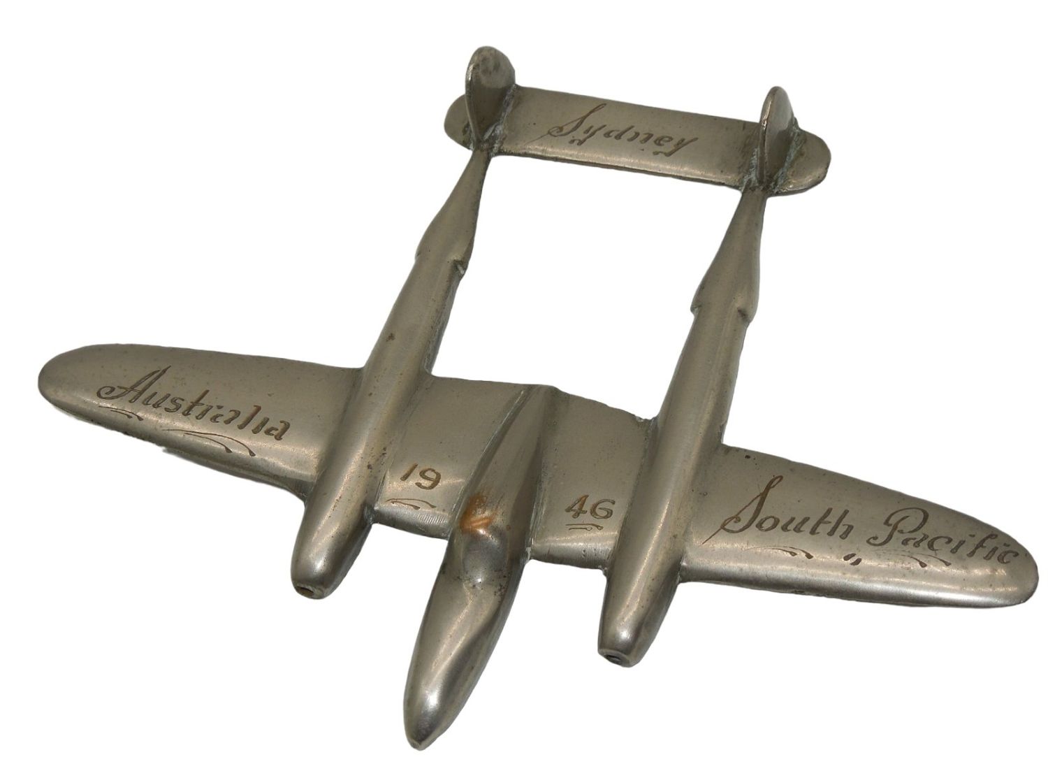 Lockheed P-38 Lightning Fighter Aircraft. Engraved: 1946 Sydney, Australia South Pacific. Approximate size is 6.5 x 5 inches. Good condition for its age.