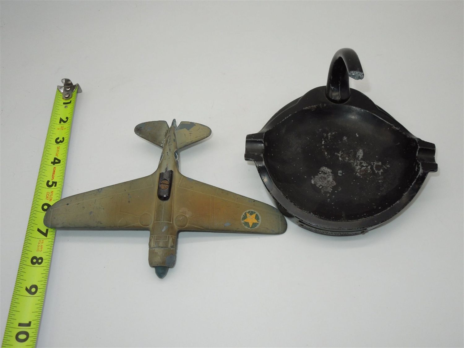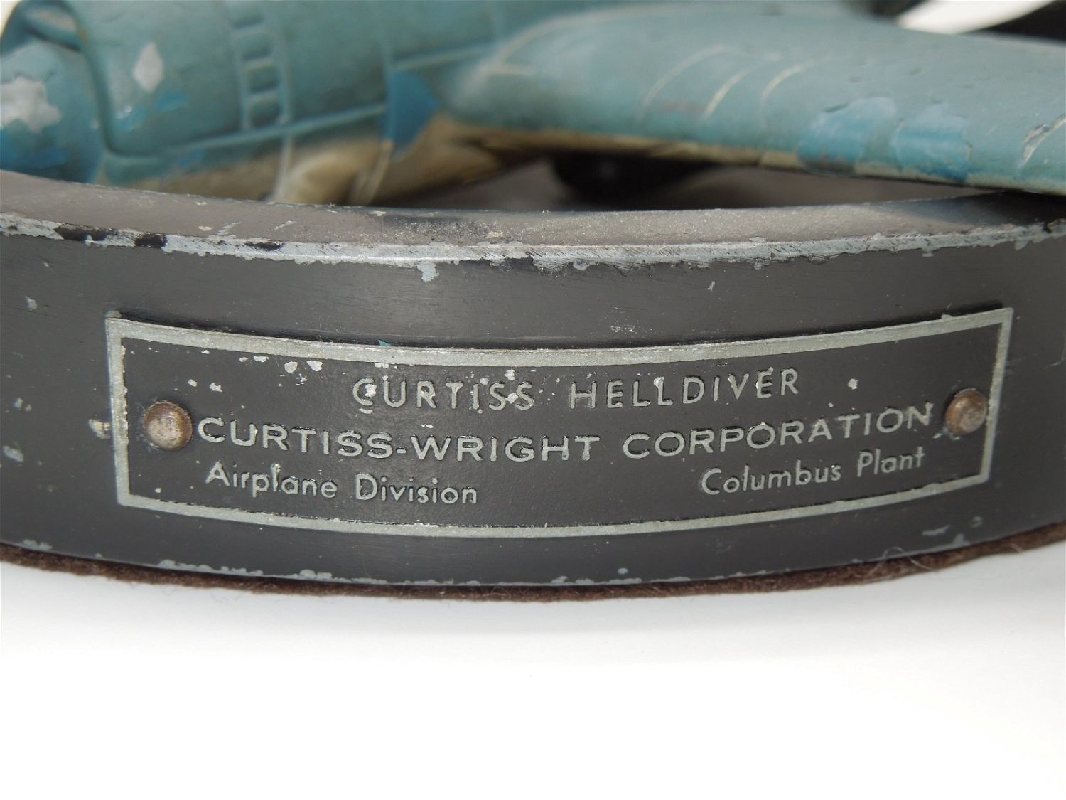 Curtiss SB2C Helldiver Dive Bomber Airplane Aircraft & Ashtray. The tag on the ashtray reads, “Curtiss Helldiver Curtiss-Wright Corporation Airplane Division Columbus Plant”. This aircraft is broken from its display. It could be fixed due to it being screwed in the broken piece and the metal construction. Airplane size is 6.25 inches.