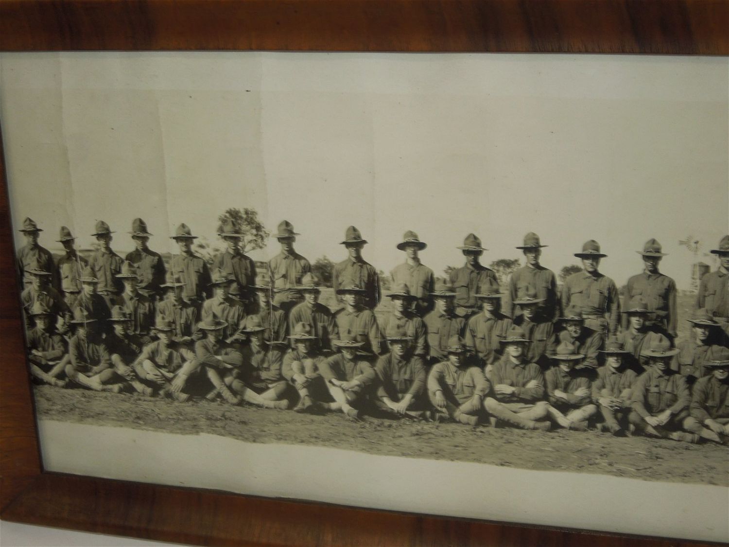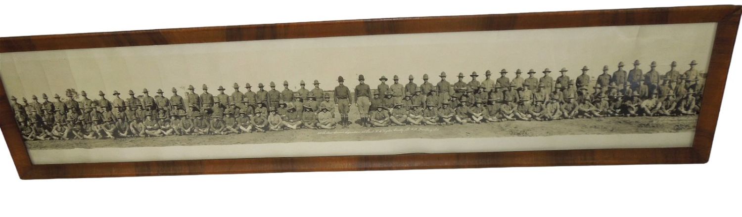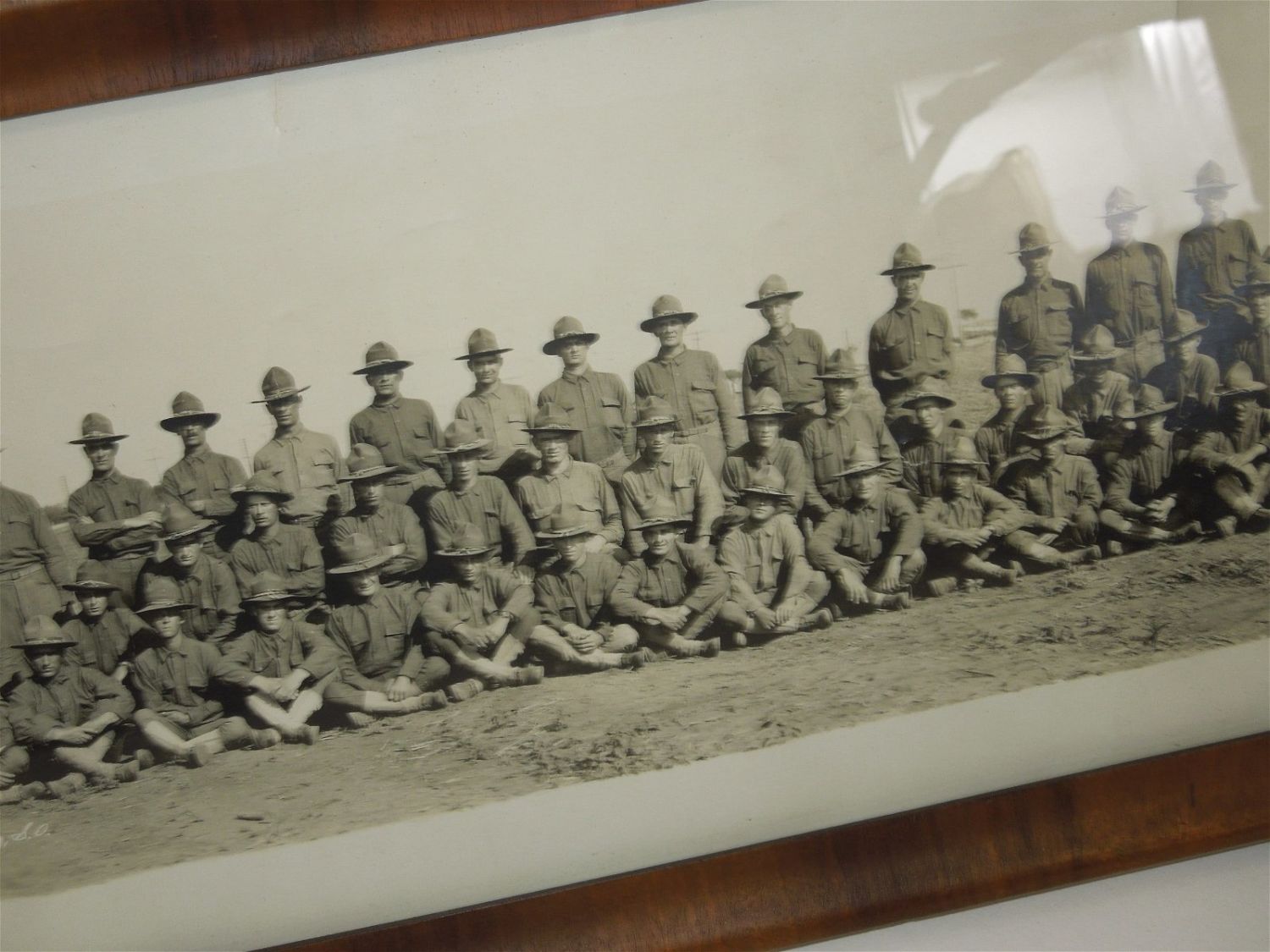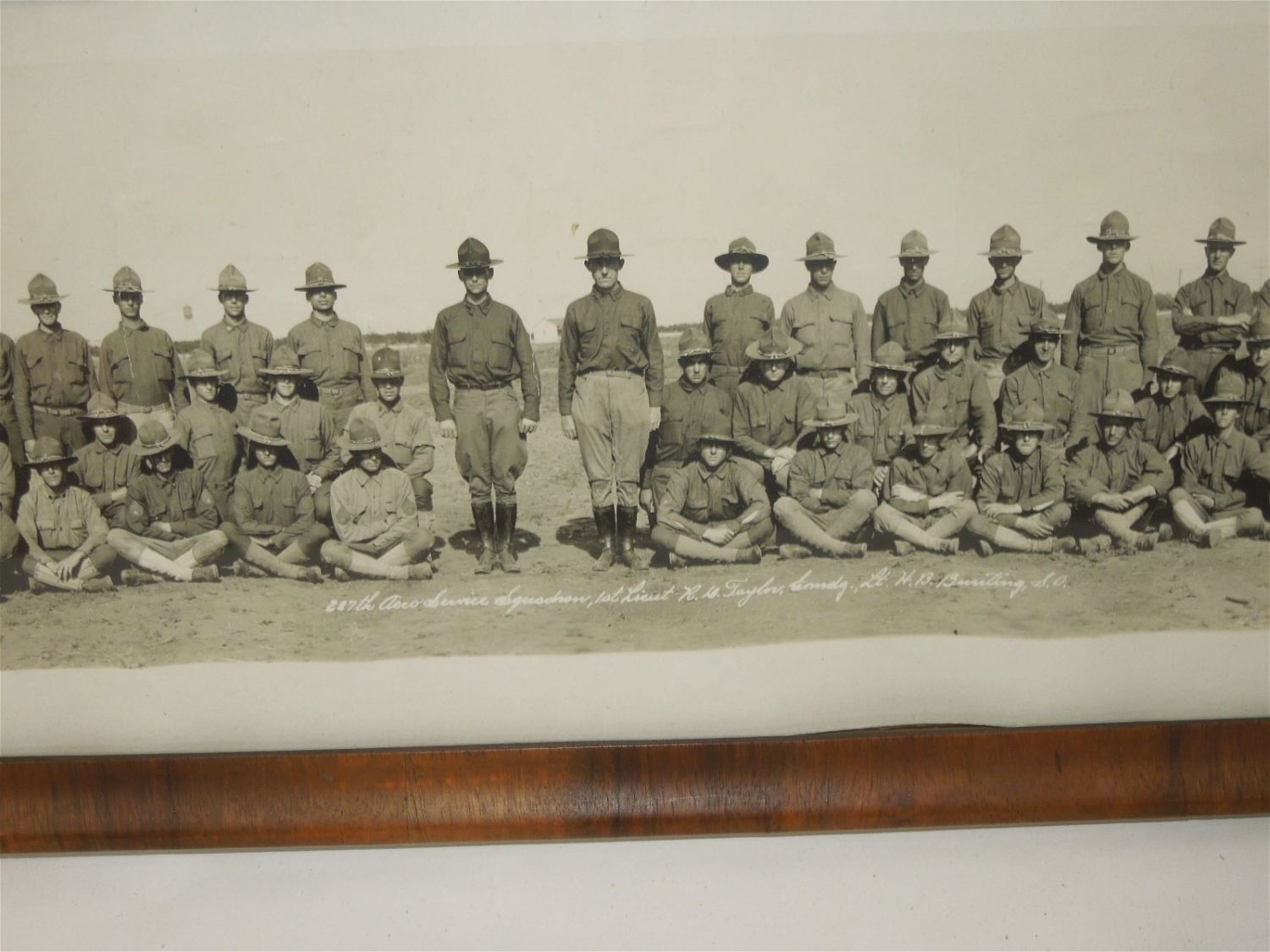 WWI Era Army 287th Aero Service Squadron Framed Unit Photo. Information from the internet: Service Squadron at Wilbur Wright Field, Ohio, May 1918. Transferred to Chanute Field, Illinois, June 1918 and re-designated "Squadron D", July 1918. Re-designated 287th Aero Squadron and transferred to Aviation General Supply Depot Americus, Georgia, December 1918. Approximate size is 43 x 9.5 inches. Creases throughout the photo.